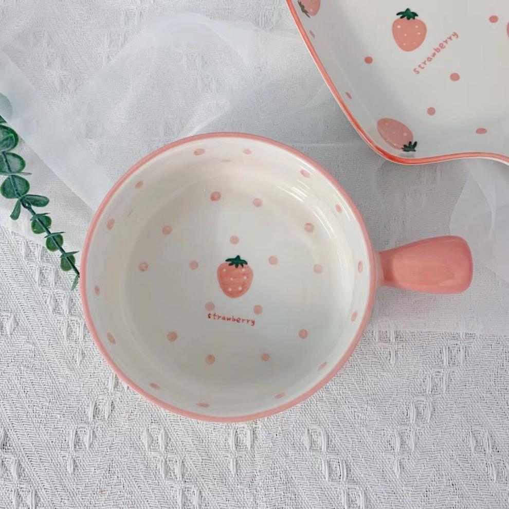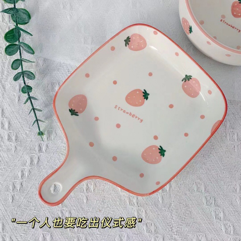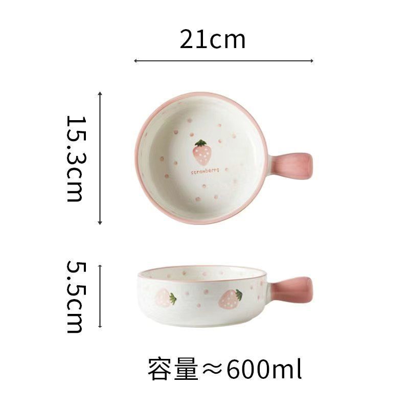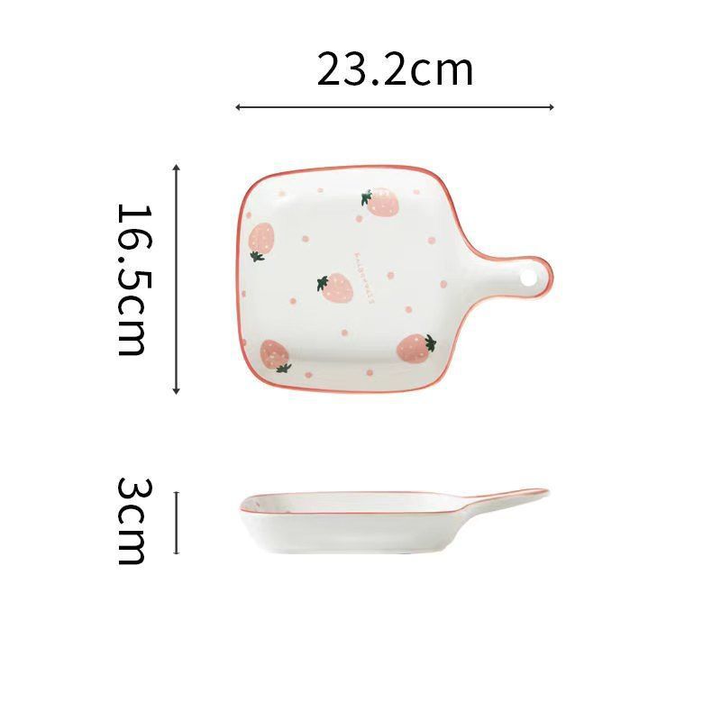 귀여운 접시 베이킹 팬 북유럽 스타일 식기 세라믹 접시 전자 레인지 빨간색 손으로 그린 딸기 손잡이 그릇 + 손잡이 접시