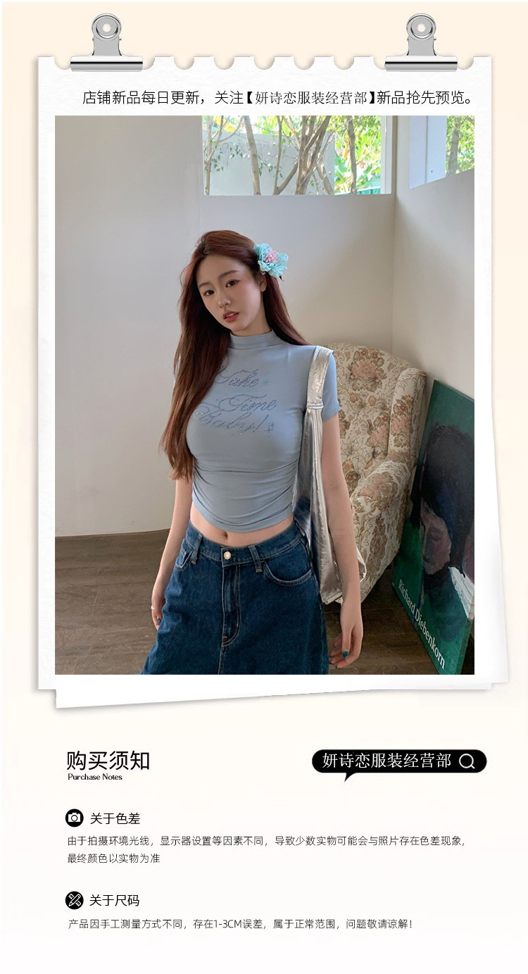 2025년 여름 여성을 위한 핫 다이아몬드 하프 터틀넥 반팔 티셔츠 디자인, 새로운 다용도 짧은 슬림핏 탑 트렌디스토어 가기
