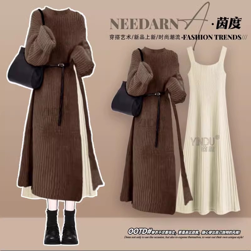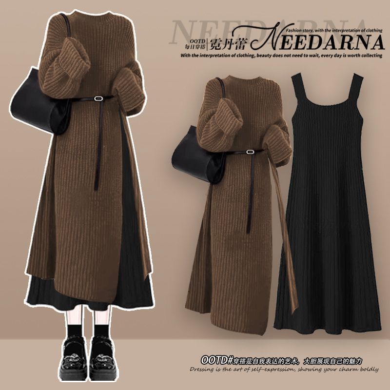 • 브라운 스웨터 스커트 + 블랙 니트 드레스 투피스 세트