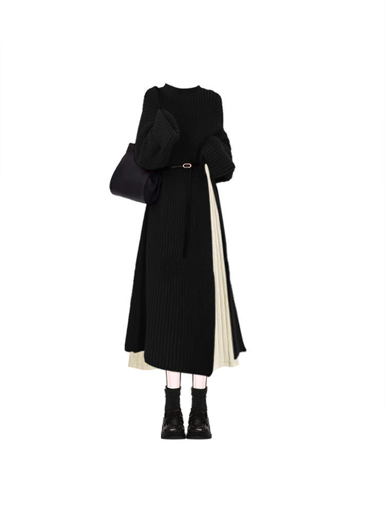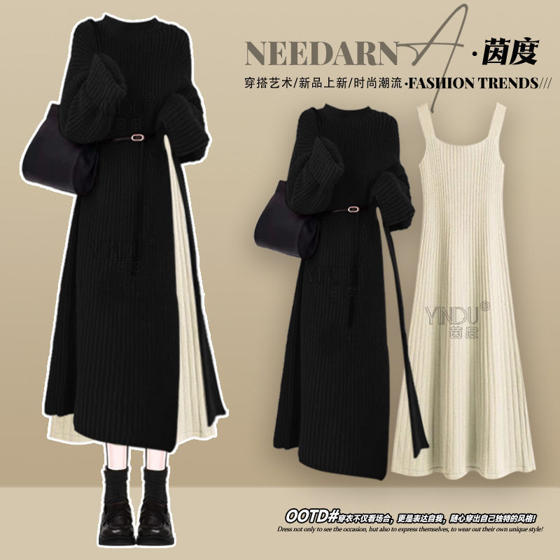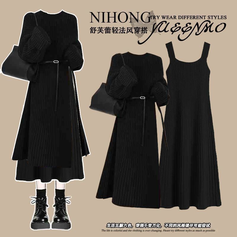 • 살구 스웨터 스커트 + 블랙 니트 드레스 투피스 세트