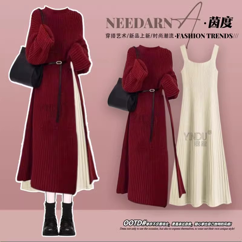 • 레드 스웨터 스커트 + 살구 니트 드레스 투피스 세트