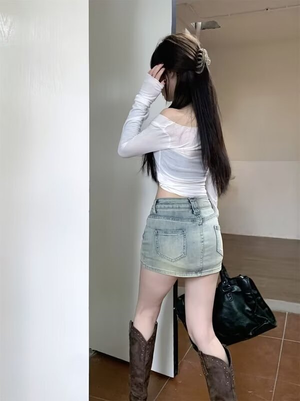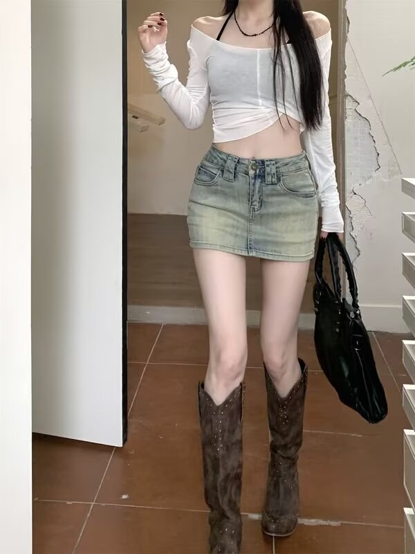 여름 키 작은 핫걸 복고풍 워싱 데님 스커트 여성용 미니 스커트 하이 웨이스트 힙 스커트 노출 방지 스커트스토어 가기
