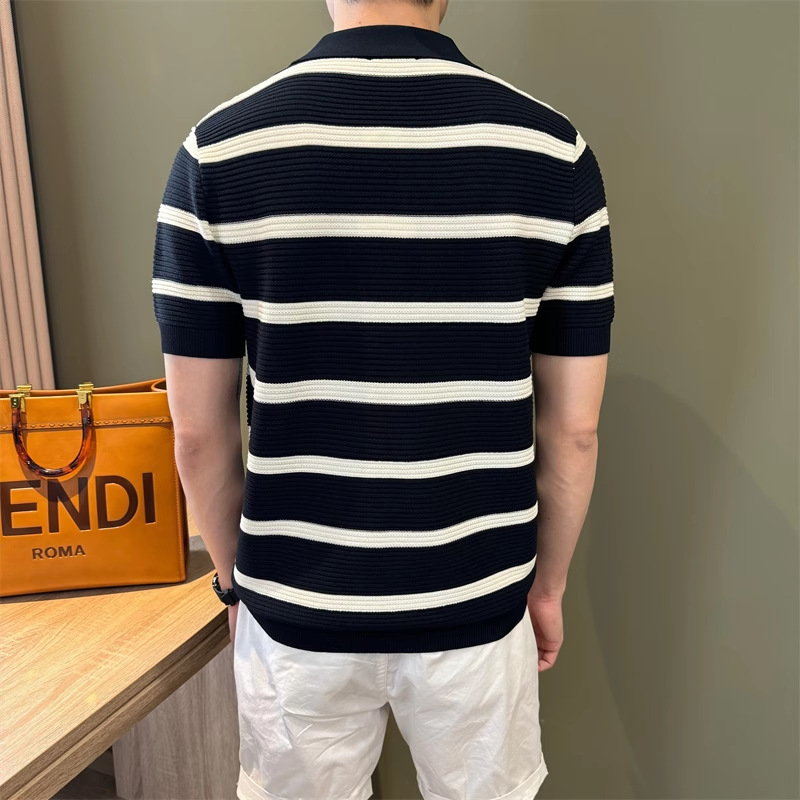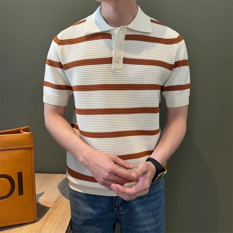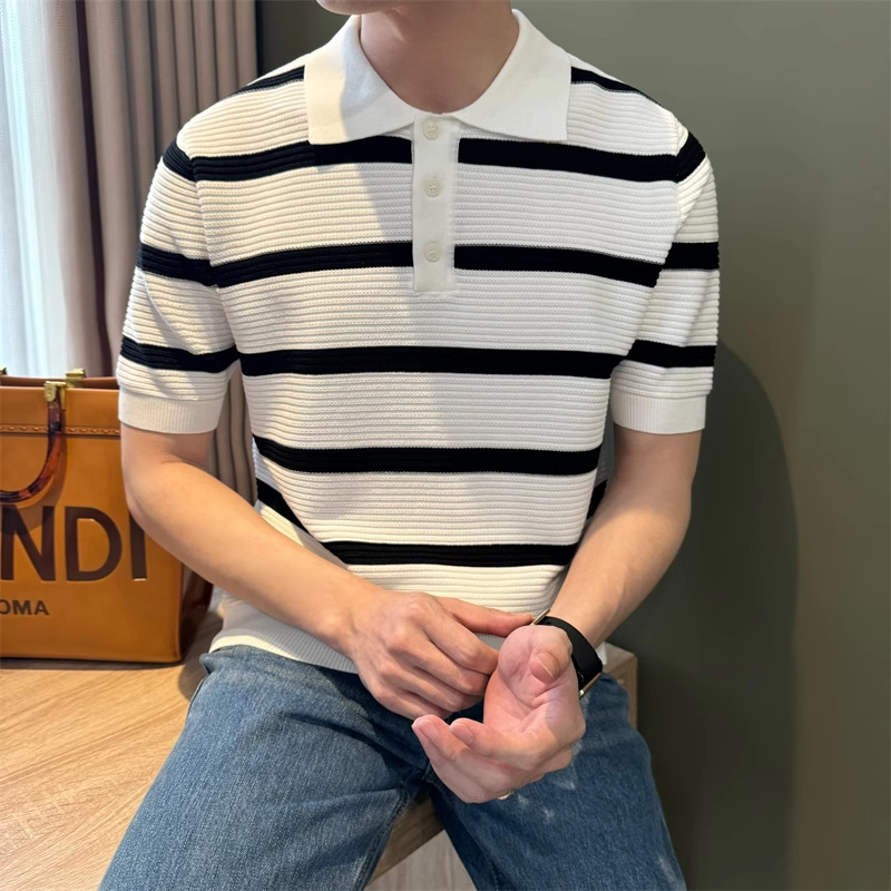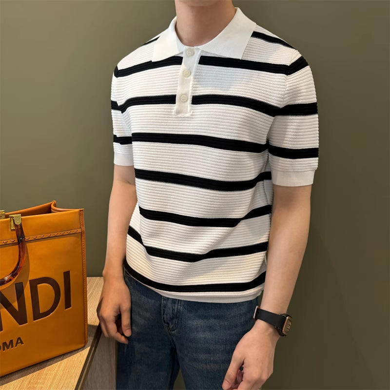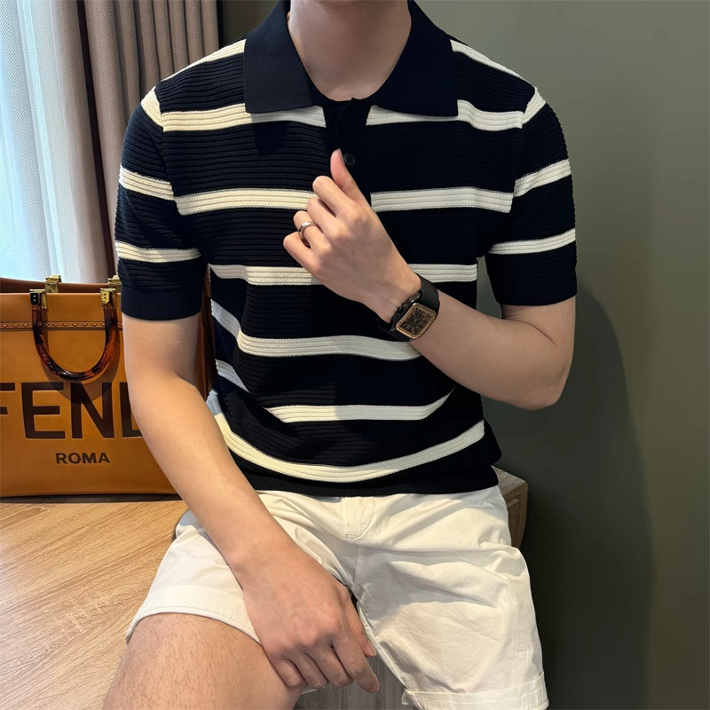 남성용 여름 하이엔드 스트라이프 반팔 폴로 셔츠, 패셔너블하고 다재다능한 슬림 라펠 티셔츠, 트렌디한 비즈니스 핸섬 티셔츠