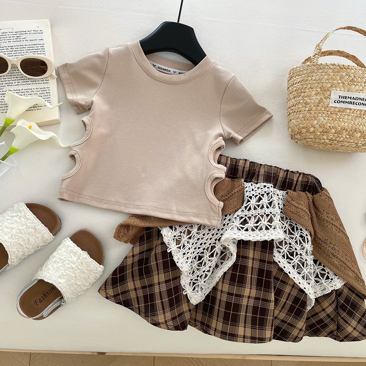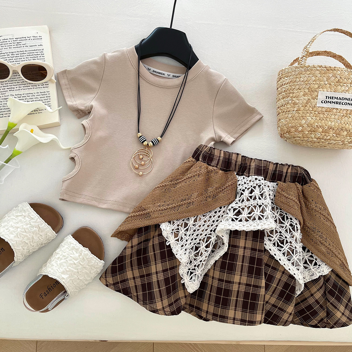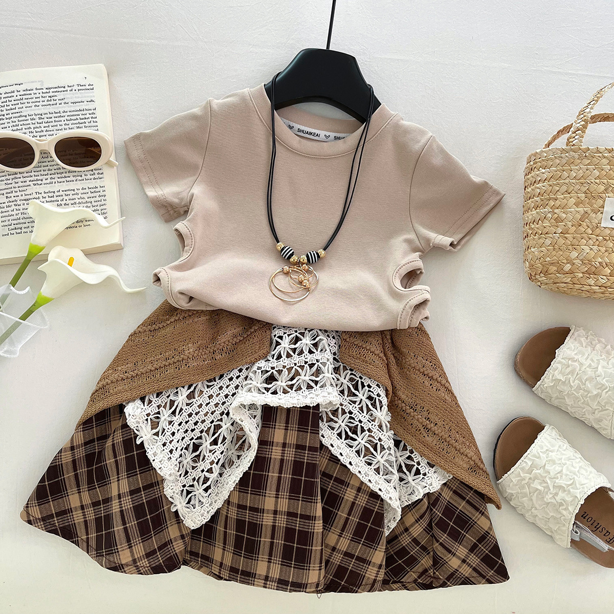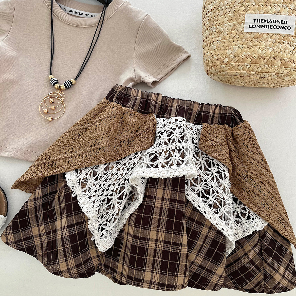 2025 여름 패션 소녀의 새로운 다목적 반팔 스플 라이스 체크 무늬 스커트 정장 유행 민족 스타일스토어 가기