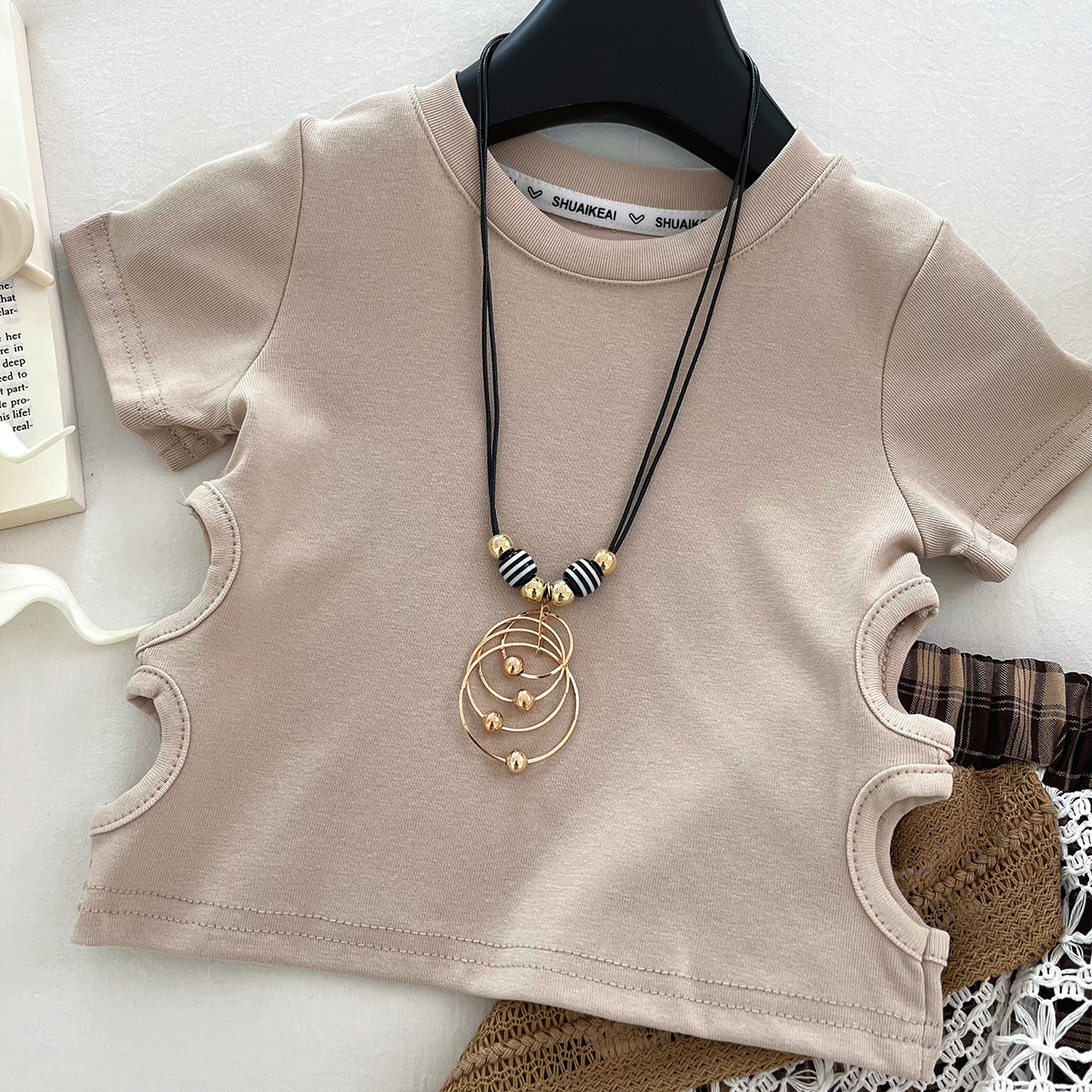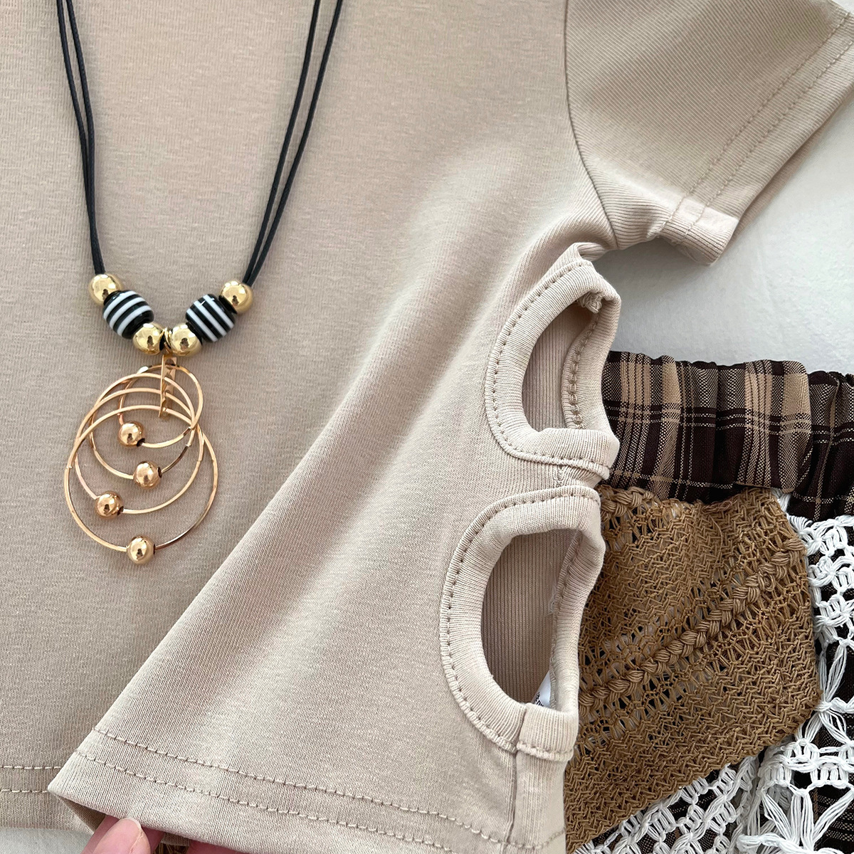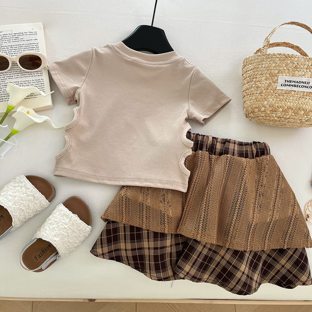 2025 여름 패션 소녀의 새로운 다목적 반팔 스플 라이스 체크 무늬 스커트 정장 유행 민족 스타일