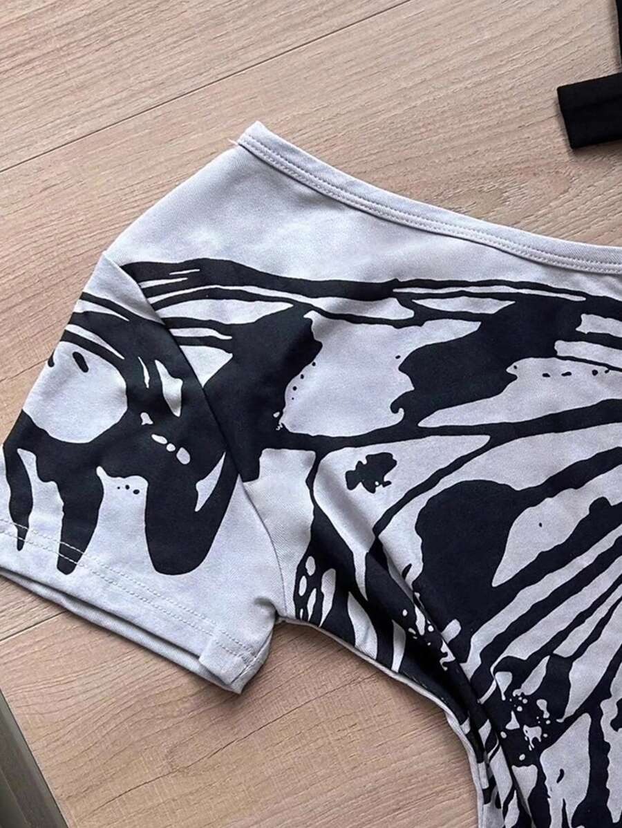 여름 미국 스트리트 스타일 맞춤형 슬림 디자인 오프 숄더 슬래시 넥 짧은 다크 추상 프린트 풀오버 조끼