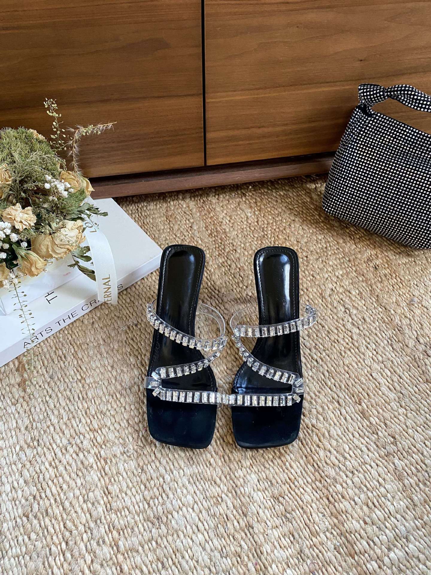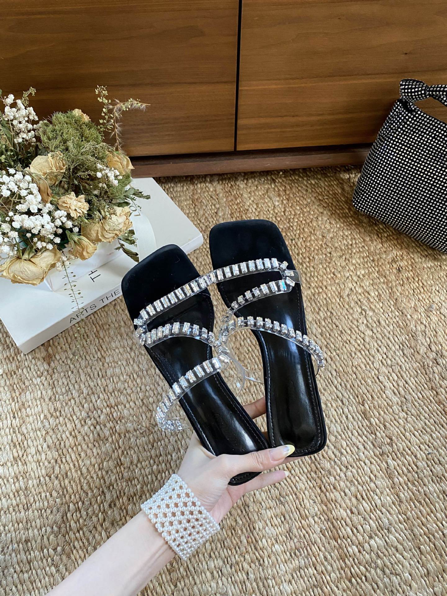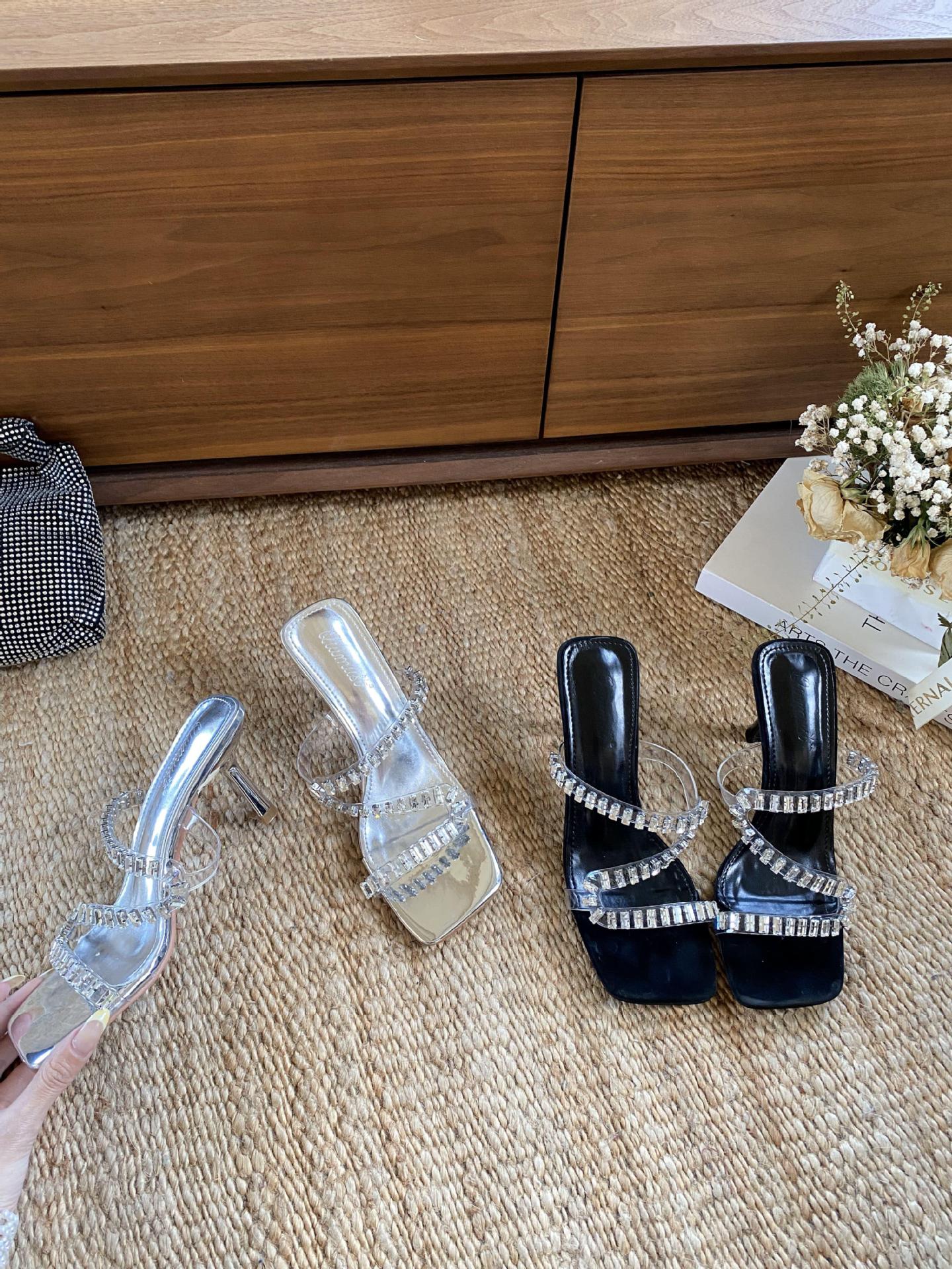 2025 여름 새로운 오픈 발가락 하이힐 여성 신발 다이아몬드 투명 벨트 패션 중공 두꺼운 발 뒤꿈치 여성 샌들