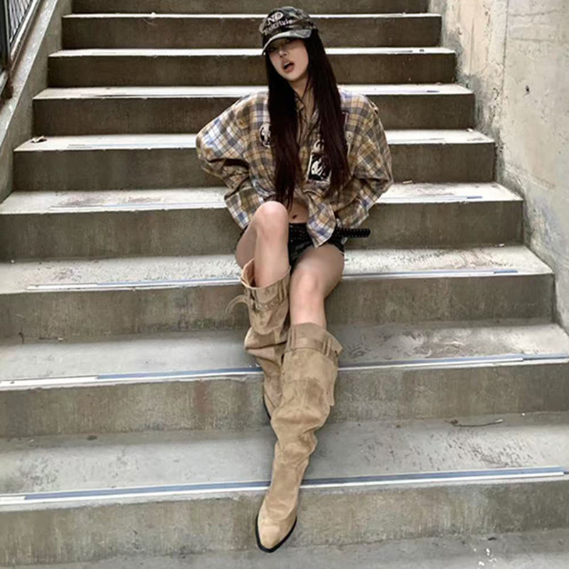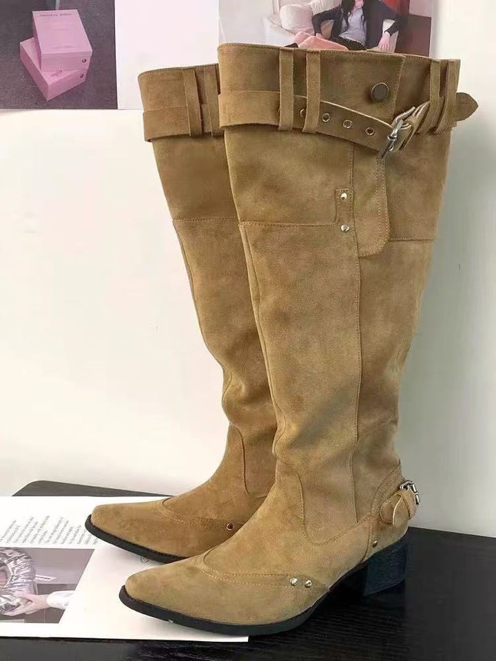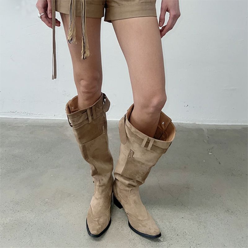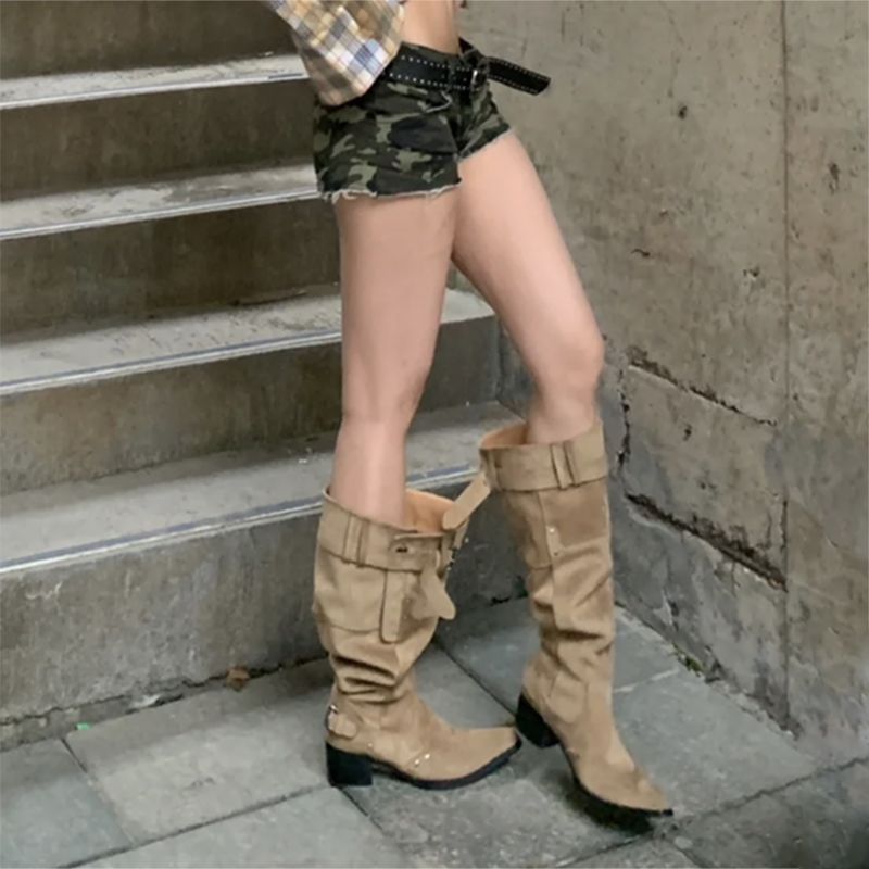 여성용 빅 튜브 스택 부츠, 포인티드 토 롱 튜브 부츠, 2025 여름 얇은 두꺼운 굽 벨트 버클 스트리트 패션 부츠