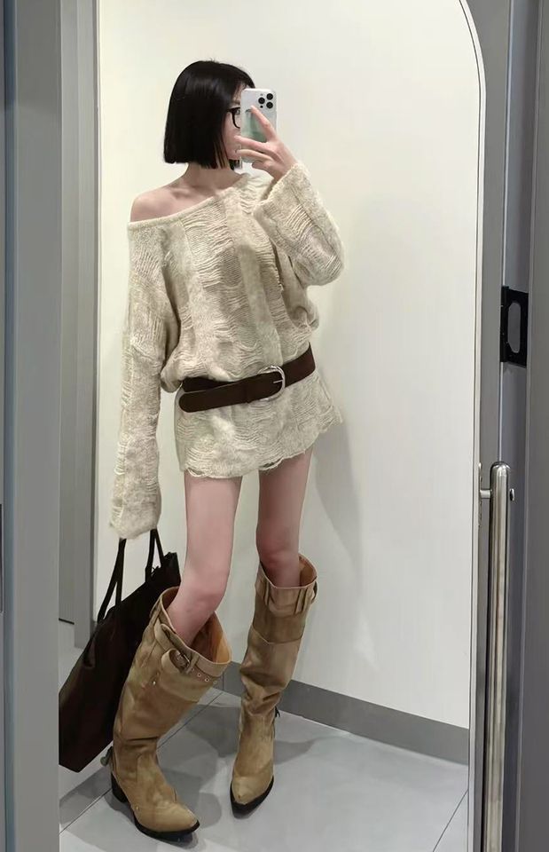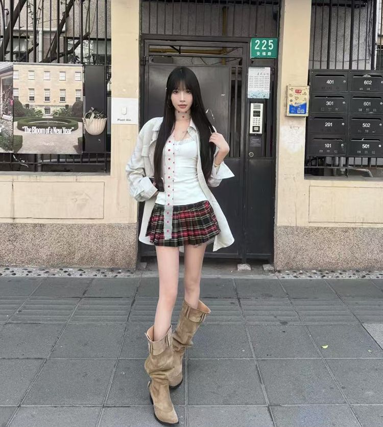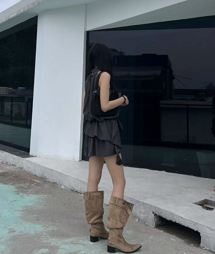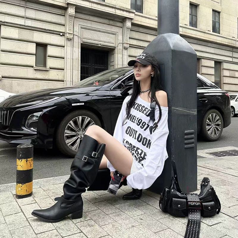여성용 빅 튜브 스택 부츠, 포인티드 토 롱 튜브 부츠, 2025 여름 얇은 두꺼운 굽 벨트 버클 스트리트 패션 부츠스토어 가기