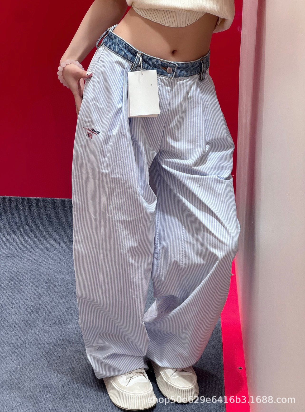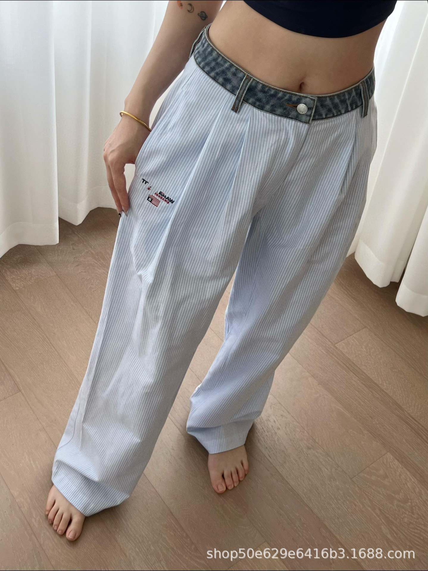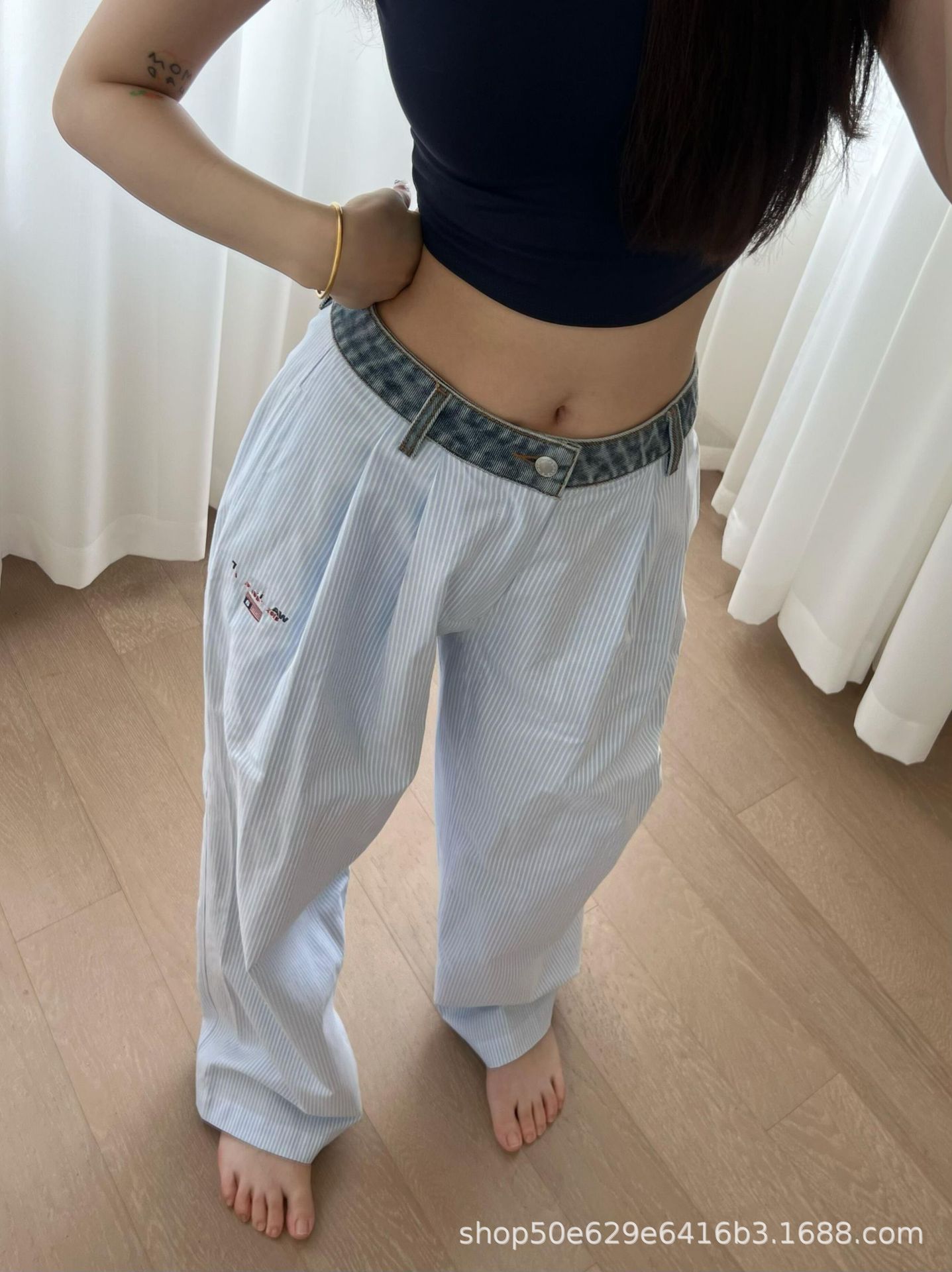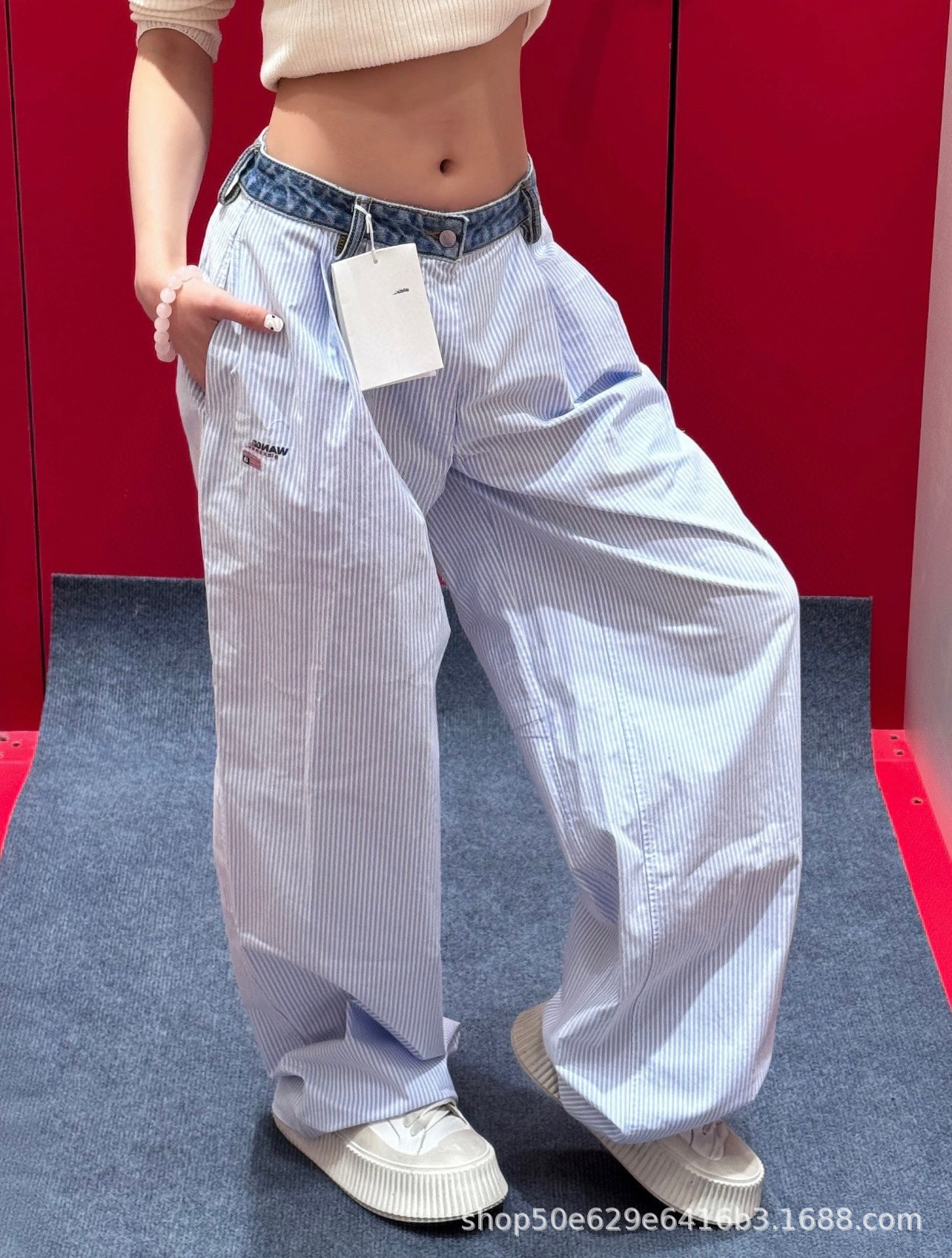 Spot 2025 봄 여름 신작 AW 데님 허리 스트라이프 스플리싱 디자인 루즈 캐주얼 바지 여성 바지스토어 가기