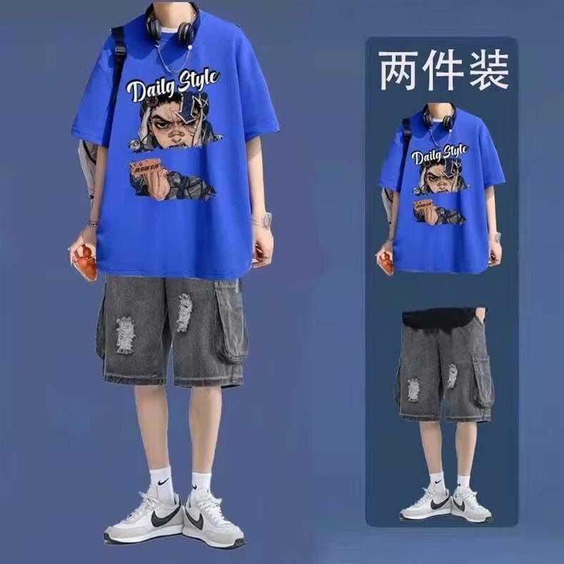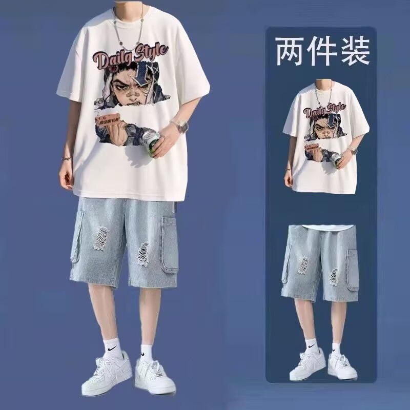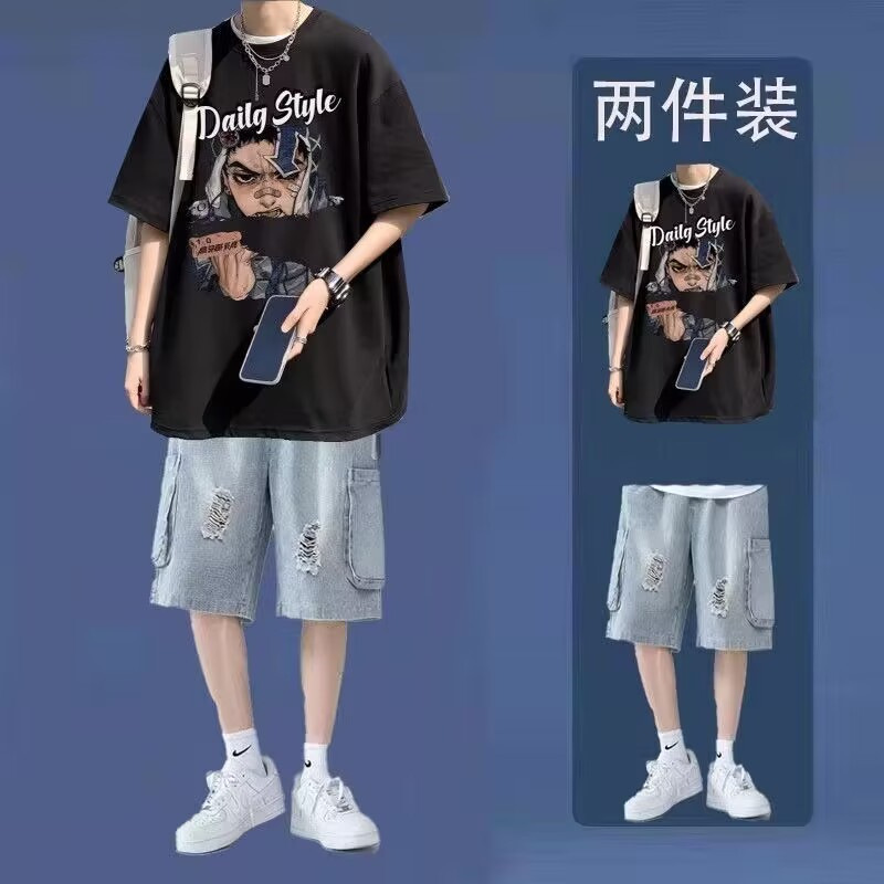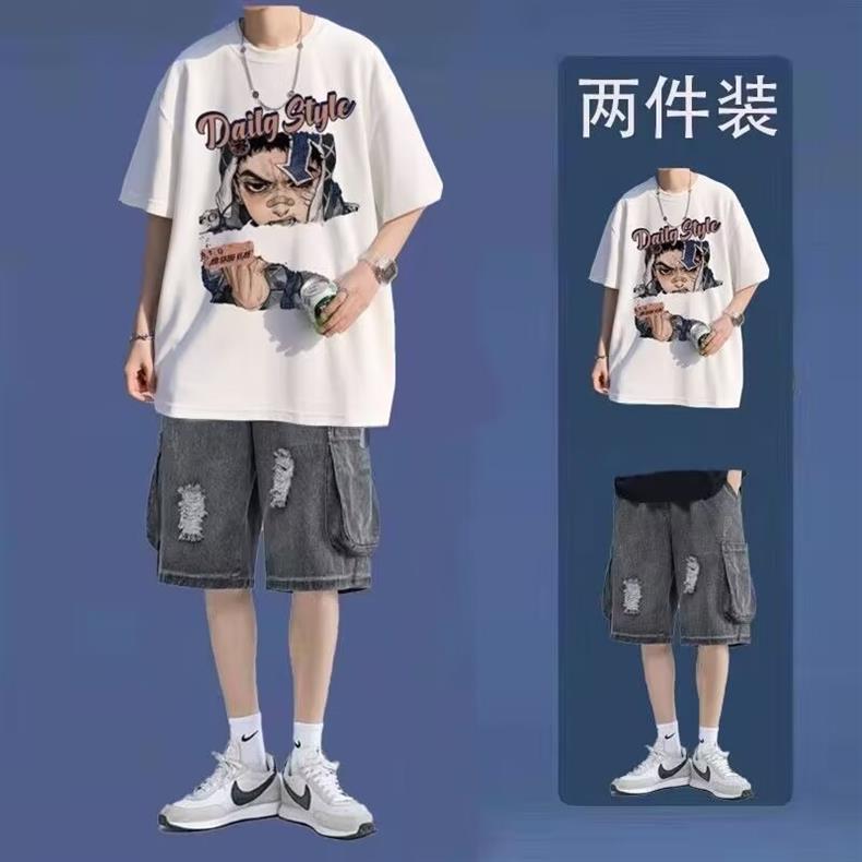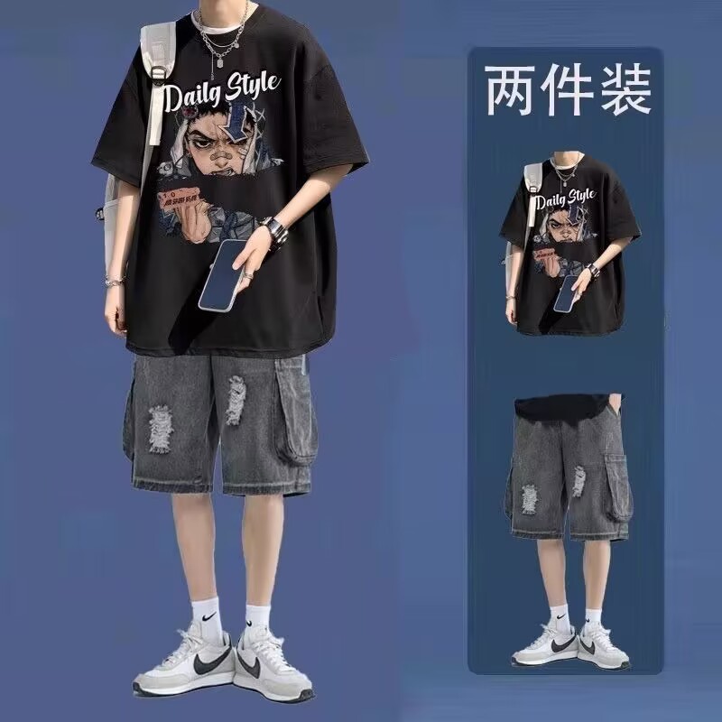십대를 위한 루즈한 반팔 티셔츠 슈트, 트렌디하고 핸섬한 찢어진 데님 반바지, 투피스 세트, 남성 여름 아메리칸 스타일
