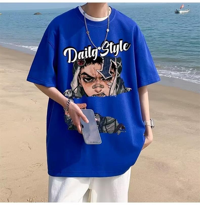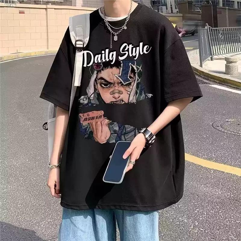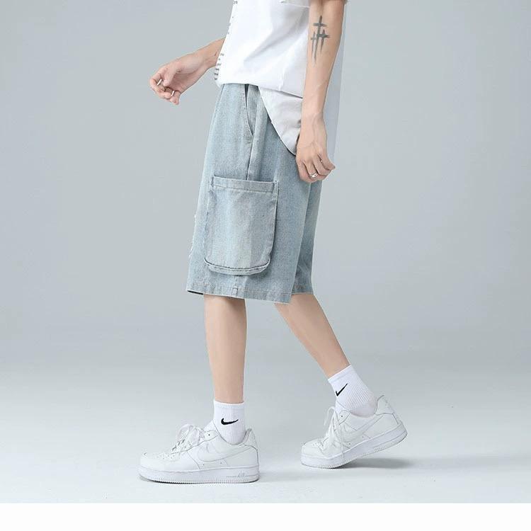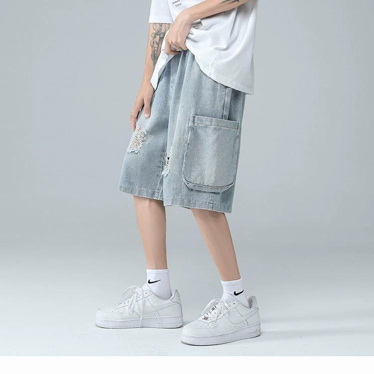 십대를 위한 루즈한 반팔 티셔츠 슈트, 트렌디하고 핸섬한 찢어진 데님 반바지, 투피스 세트, 남성 여름 아메리칸 스타일스토어 가기