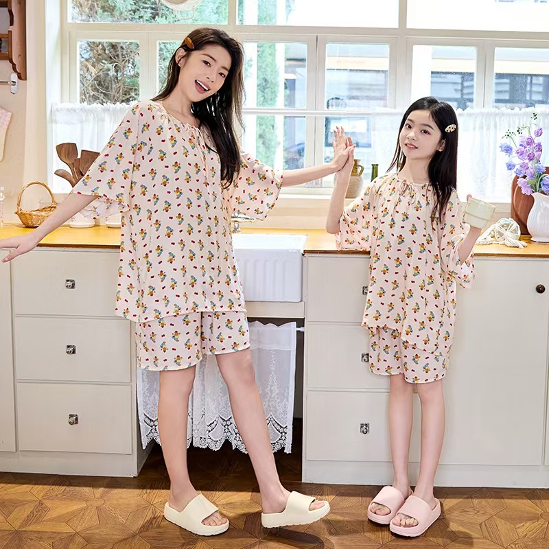 여름 여아용 잠옷, 면 실크 반팔 반바지, 아이스 실크 엄마와 딸 가정복, 아동용 7부 소매 얇은 양복스토어 가기
