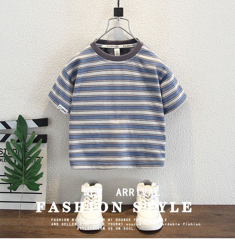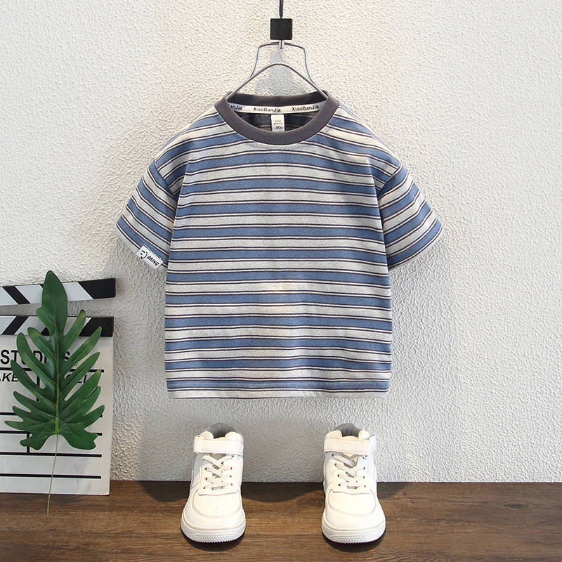 어린이 여름 반팔 2025 새로운 잘 생긴 소년 한국 스타일 스트라이프 티셔츠 베이비 캐주얼 라운드 넥 탑 트렌디 3스토어 가기