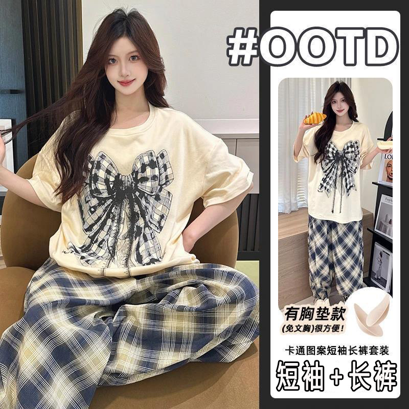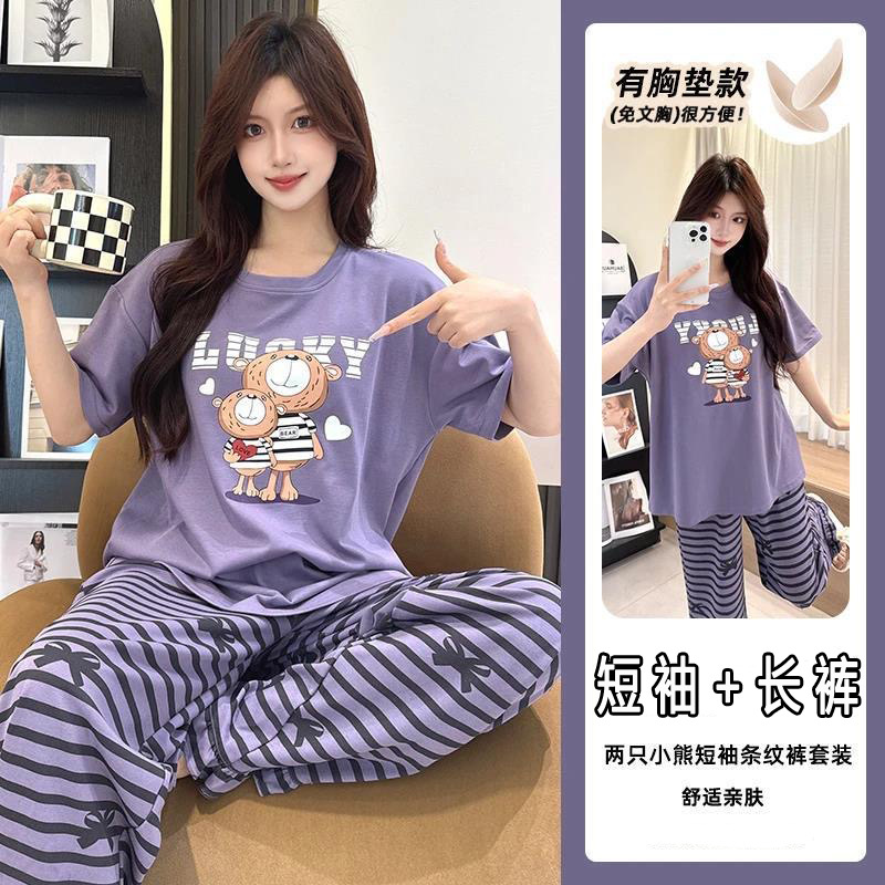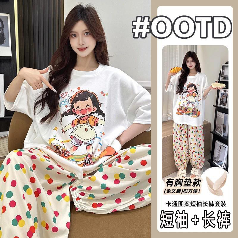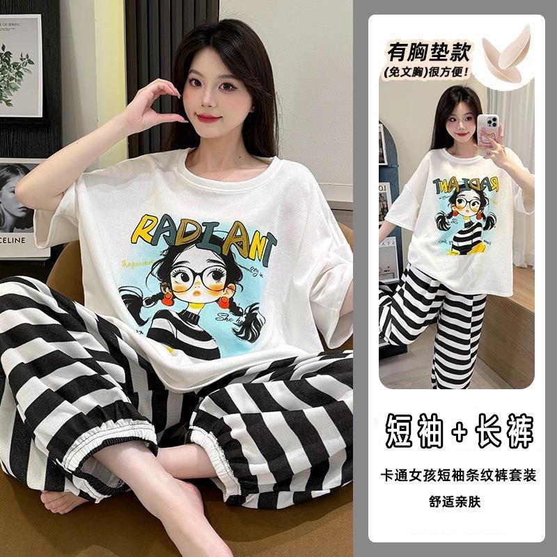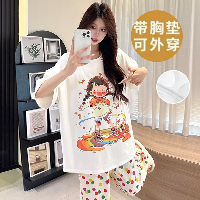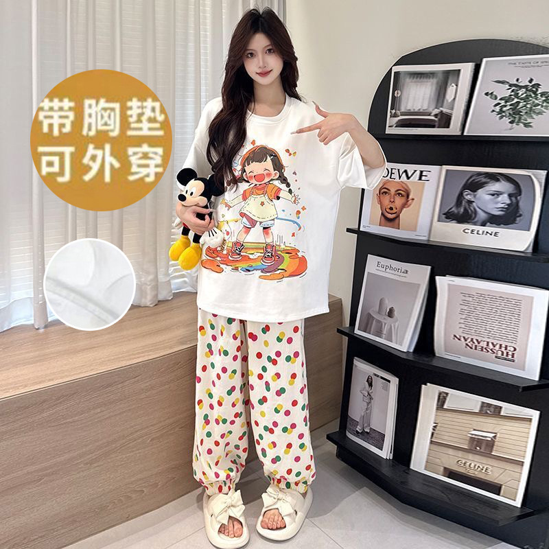 2025 여성을위한 유방 패드가있는 반팔 바지 잠옷 여름 만화 컬러 소녀 홈웨어 세트 공장 직접 판매스토어 가기