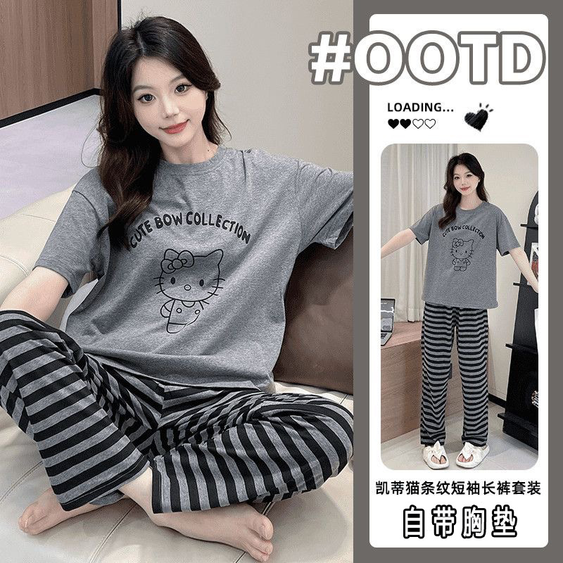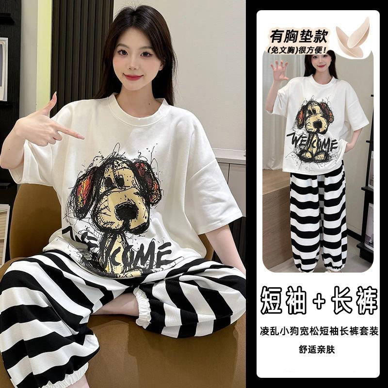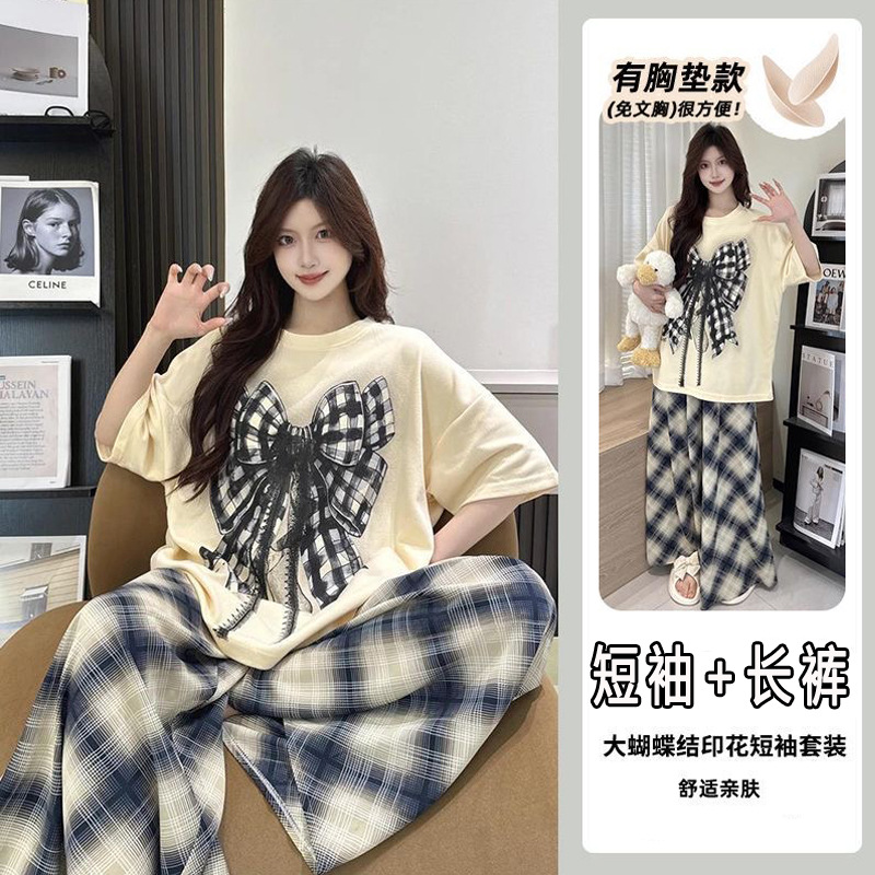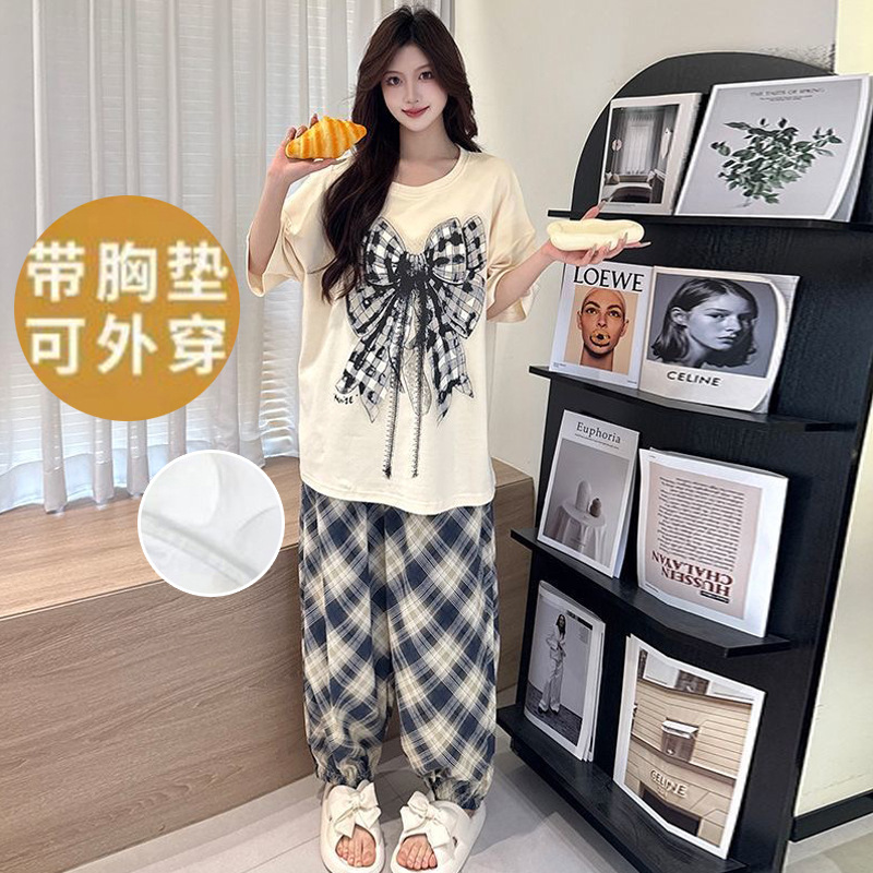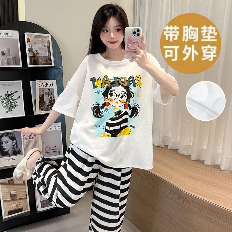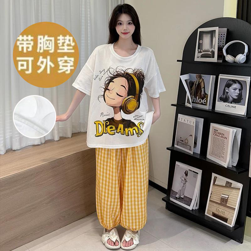 2025 여성을위한 유방 패드가있는 반팔 바지 잠옷 여름 만화 컬러 소녀 홈웨어 세트 공장 직접 판매스토어 가기