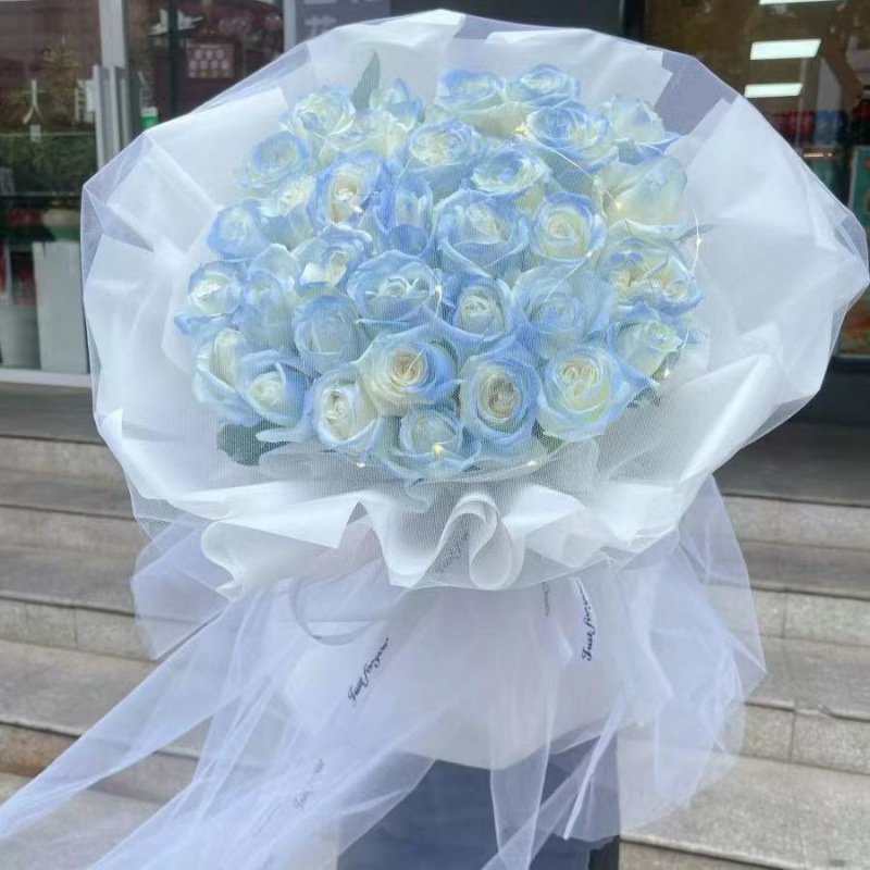 • 분쇄된 아이스 블루 장미 33송이, 무료 분위기 조명 + 정교한 축하 카드 - [무료 축하 카드 작성]