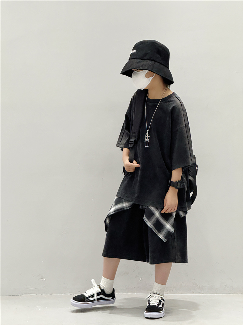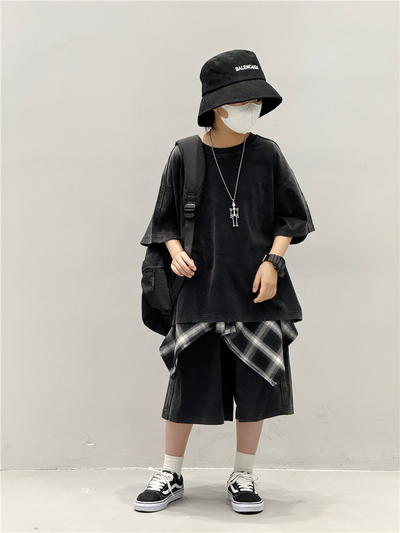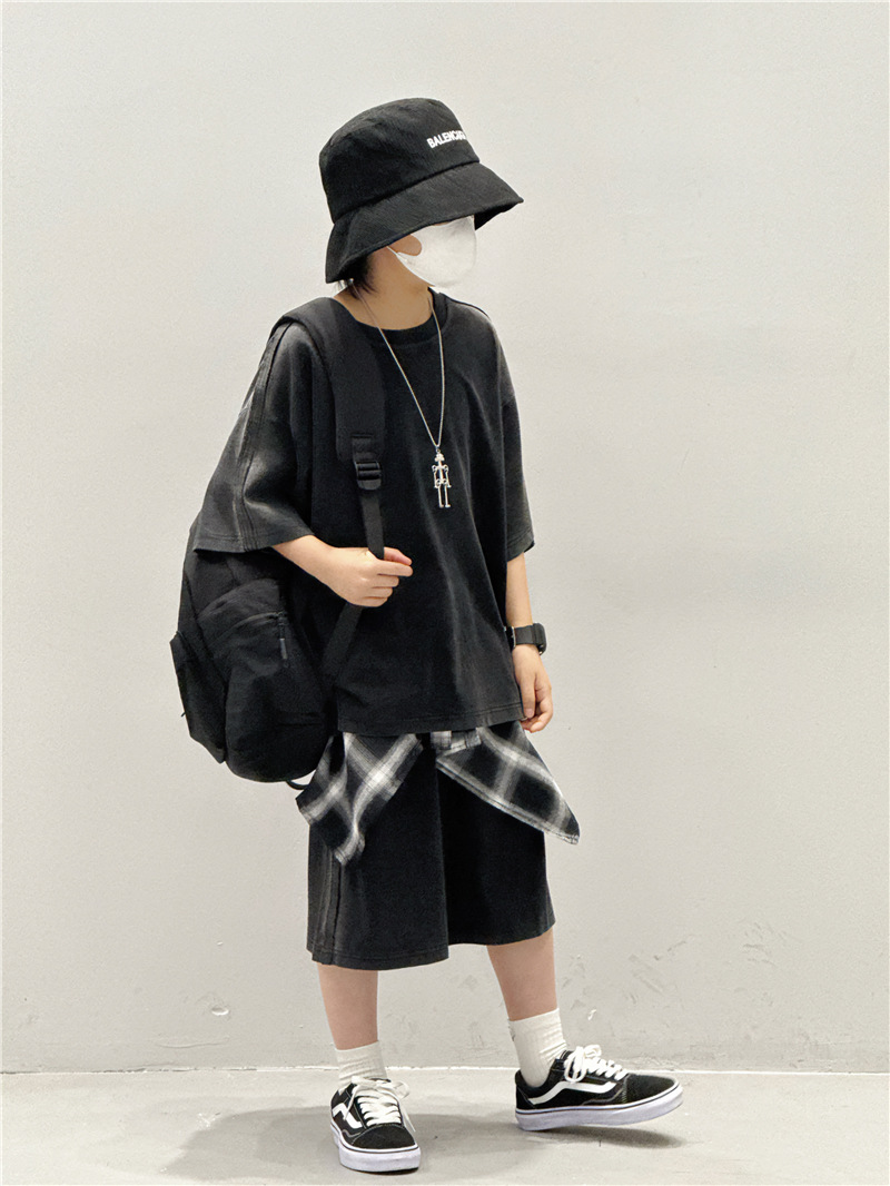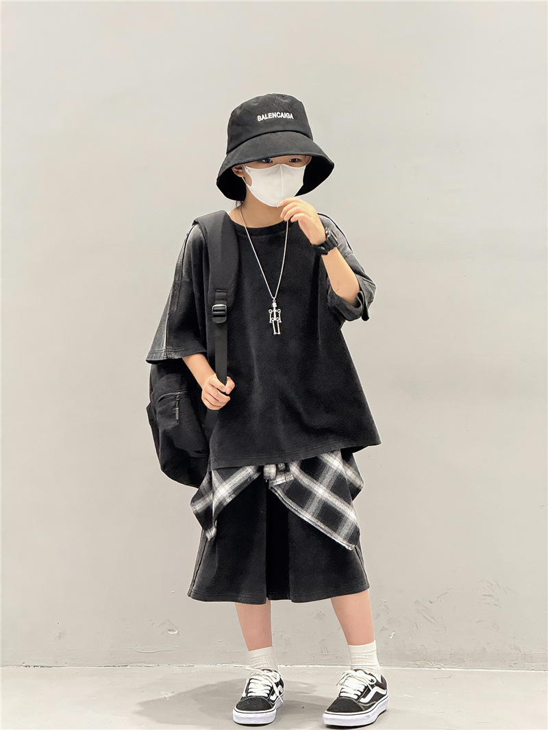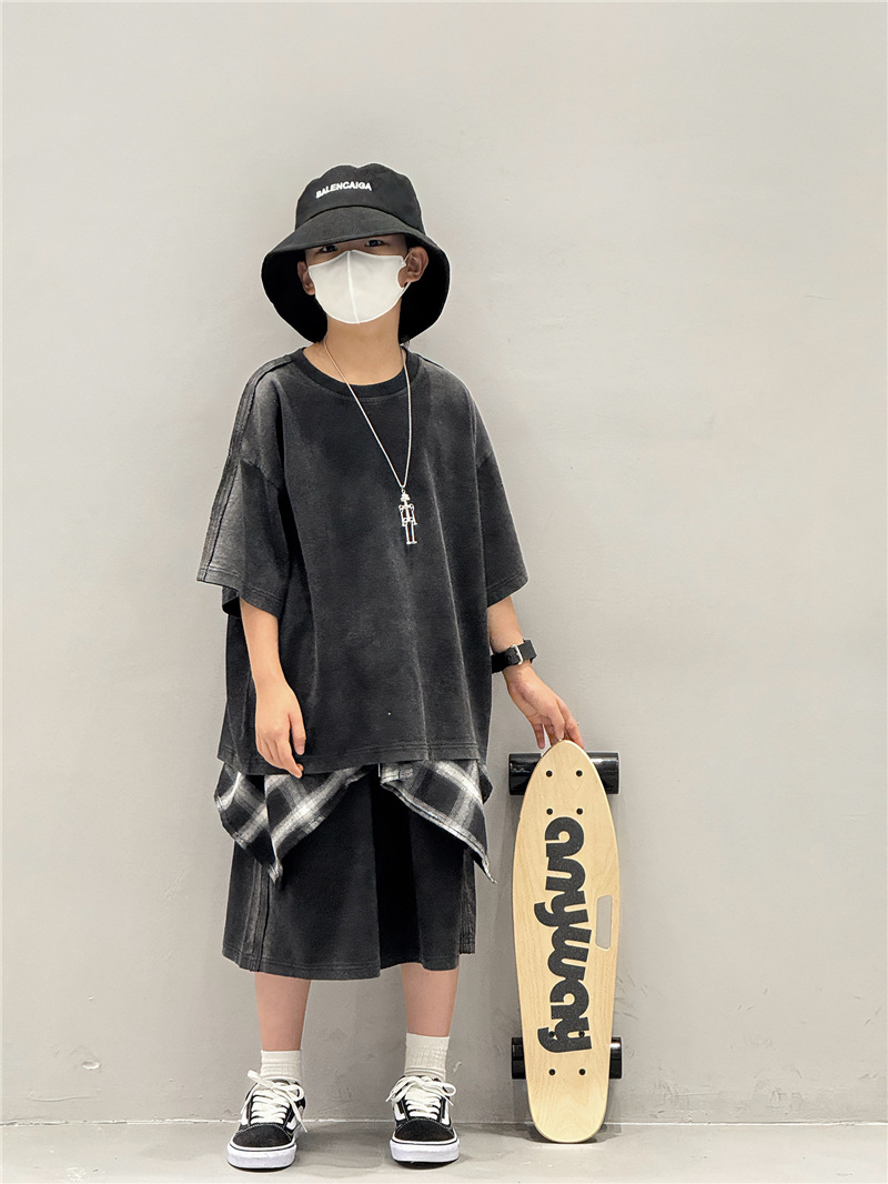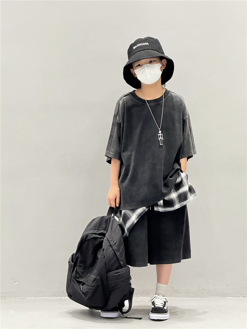 아동 여름 정장 2025 새로운 얇은 한국 스타일 티셔츠 잘 생긴 스트리트 캐주얼 소년 반팔 투피스 세트