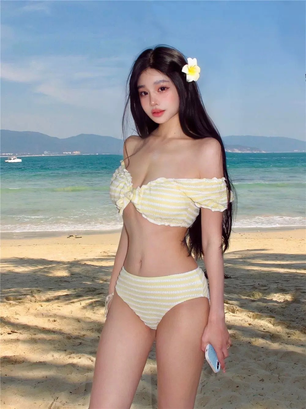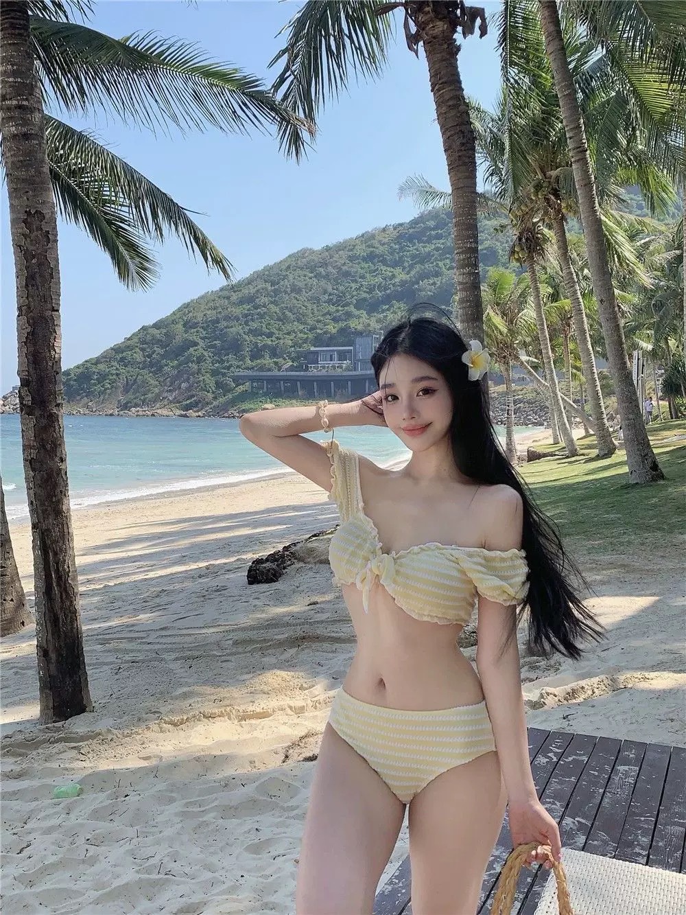 도파민 슈퍼 요정 순수한 욕망 스타일 치킨 옐로우 스플릿 스커트 비키니 수영복 여성 섹시 원 숄더 온천