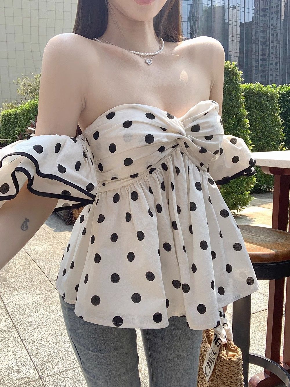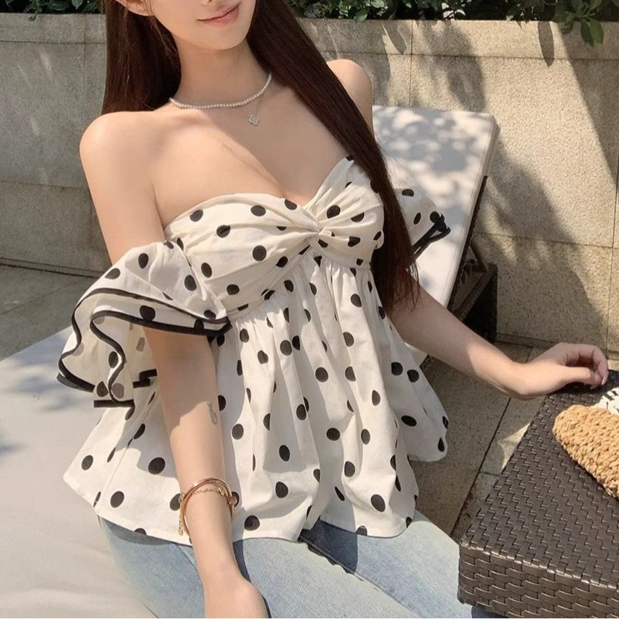여성용 원 숄더 러플 폴카 도트 쉬폰 셔츠 여름 순수한 섹시한 오프 숄더 튜브 탑 아름다운 인형 셔츠스토어 가기