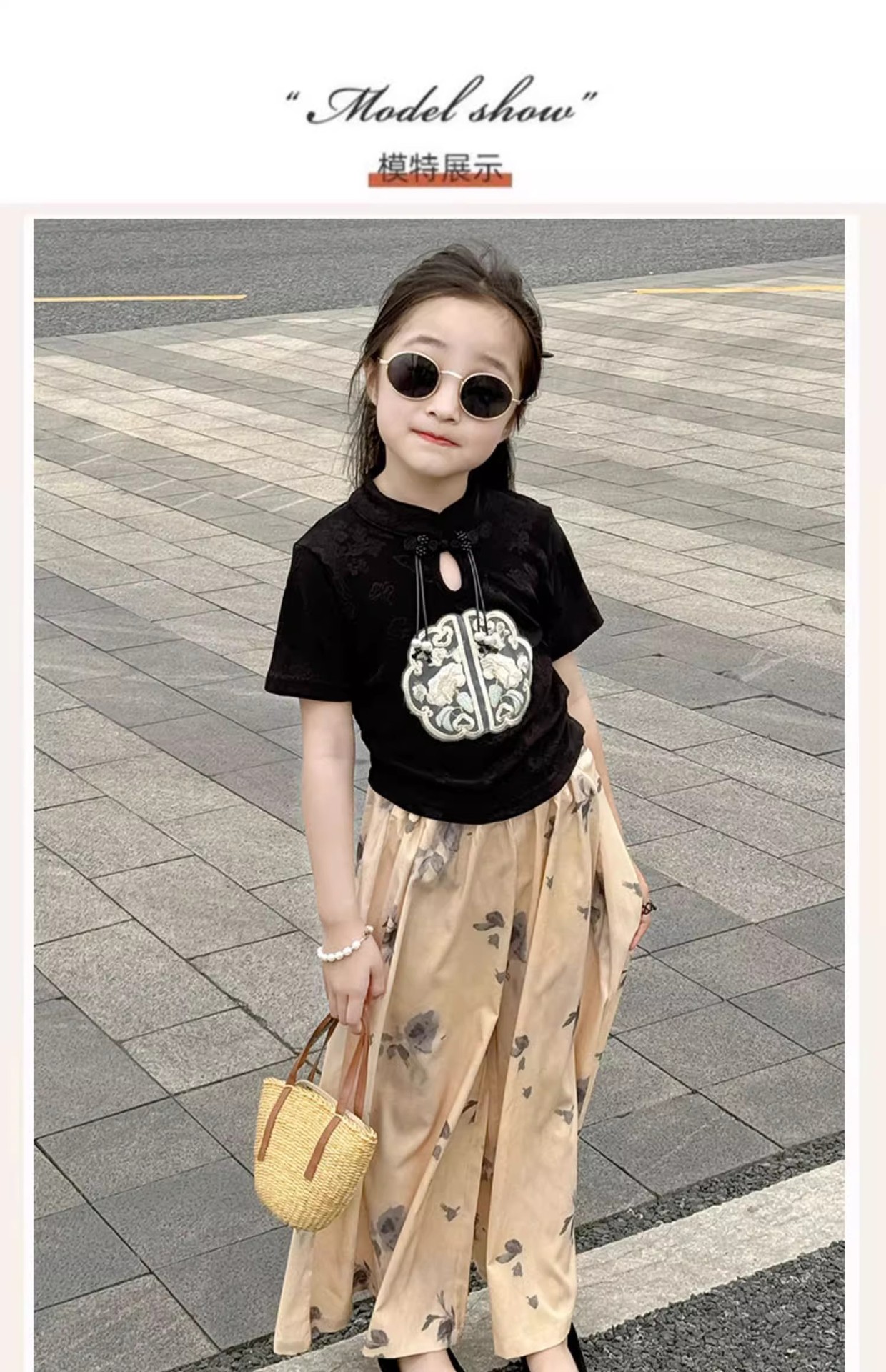 여아 신상 중국 스타일 정장 여름 스타일 복고풍 버튼 반팔 탑 패션 바지 스커트 와이드 팬츠 투피스 세트스토어 가기