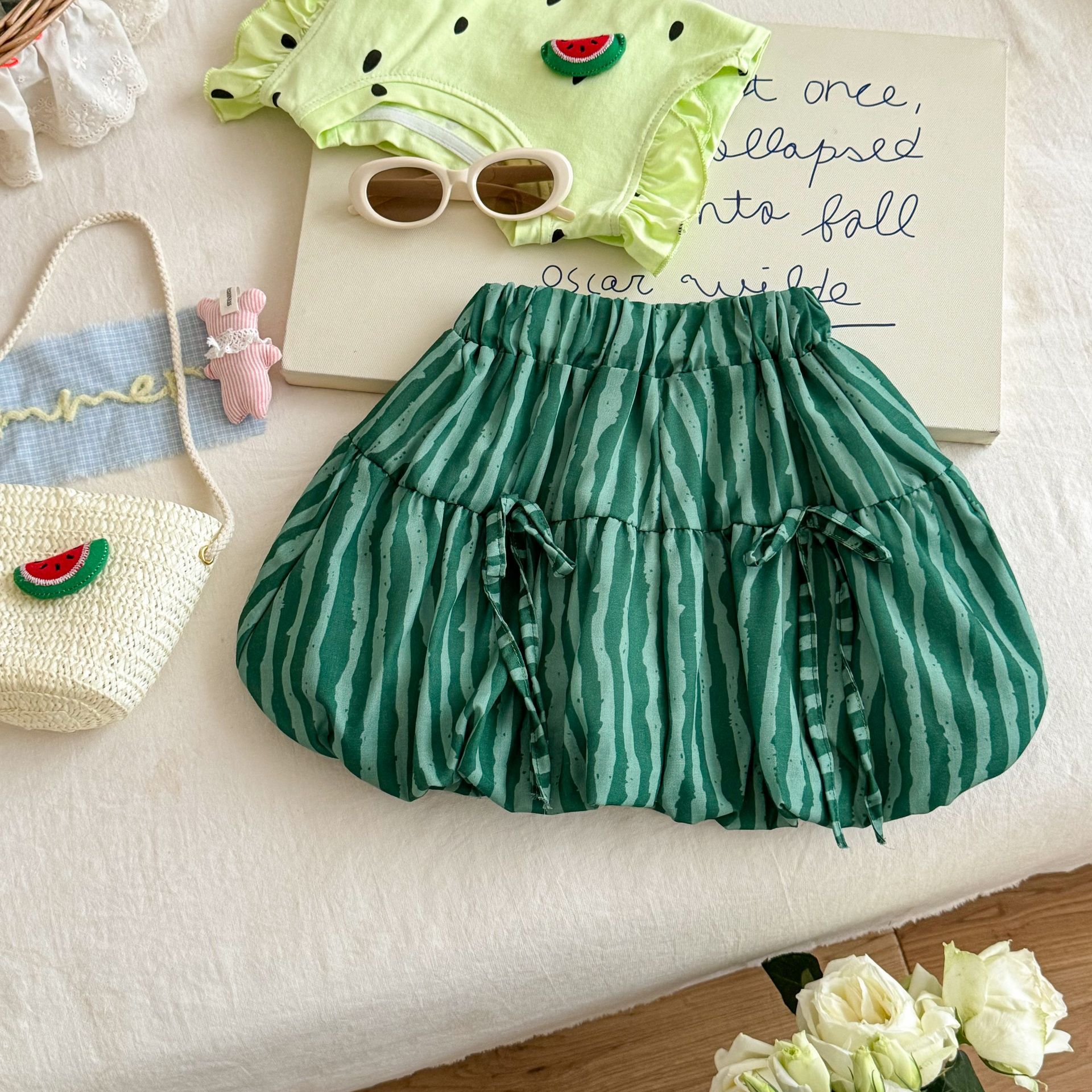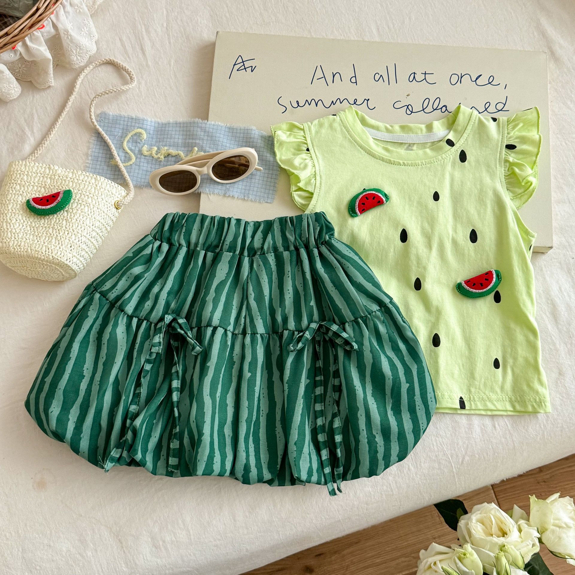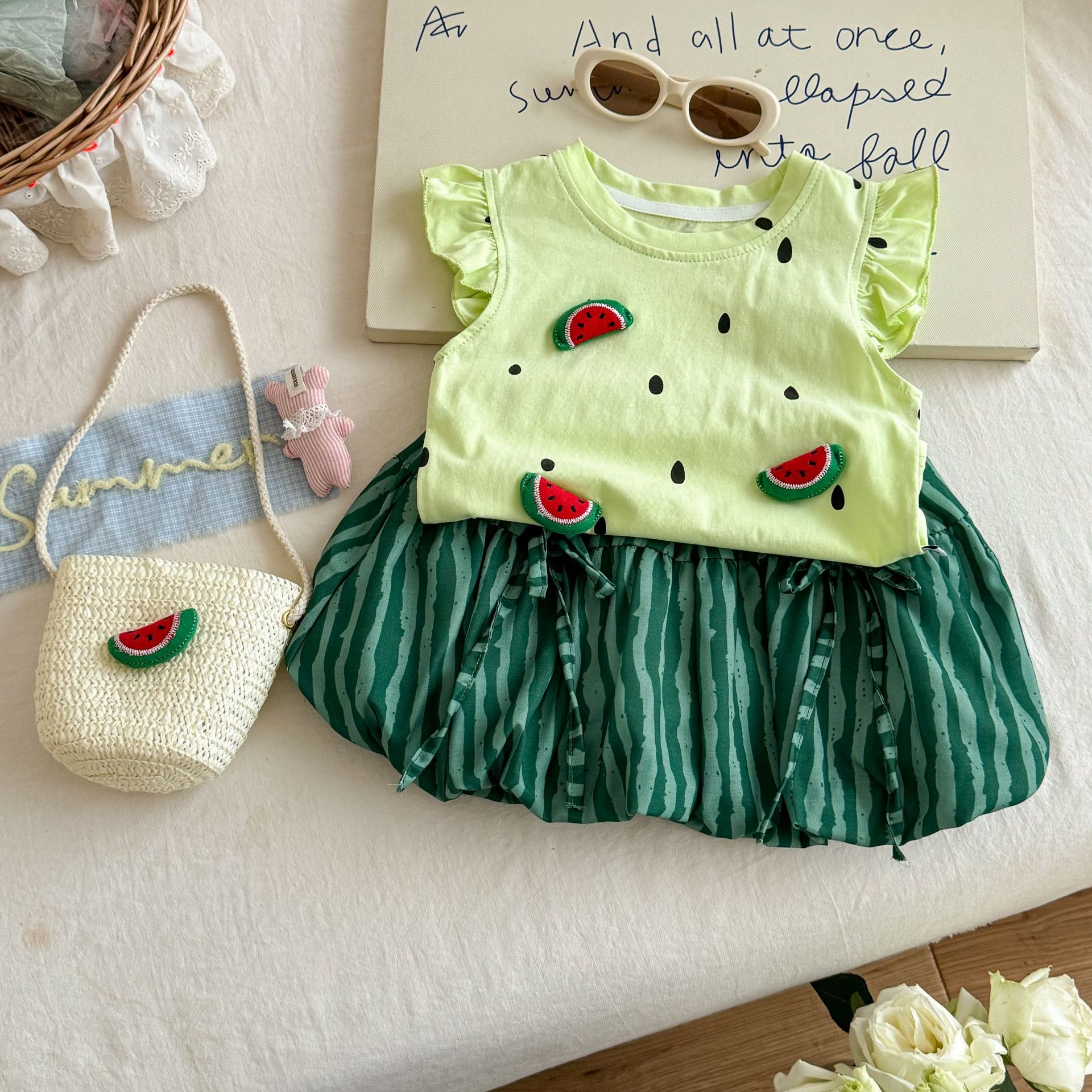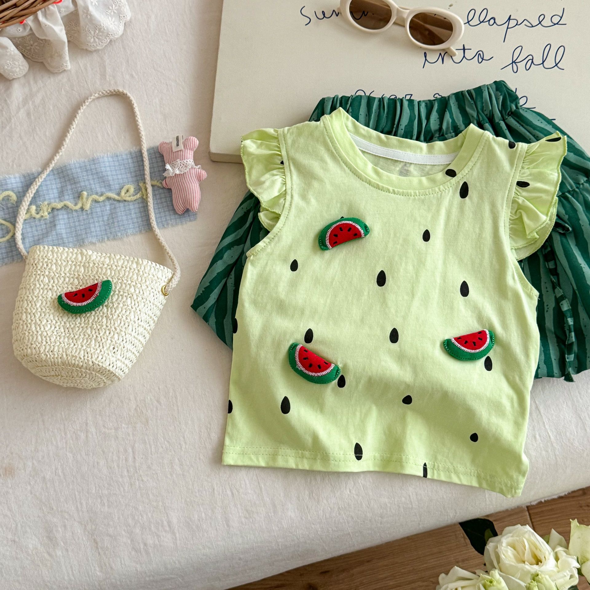 라임 소녀 여름 티셔츠 세트 25 새로운 귀여운 3 차원 수박 최고 반팔 바지 투피스 세트스토어 가기
