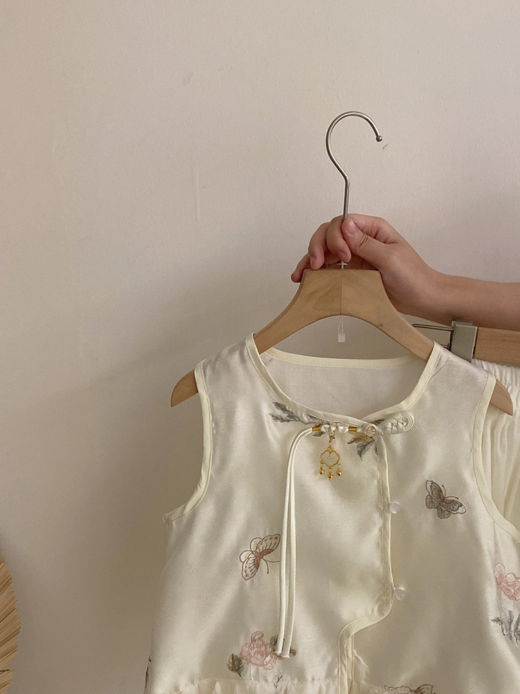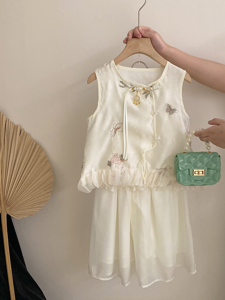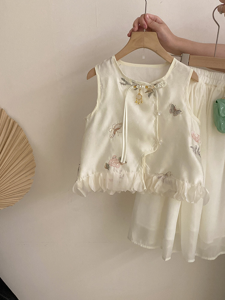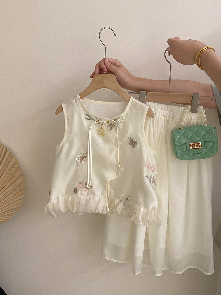 소녀들의 새로운 중국 자수 활 민소매 톱 2025 올 매치 캐주얼 루즈 와이드 레그 컬로 테스 투피스 패셔너블 세트