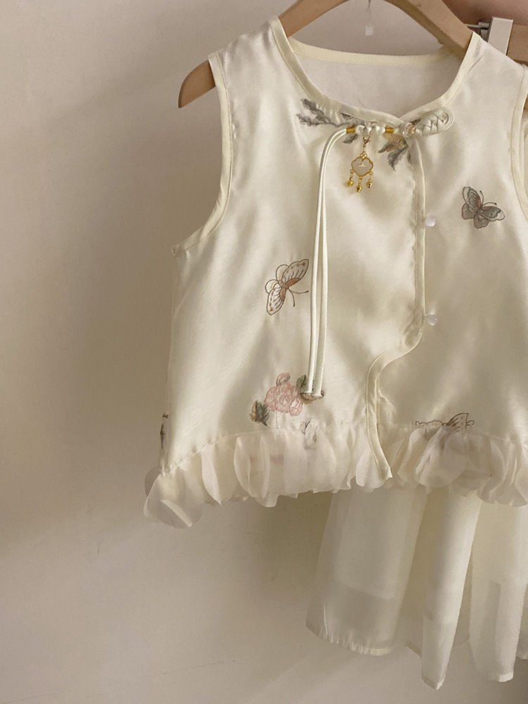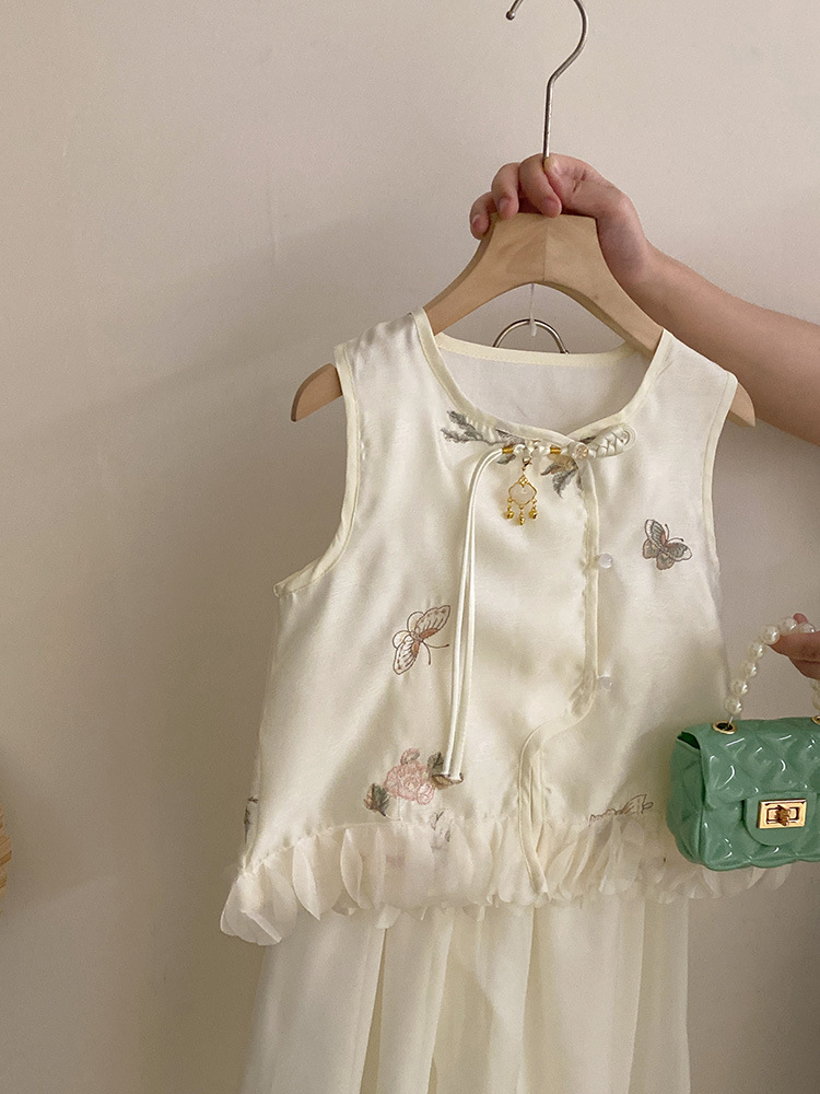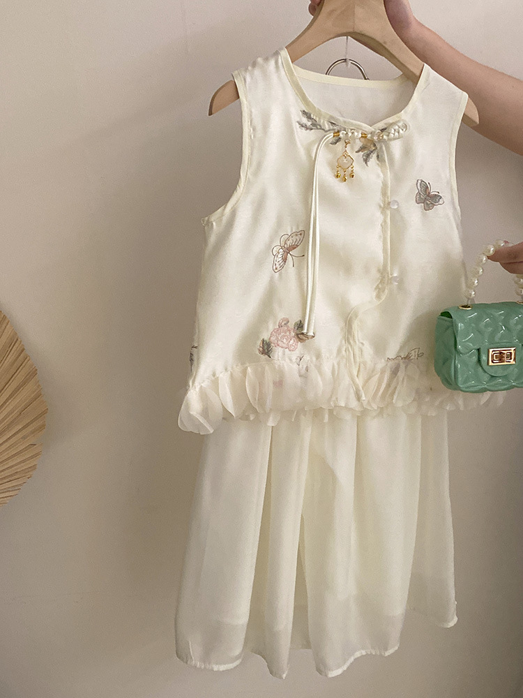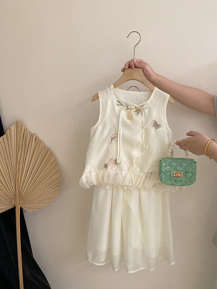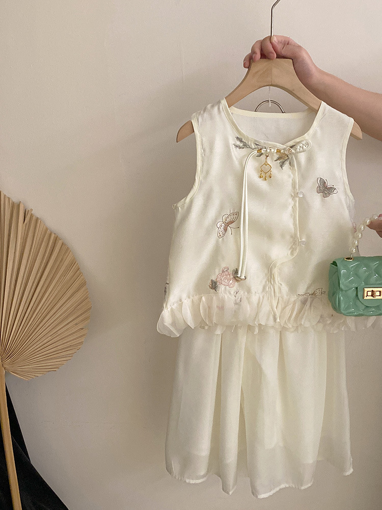 소녀들의 새로운 중국 자수 활 민소매 톱 2025 올 매치 캐주얼 루즈 와이드 레그 컬로 테스 투피스 패셔너블 세트