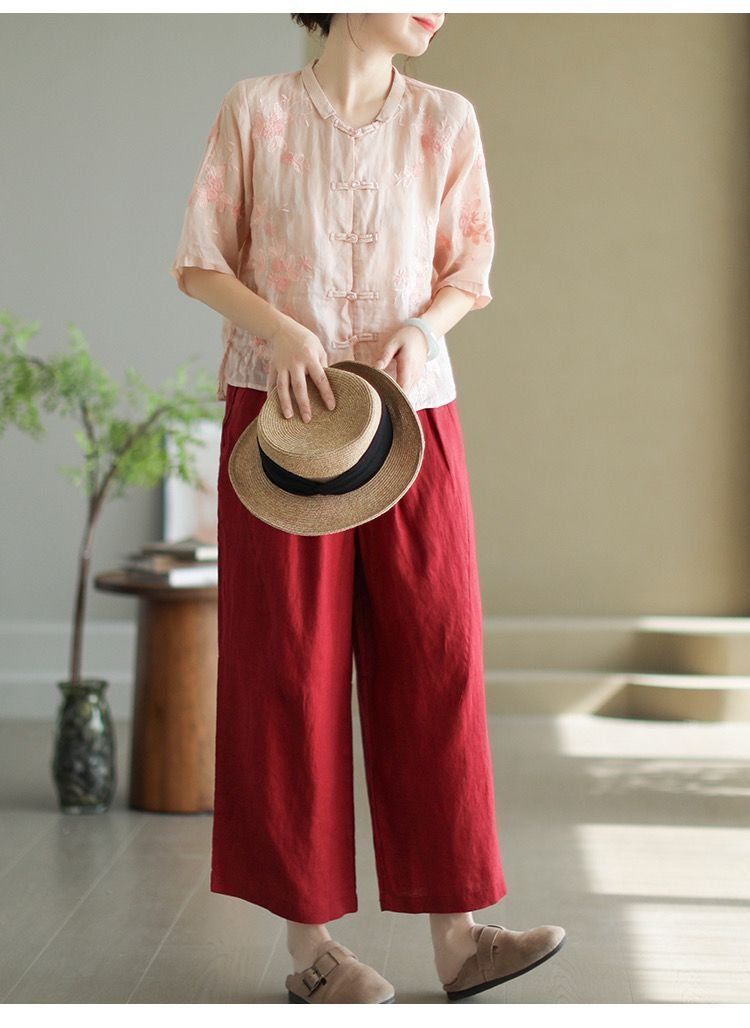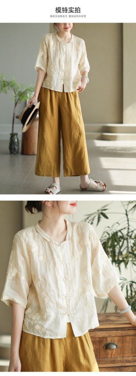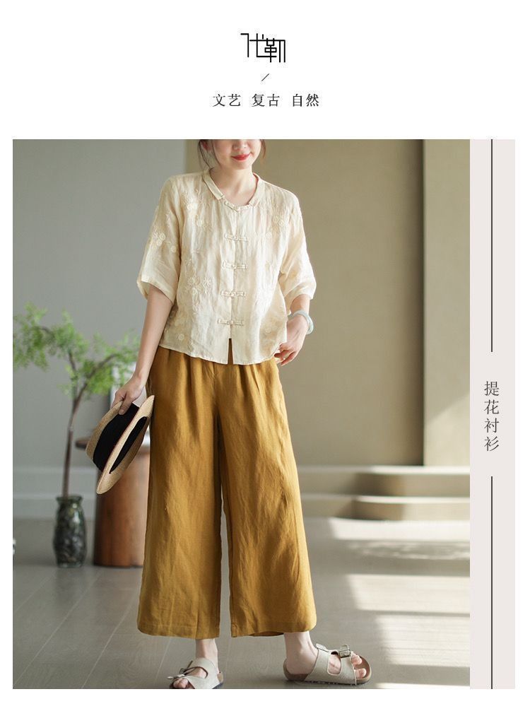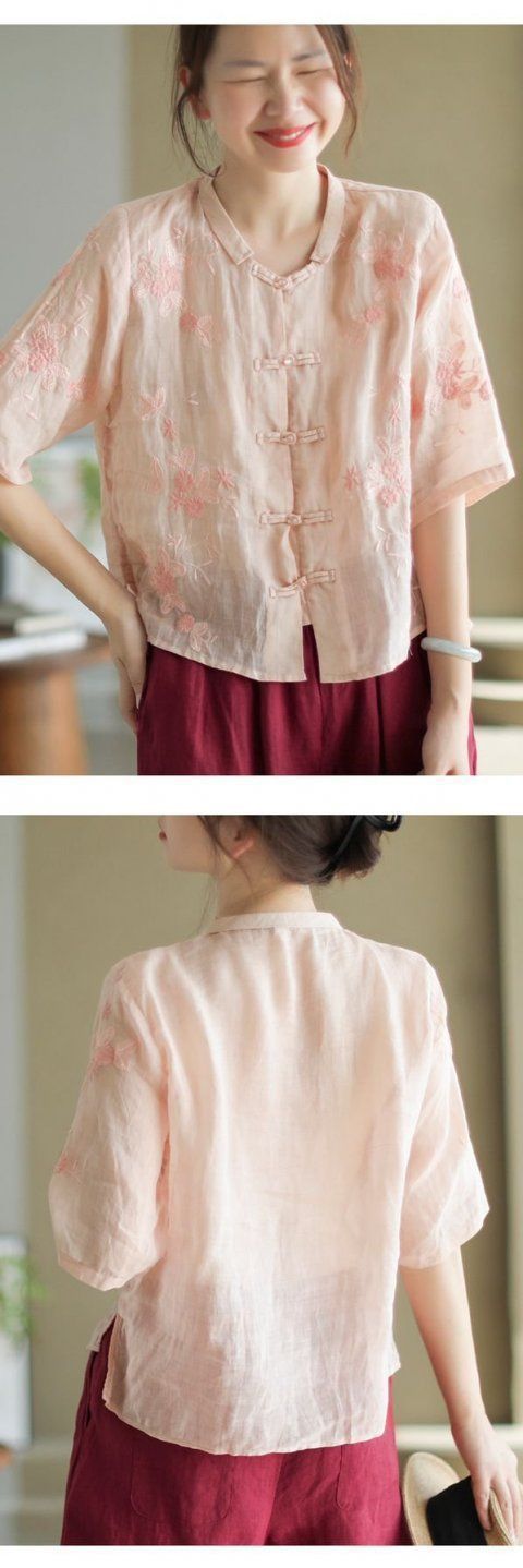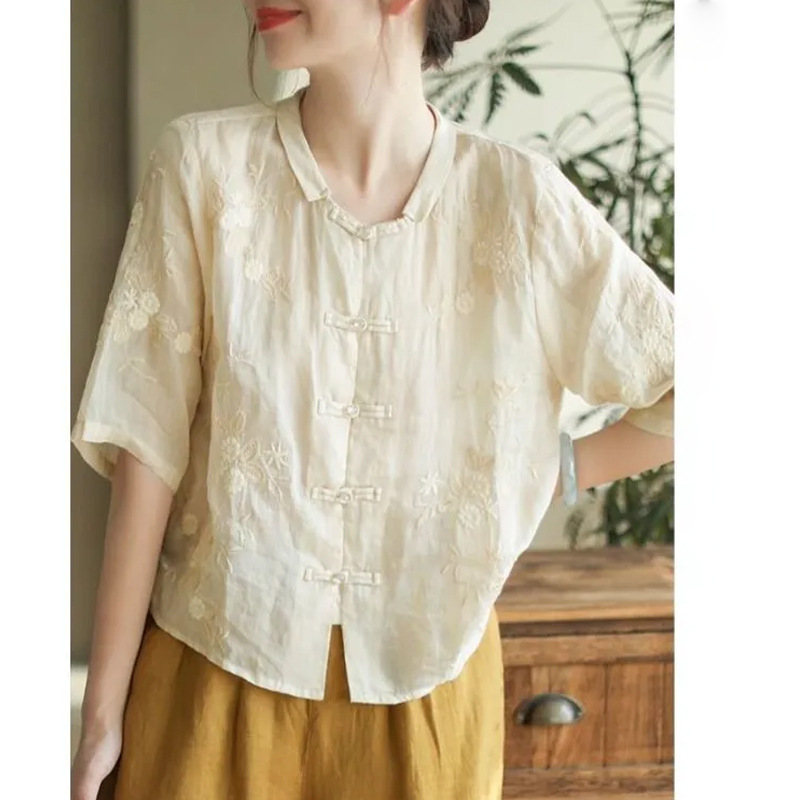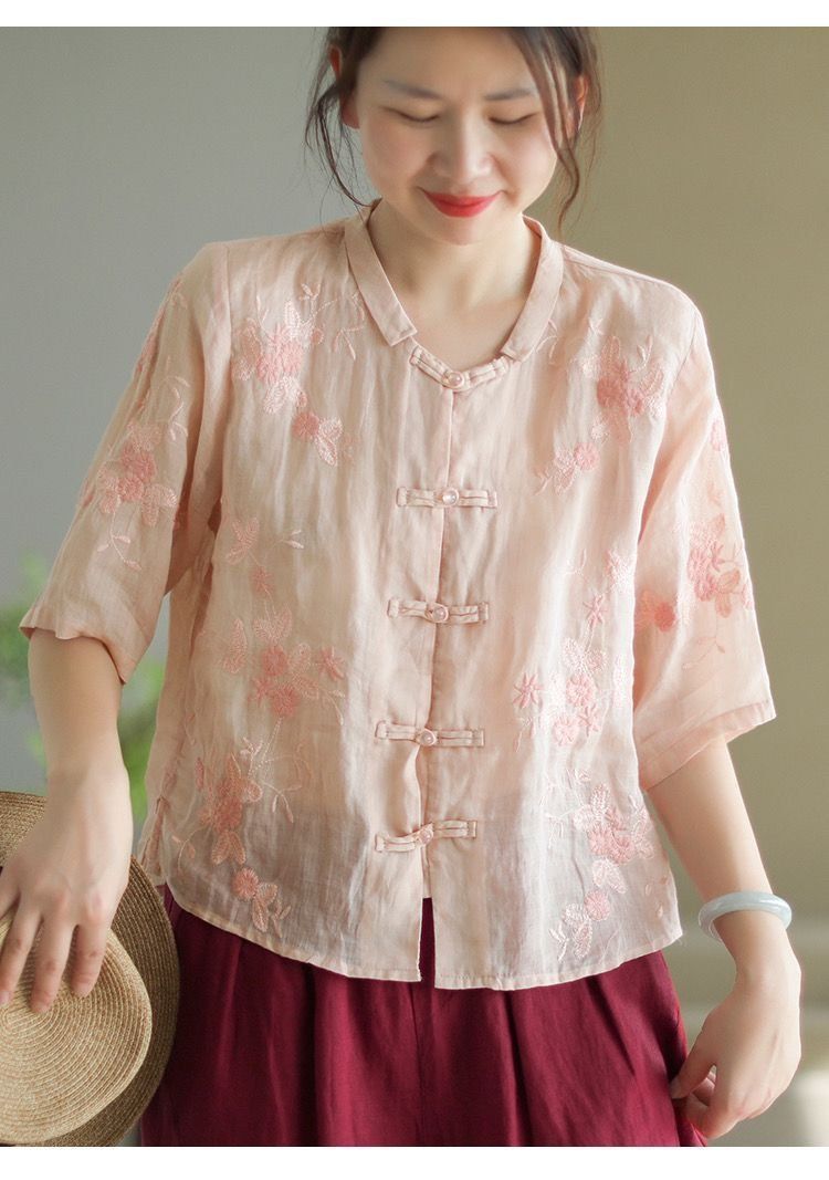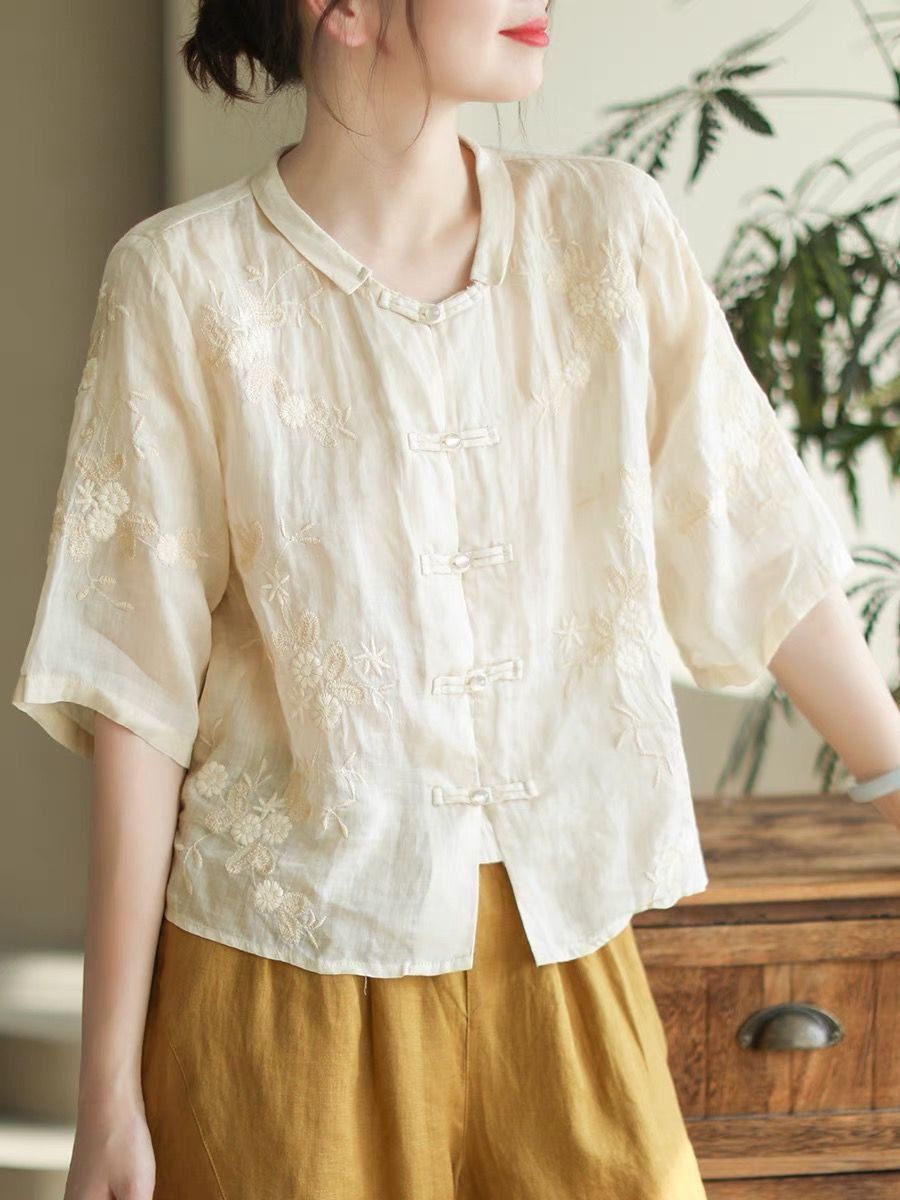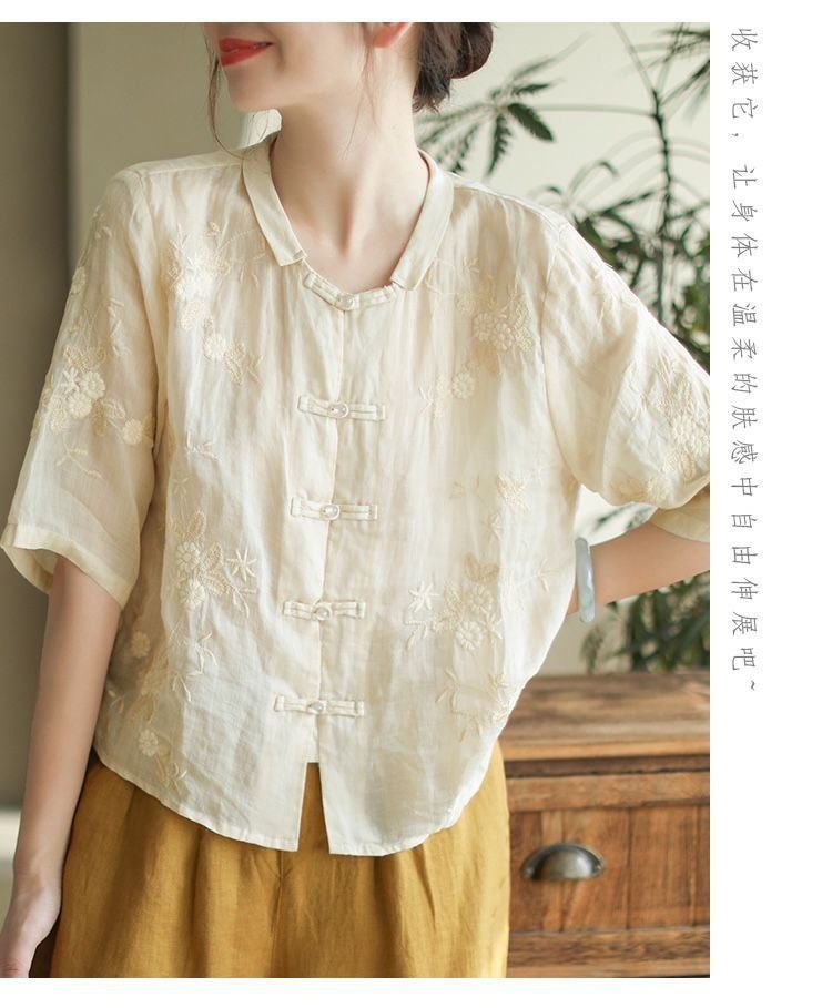 플러스 사이즈 여성 봄 여름 복고풍 중국 스타일 버튼 셔츠 여성스러운 자수 면 및 린넨 탑 중간 소매 차 셔츠스토어 가기