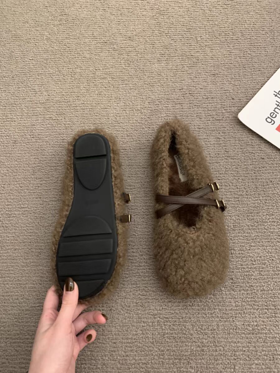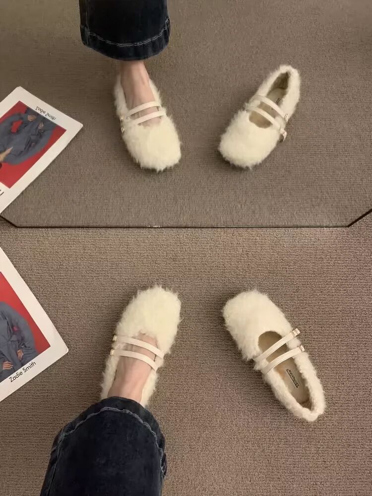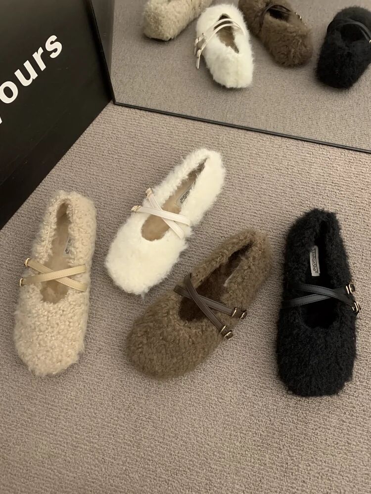 여성을위한 프렌치 이브닝 스타일 크로스 버클 메리 제인 코튼 슈즈 2024 가을 겨울 새로운 스타일의 아웃웨어 편안하고 다재다능한 모피 슈즈