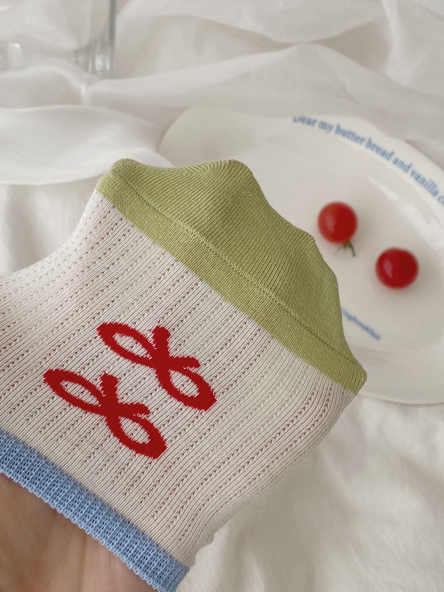 한국 스타일 애플 보트 양말 여름 얇은 통기성 메쉬 보이지 않는 양말 떨어지지 않는 줄무늬 나비 매듭 양말
