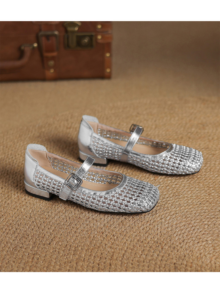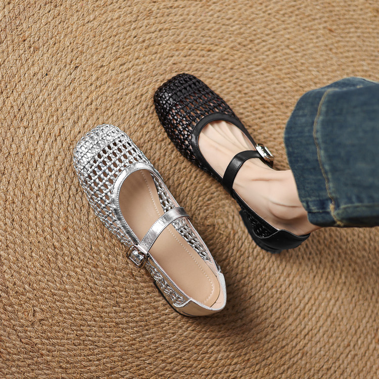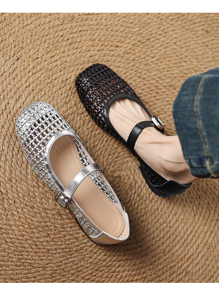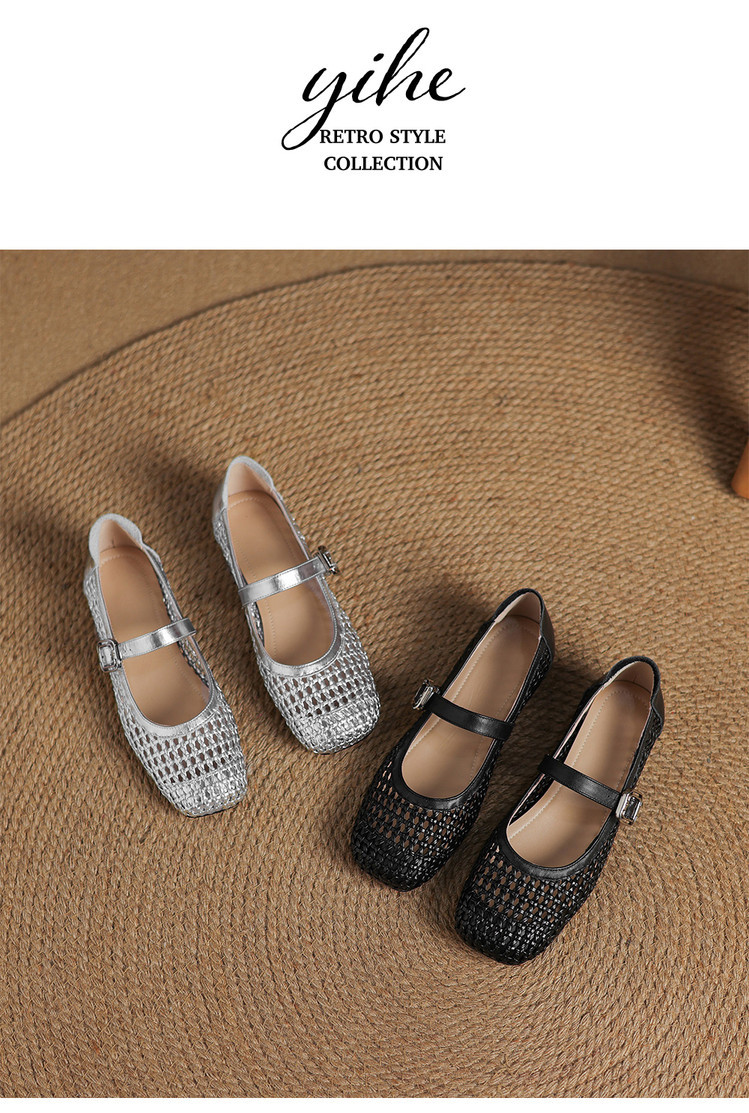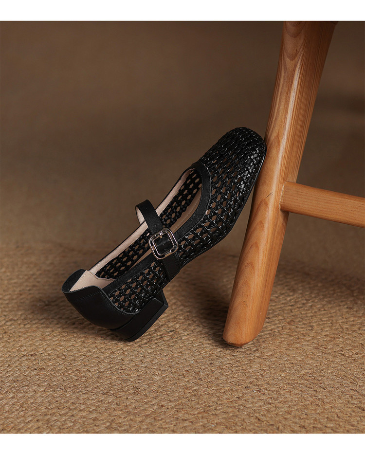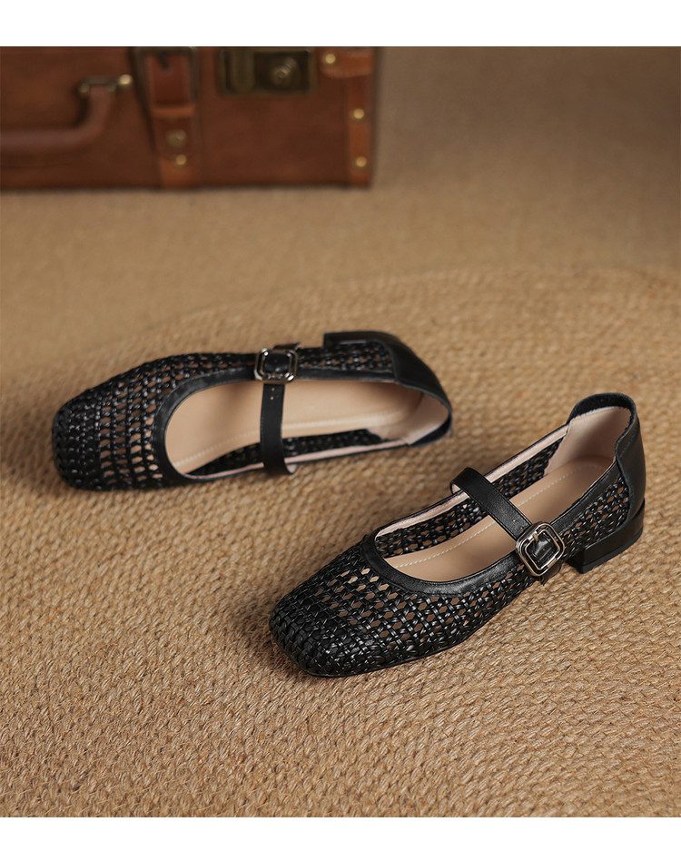 재고 있음 복고풍 손으로 짠 스퀘어 토 버클 중공 통기성 플랫 바닥 캐주얼 다용도 메리 제인 슈즈