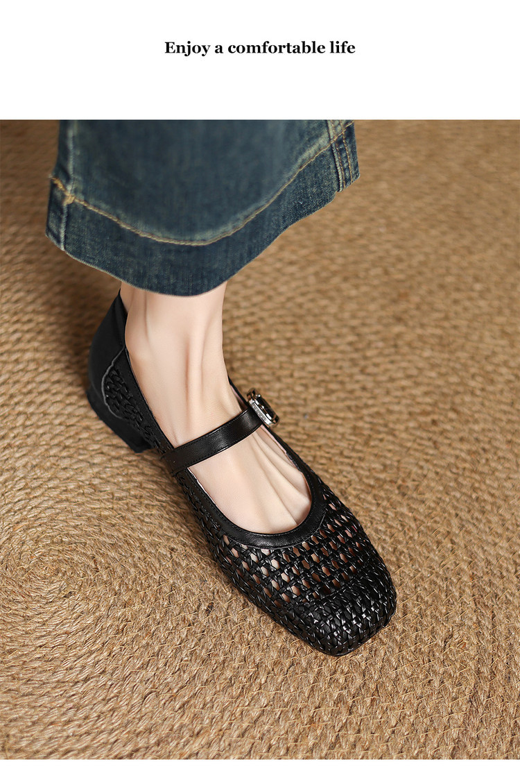 재고 있음 복고풍 손으로 짠 스퀘어 토 버클 중공 통기성 플랫 바닥 캐주얼 다용도 메리 제인 슈즈스토어 가기
