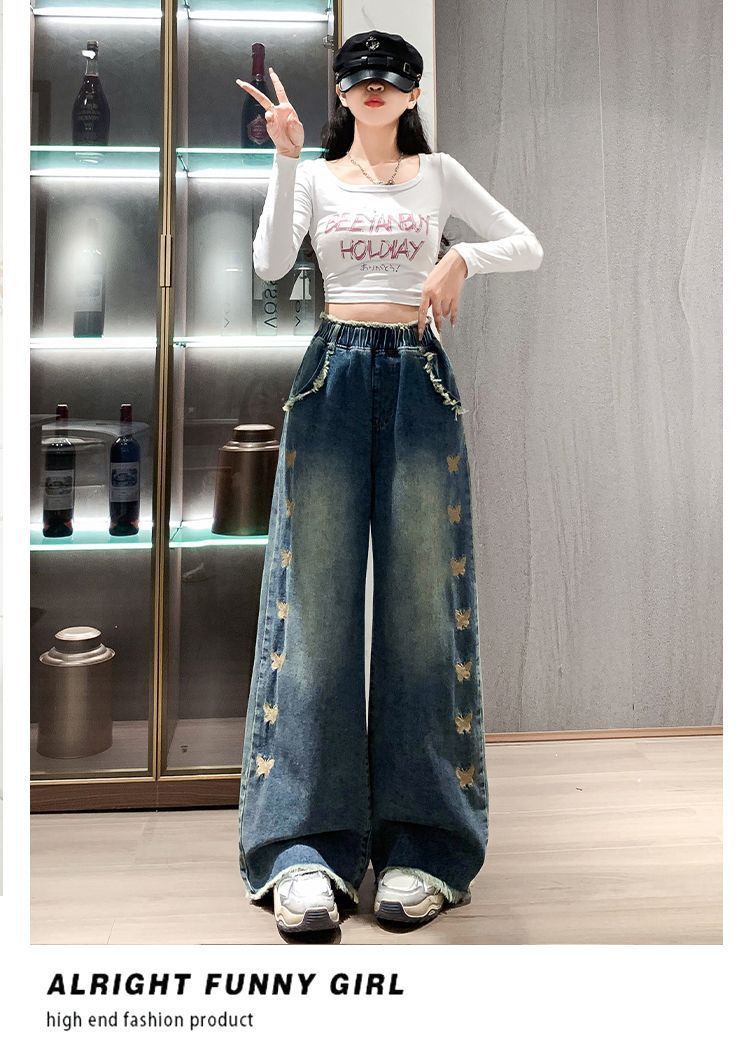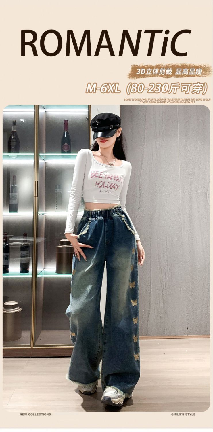 뚱뚱한 mm 플러스 사이즈 청바지 여성용 바닥 길이 스트레이트 와이드 레그 루즈 타이트 하이 웨이스트 슬리밍 봄, 가을 학생 루즈 탄성 바지스토어 가기