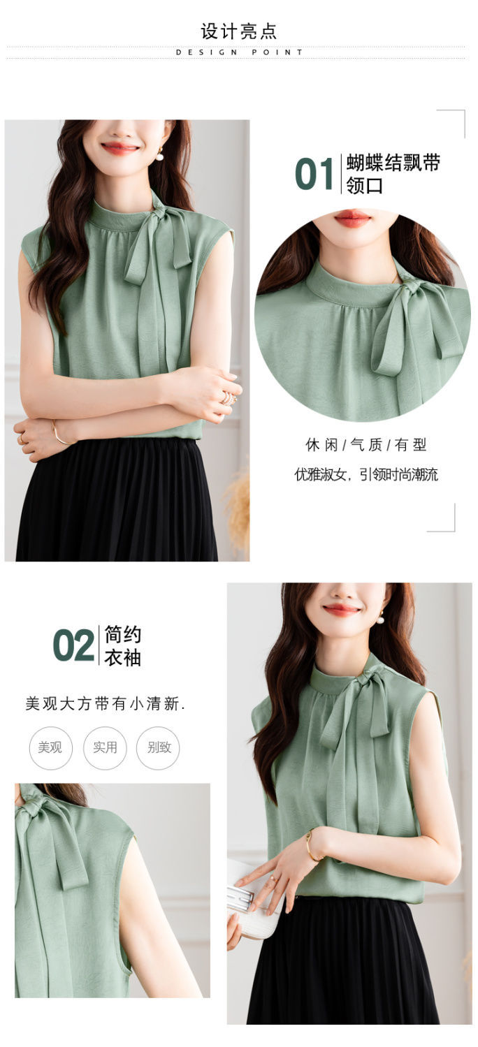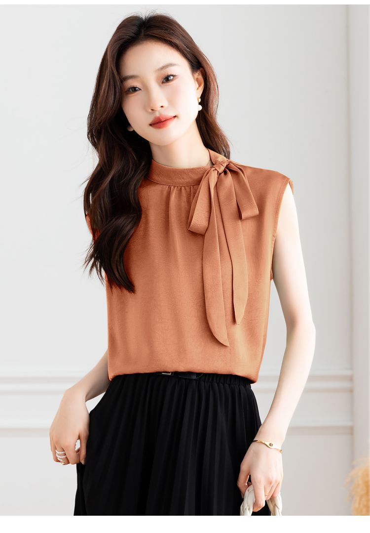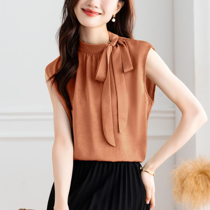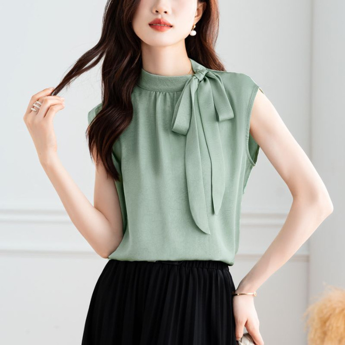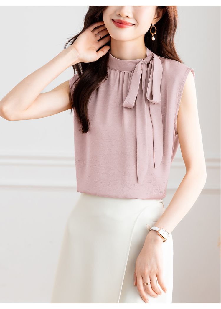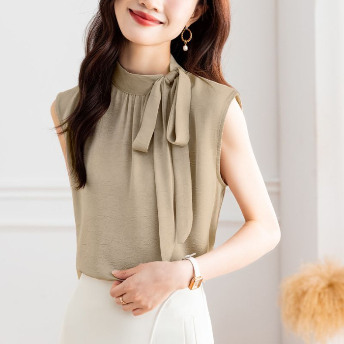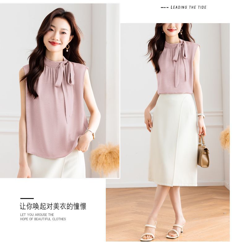 여름 여성을 위한 스탠드 칼라 보우 타이 쉬폰 셔츠, 새로운 스타일, 세련된 우아한 여성용 민소매 셔츠, 시크 탑스토어 가기