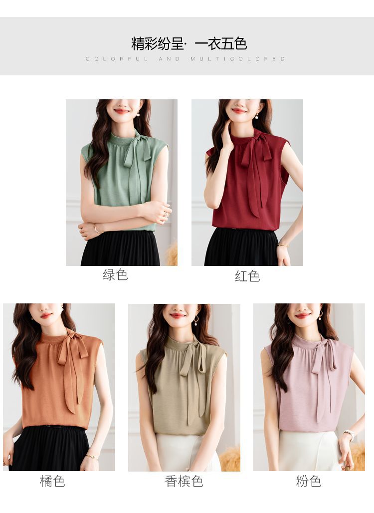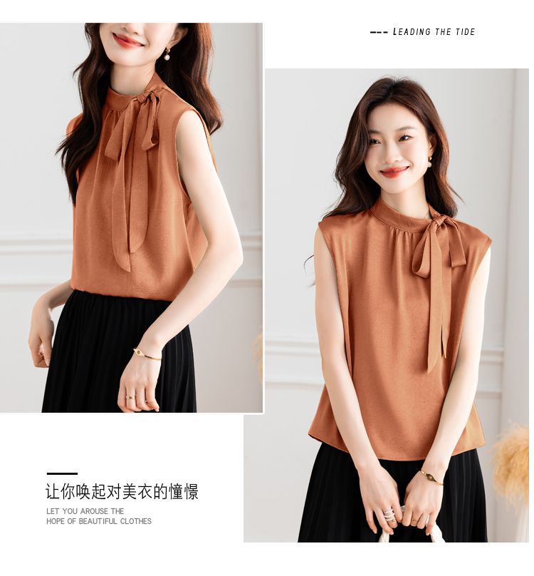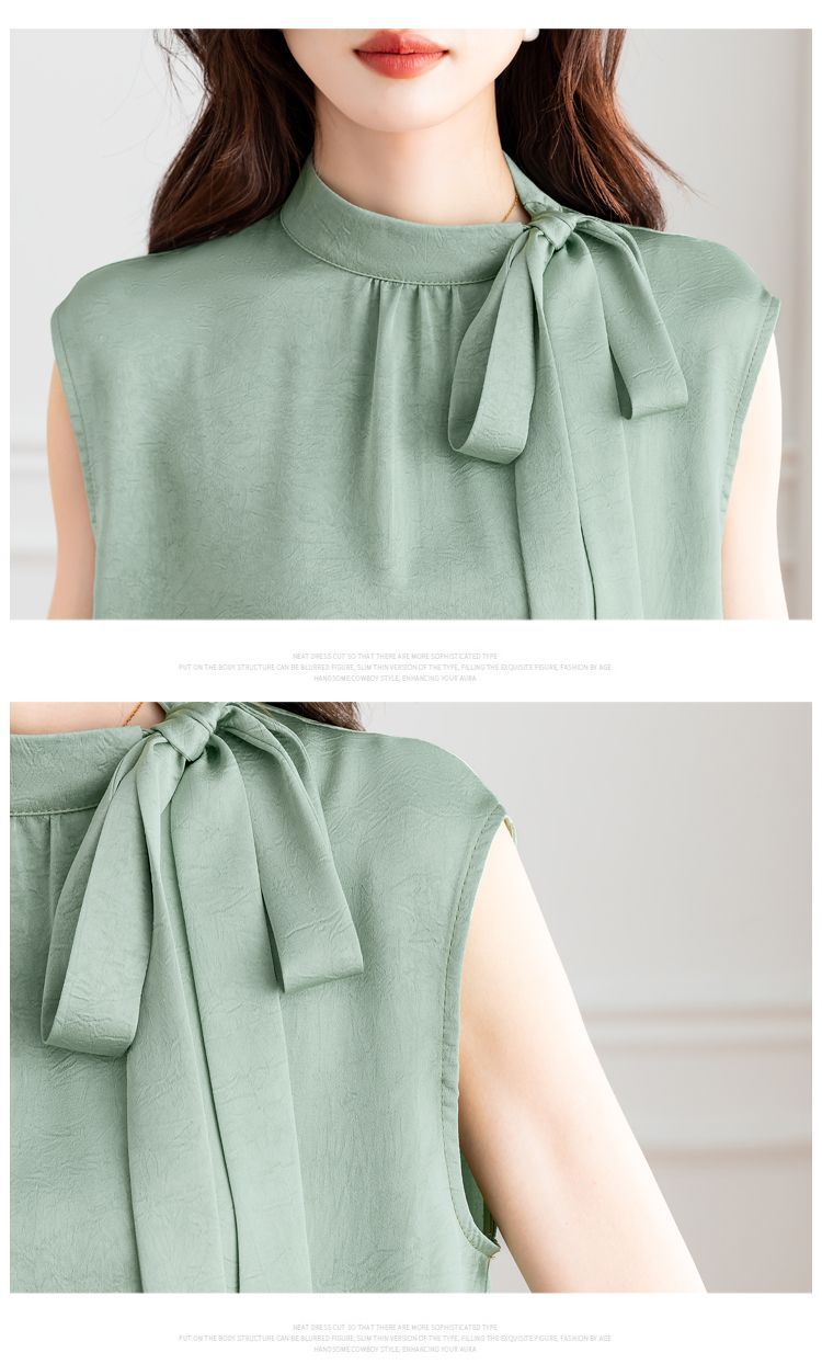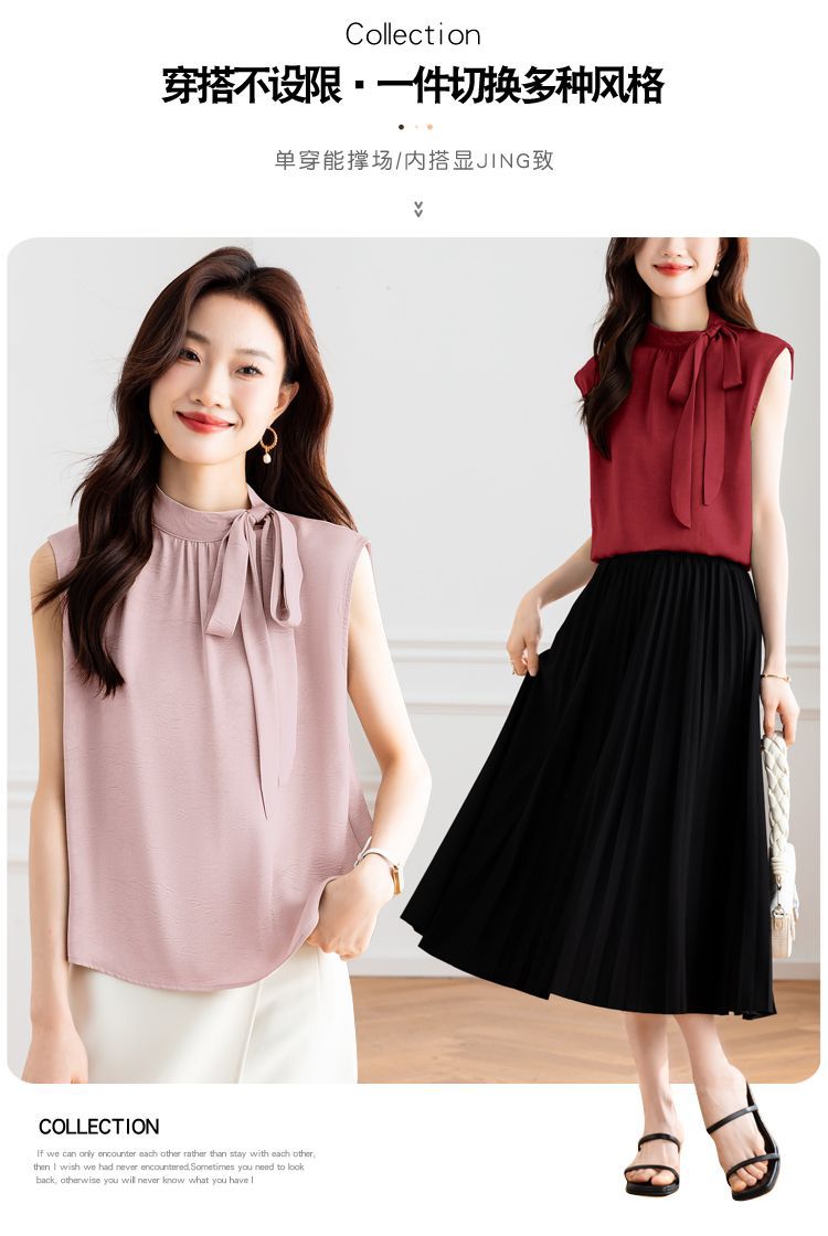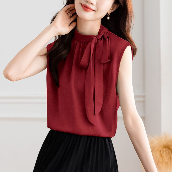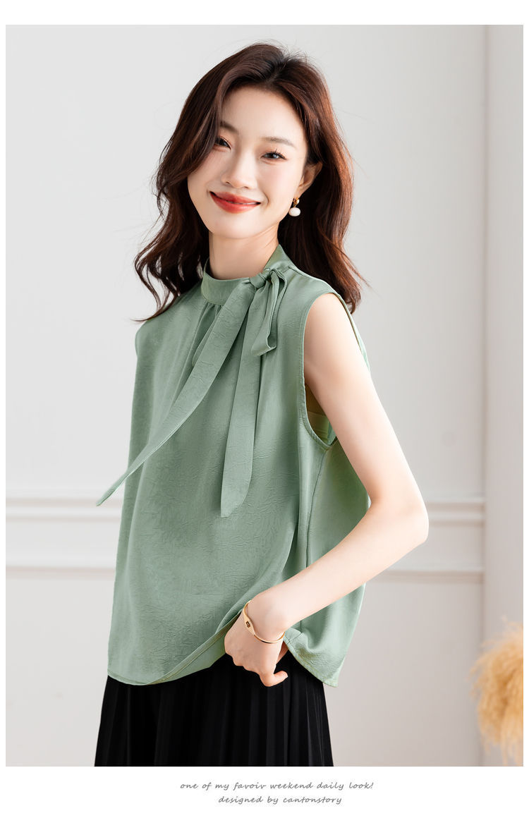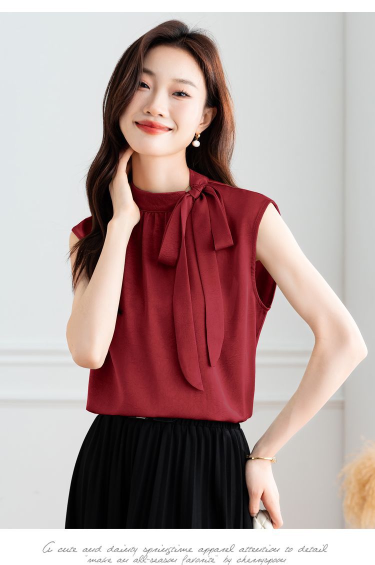 여름 여성을 위한 스탠드 칼라 보우 타이 쉬폰 셔츠, 새로운 스타일, 세련된 우아한 여성용 민소매 셔츠, 시크 탑