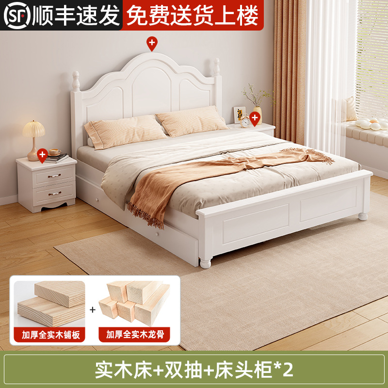 • 원목 침대 + 더블 서랍 + 5cm 매트리스 + 침대 옆 테이블 * 2 [집까지 무료 배송]