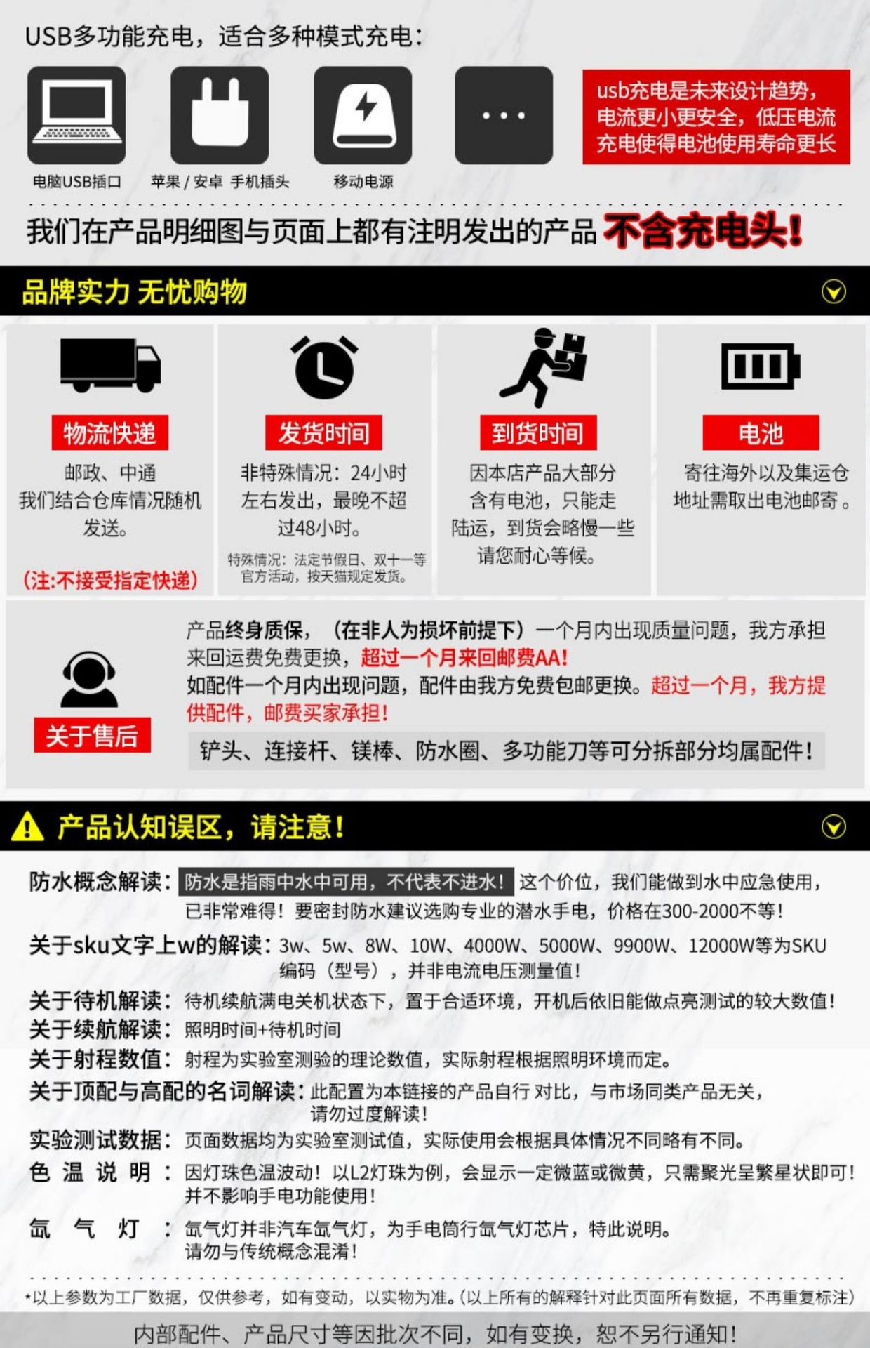 • 하나의 검정색 USB 직접 충전에 노란색, 흰색, 보라색의 60w 세 가지 광원이 포함되어 있으며 작은 스포트라이트 헤드가 함께 제공됩니다.
