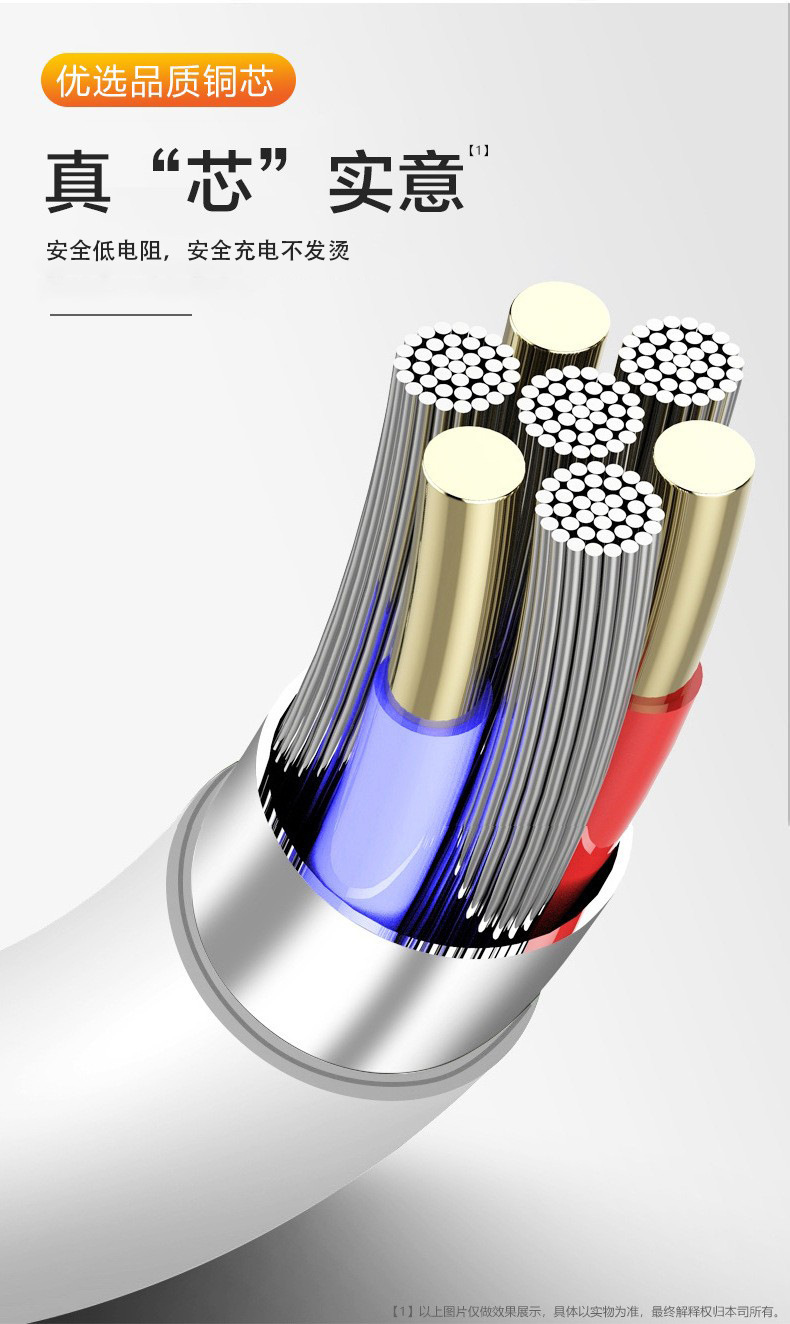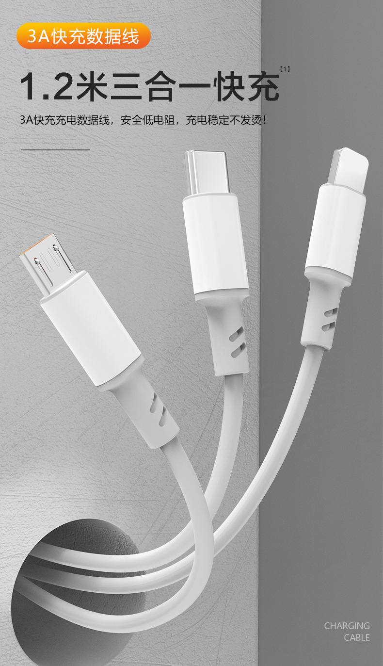 【产品亮点】:TPE加固柔软接头,有效解决弯折断裂难题,新升级插头,安全不漏电,充电无隐患,3种接口,满足市面上大部分设备充电。