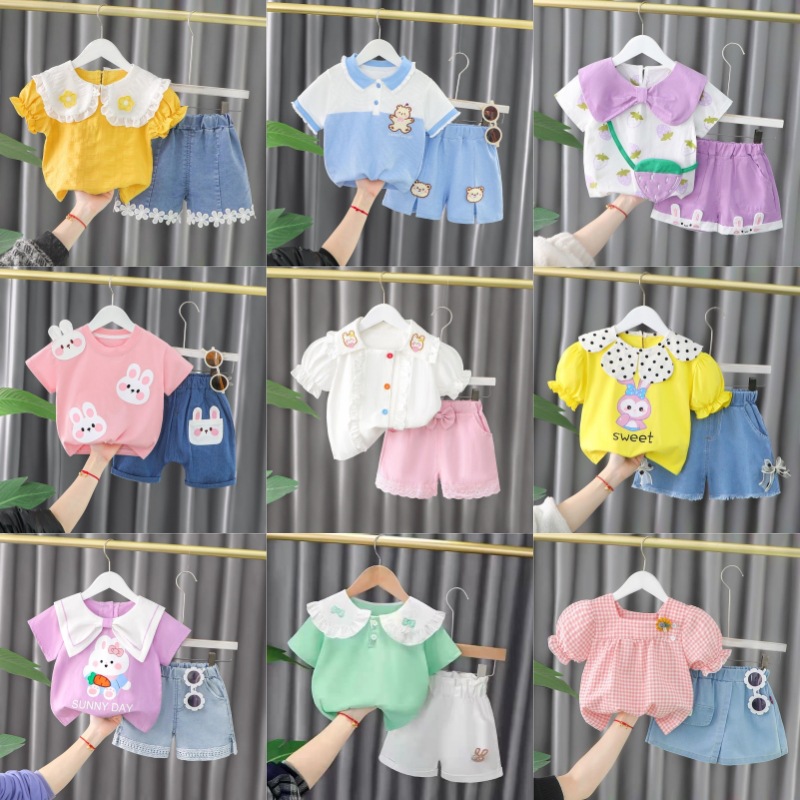 여자 여름 스포츠 정장 새로운 스타일 아기 여름 옷 어린이 여름 옷 귀여운 반팔 투피스 세트 유행스토어 가기