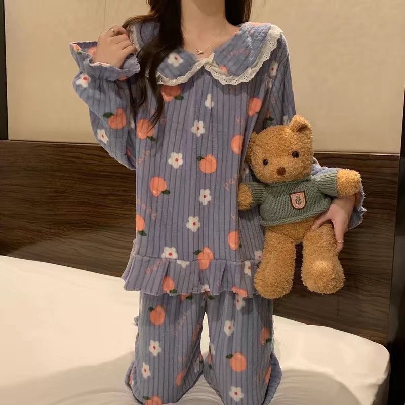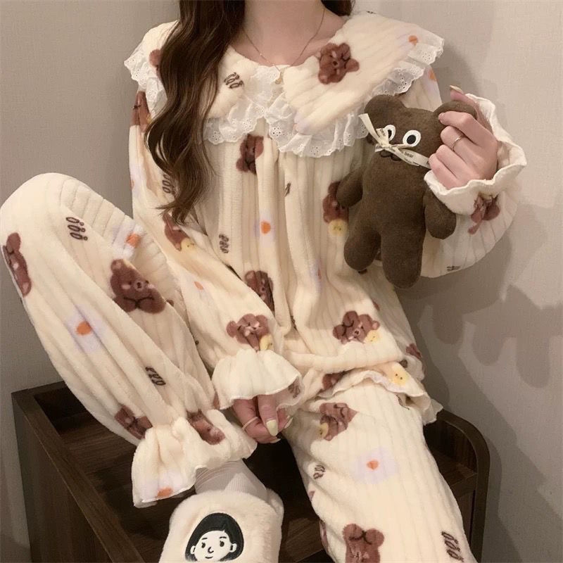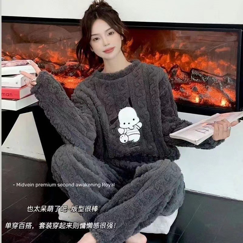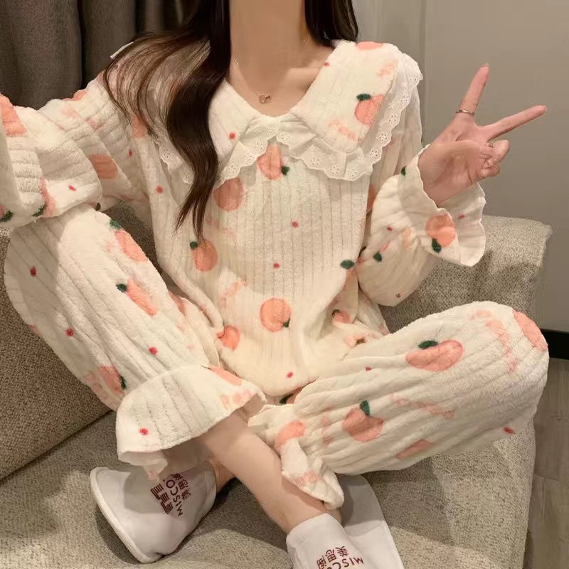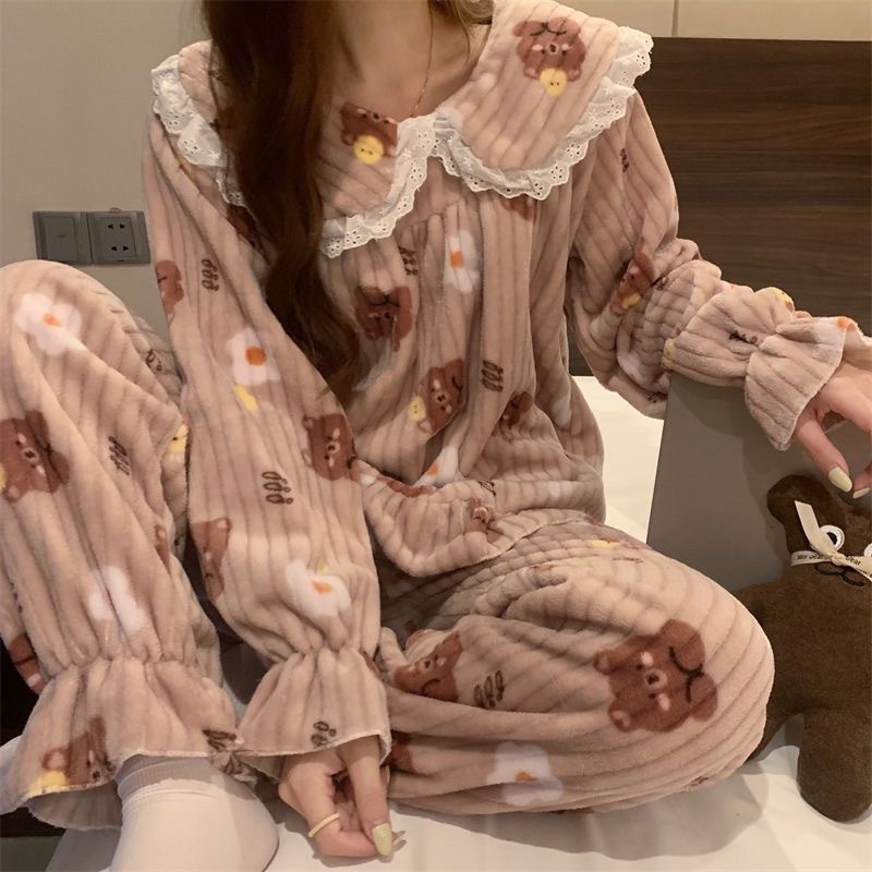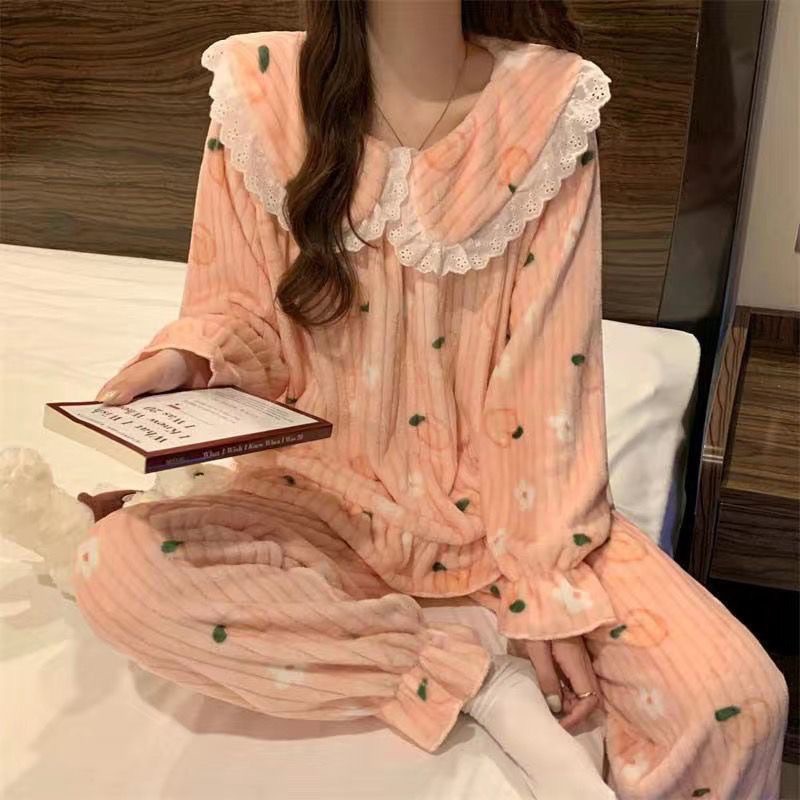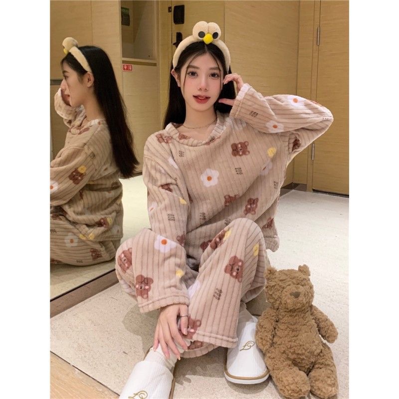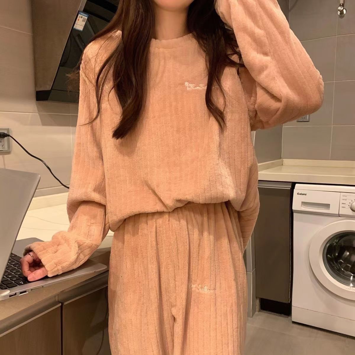 2025 가을, 겨울 산호 벨벳 잠옷 홈웨어 플란넬 대형 두꺼운 귀여운 패션 롱 가디건 여성용 세트