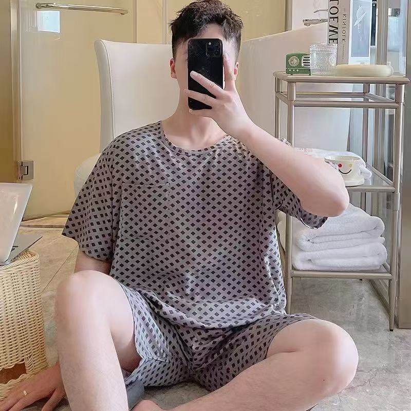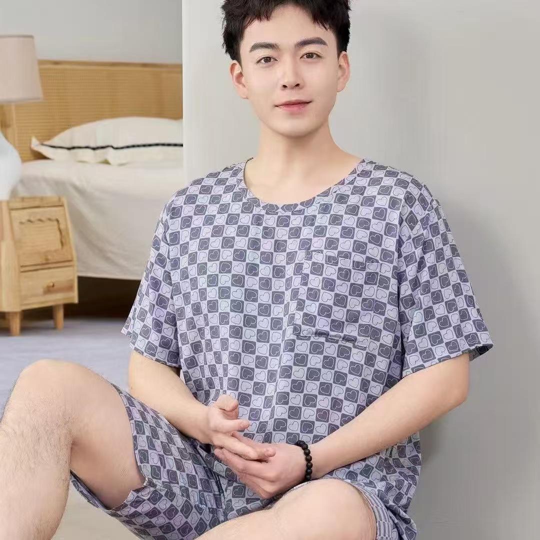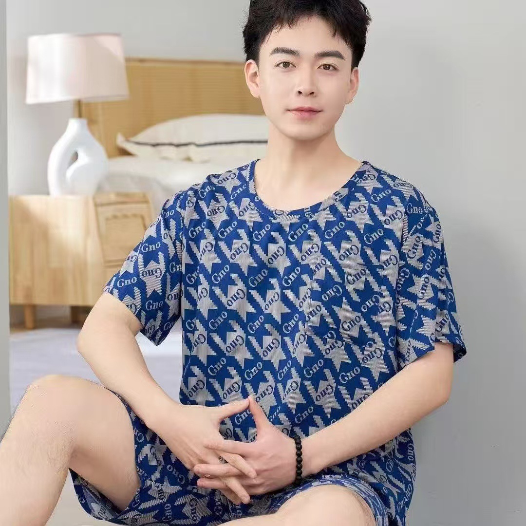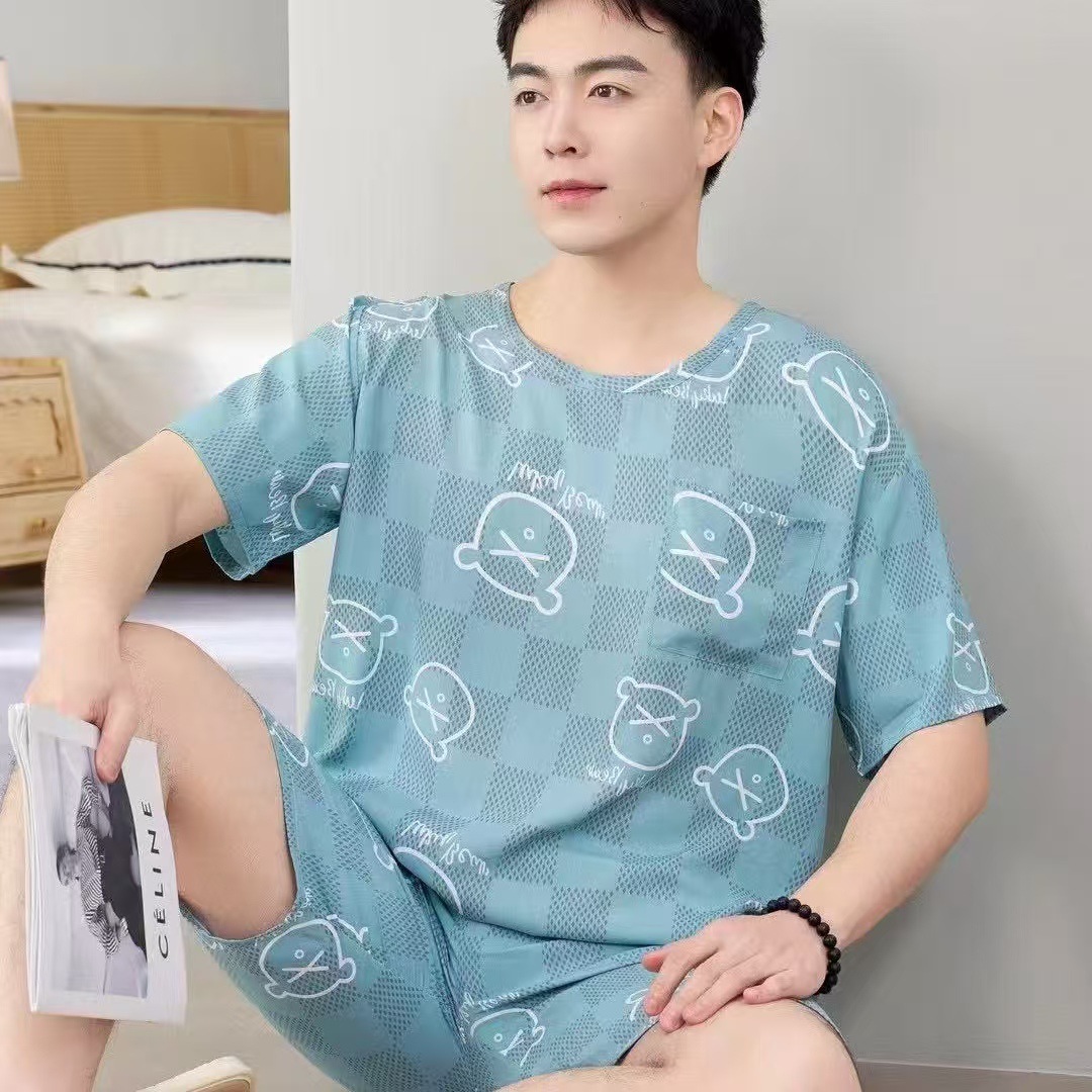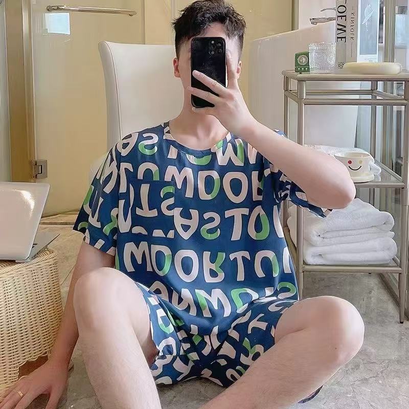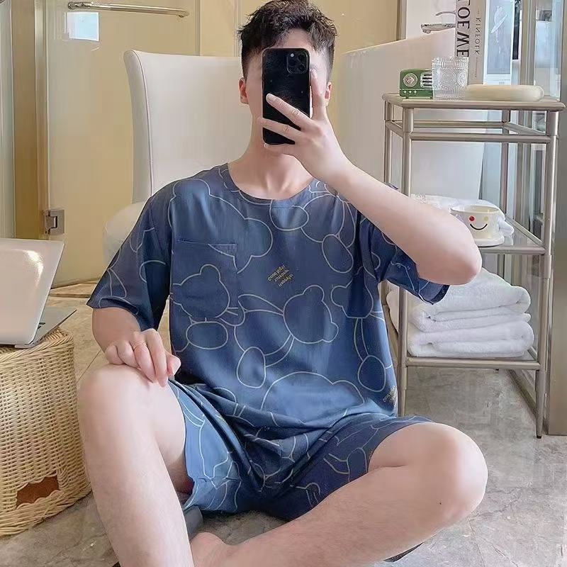 남성 잠옷, 면 실크, 여름 기질, 가정복, 얇은 반팔, 청소년 루즈한 대형 고등학생 정장스토어 가기