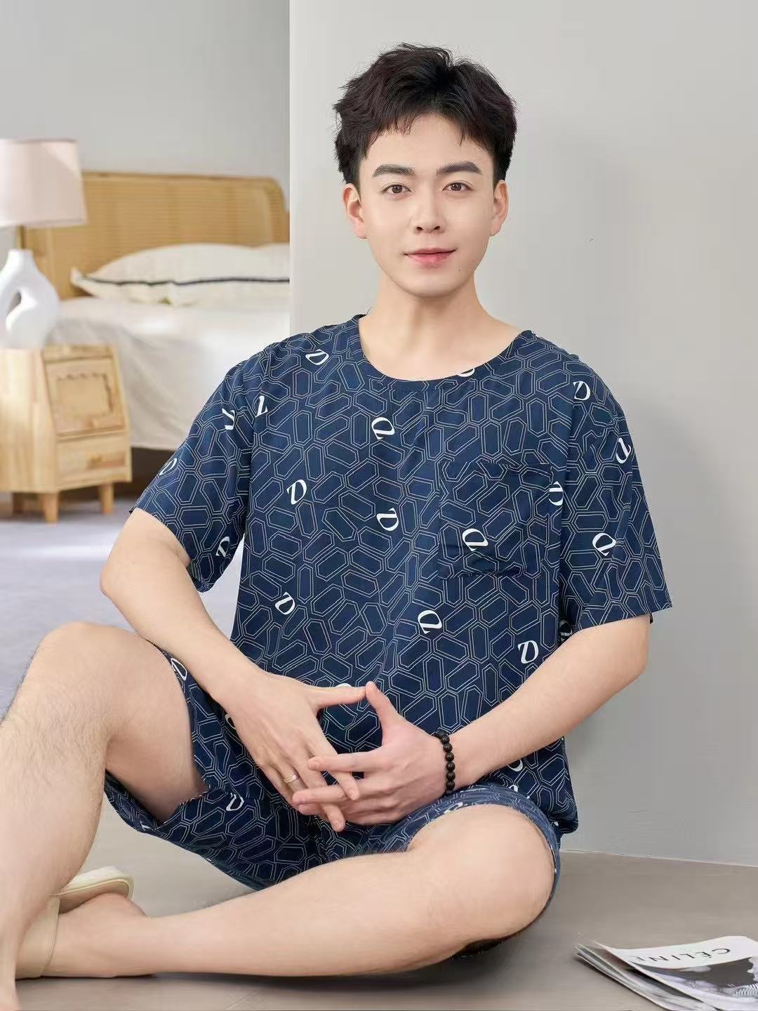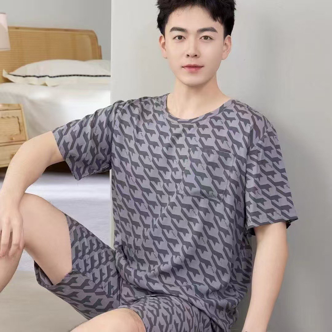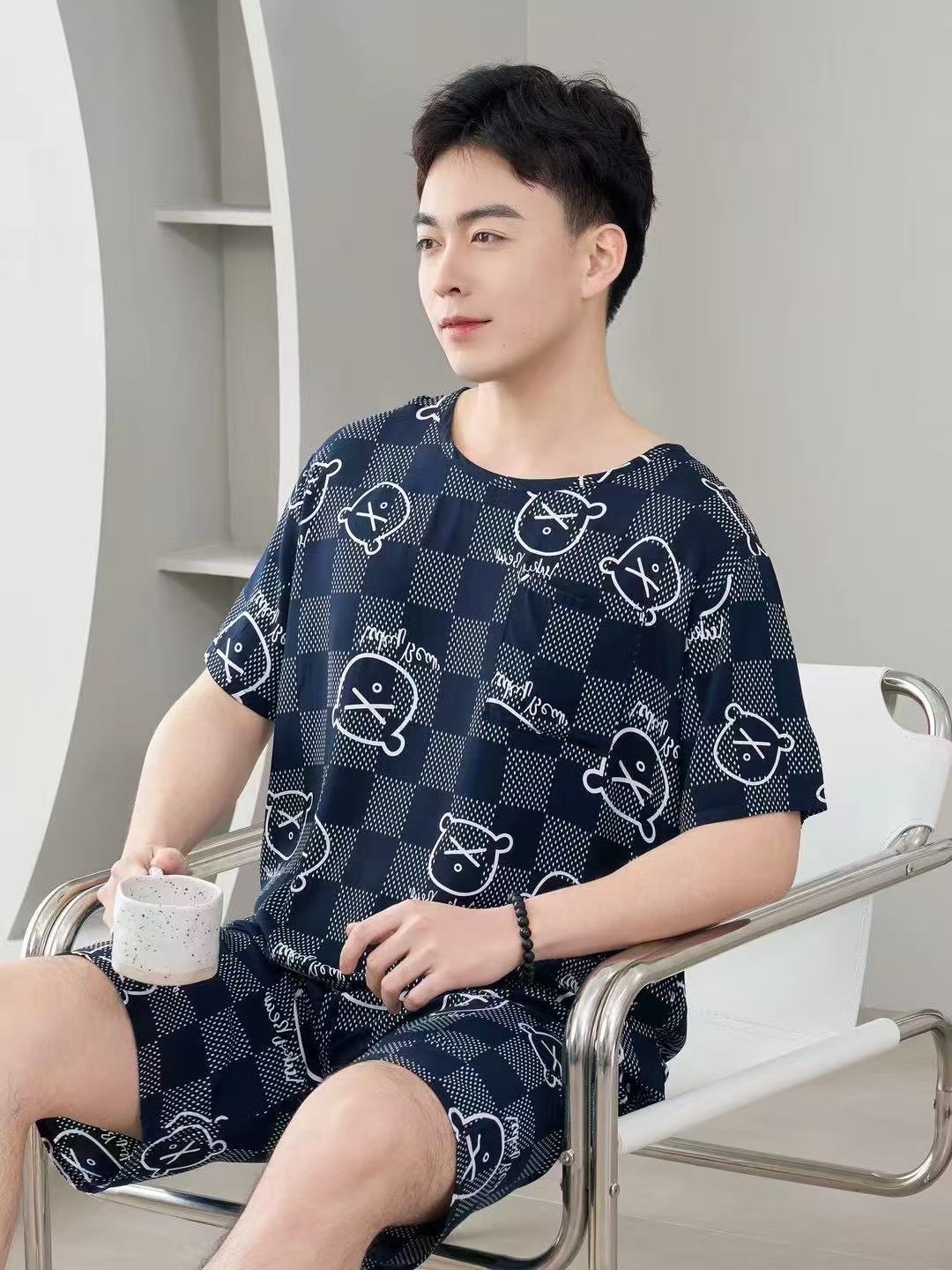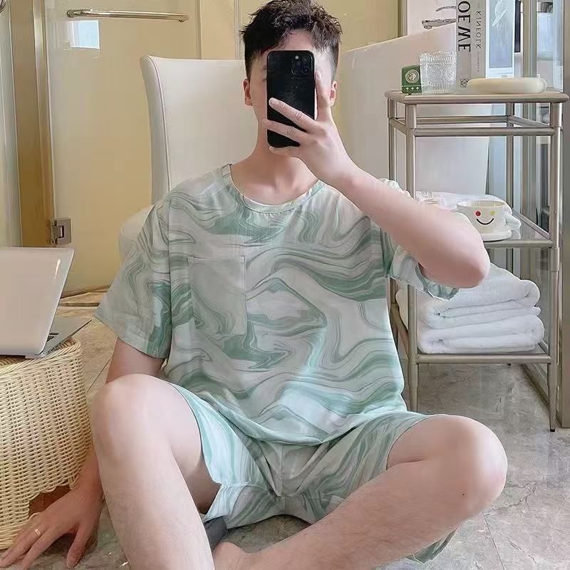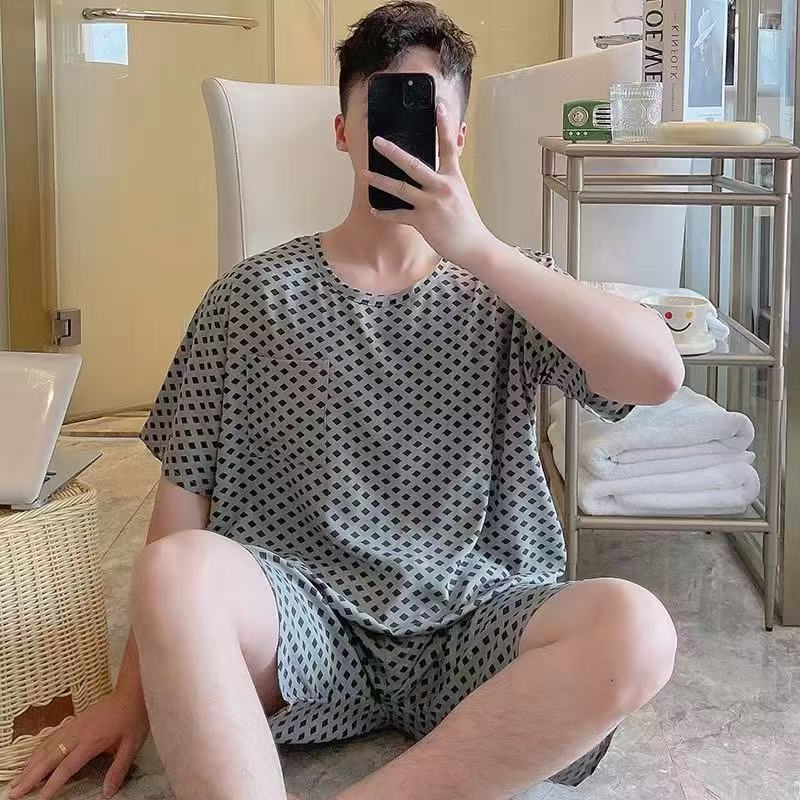 남성 잠옷, 면 실크, 여름 기질, 가정복, 얇은 반팔, 청소년 루즈한 대형 고등학생 정장스토어 가기