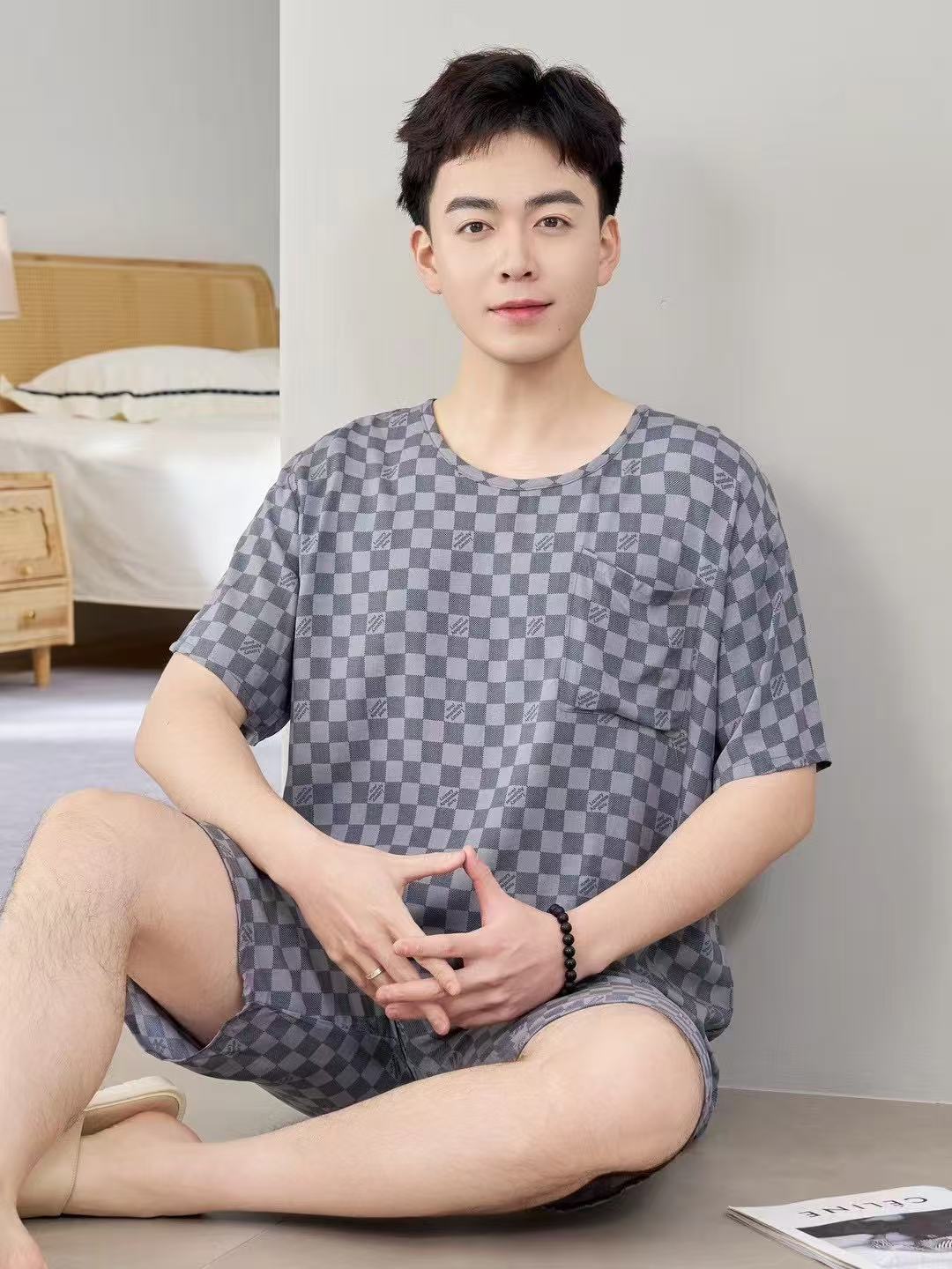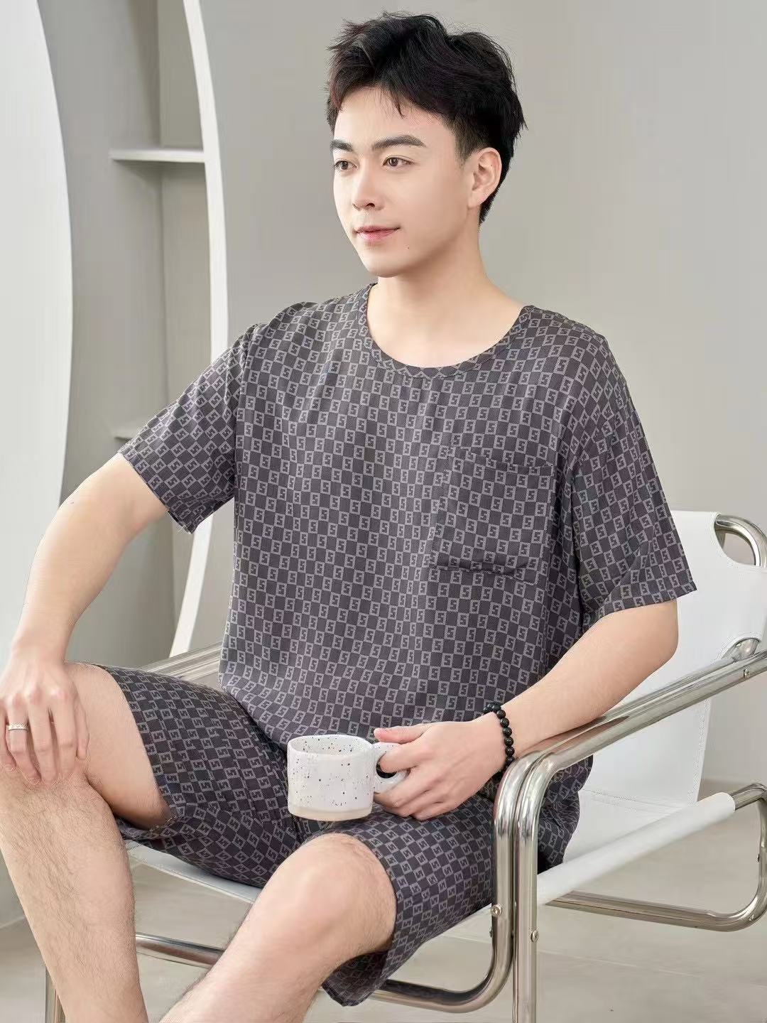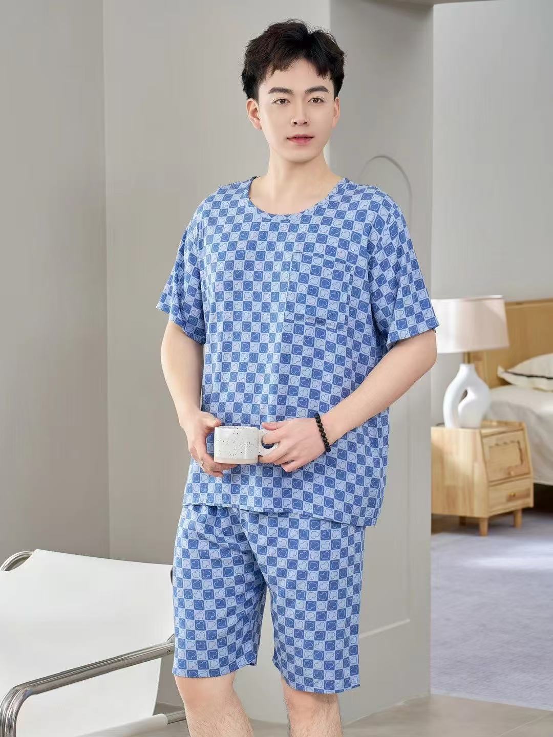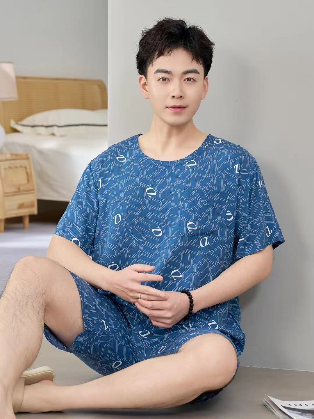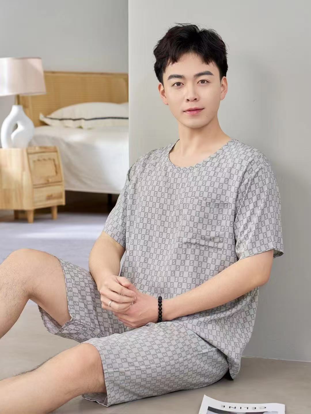 남성 잠옷, 면 실크, 여름 기질, 가정복, 얇은 반팔, 청소년 루즈한 대형 고등학생 정장스토어 가기