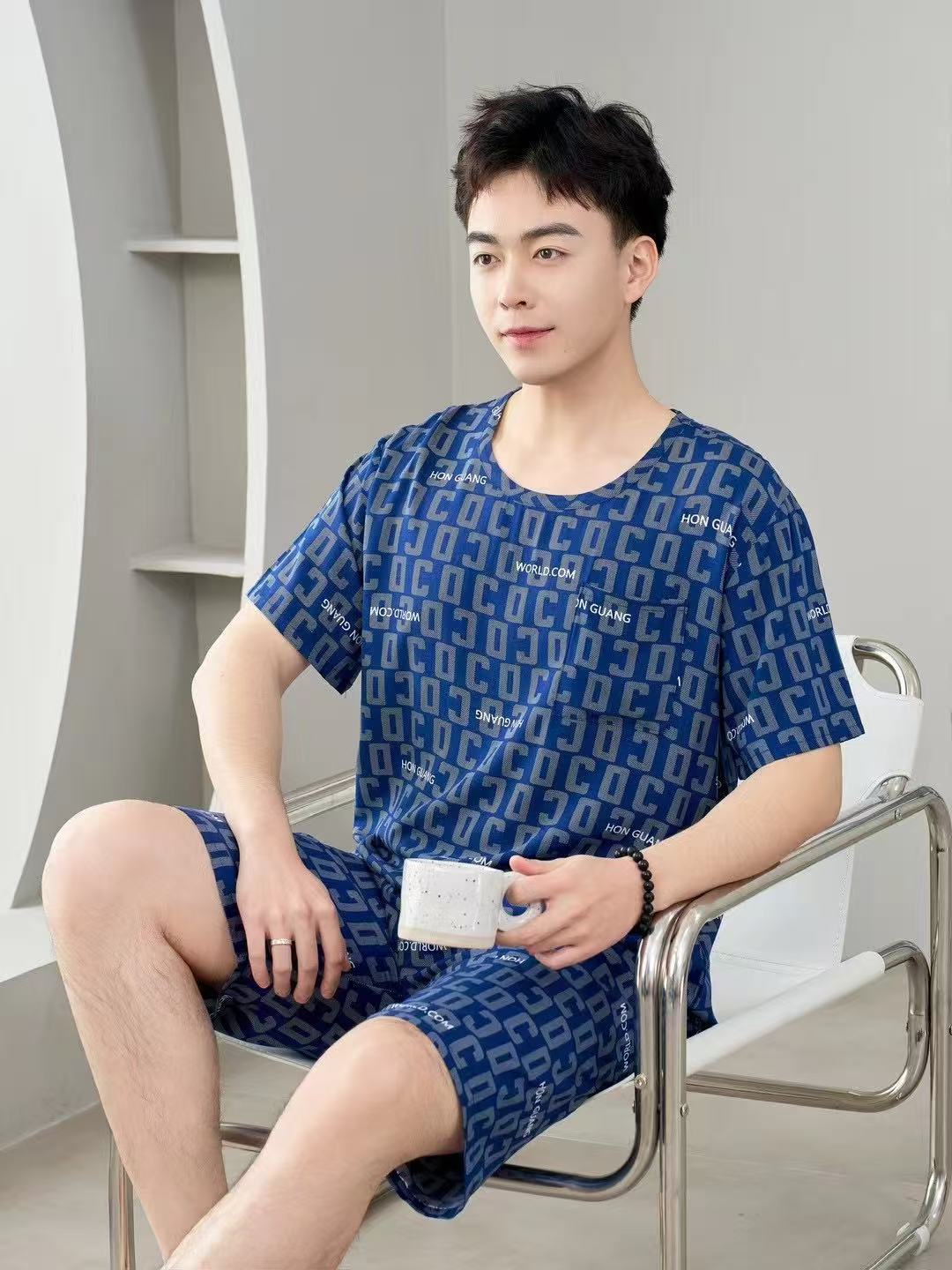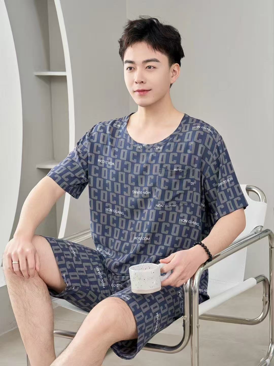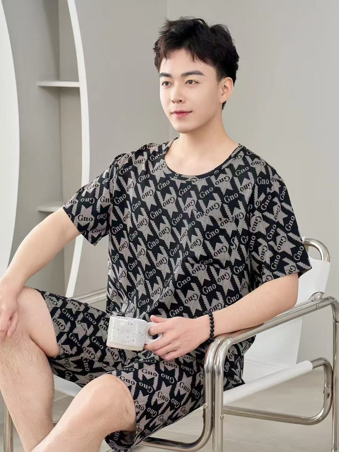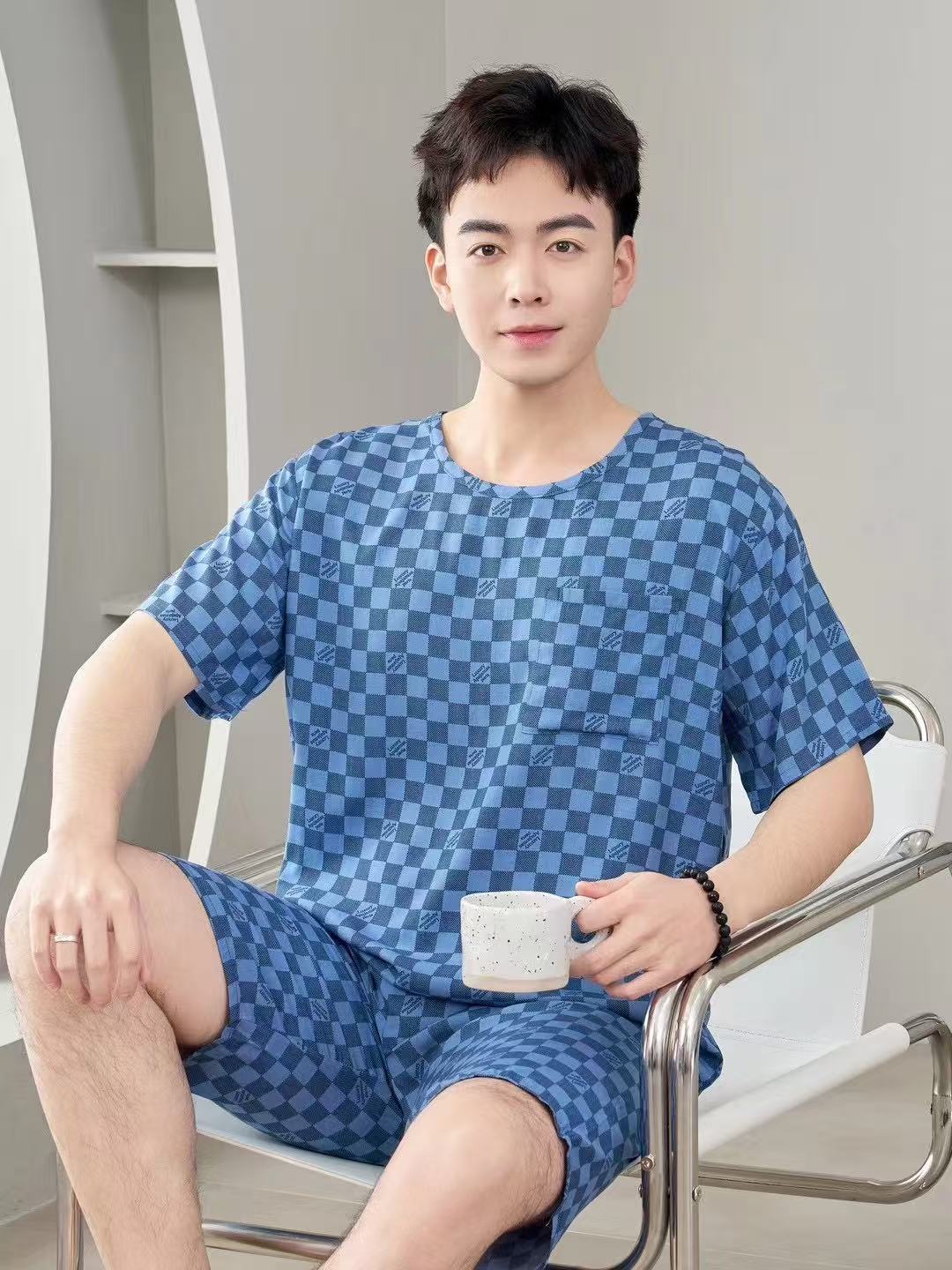 남성 잠옷, 면 실크, 여름 기질, 가정복, 얇은 반팔, 청소년 루즈한 대형 고등학생 정장스토어 가기
