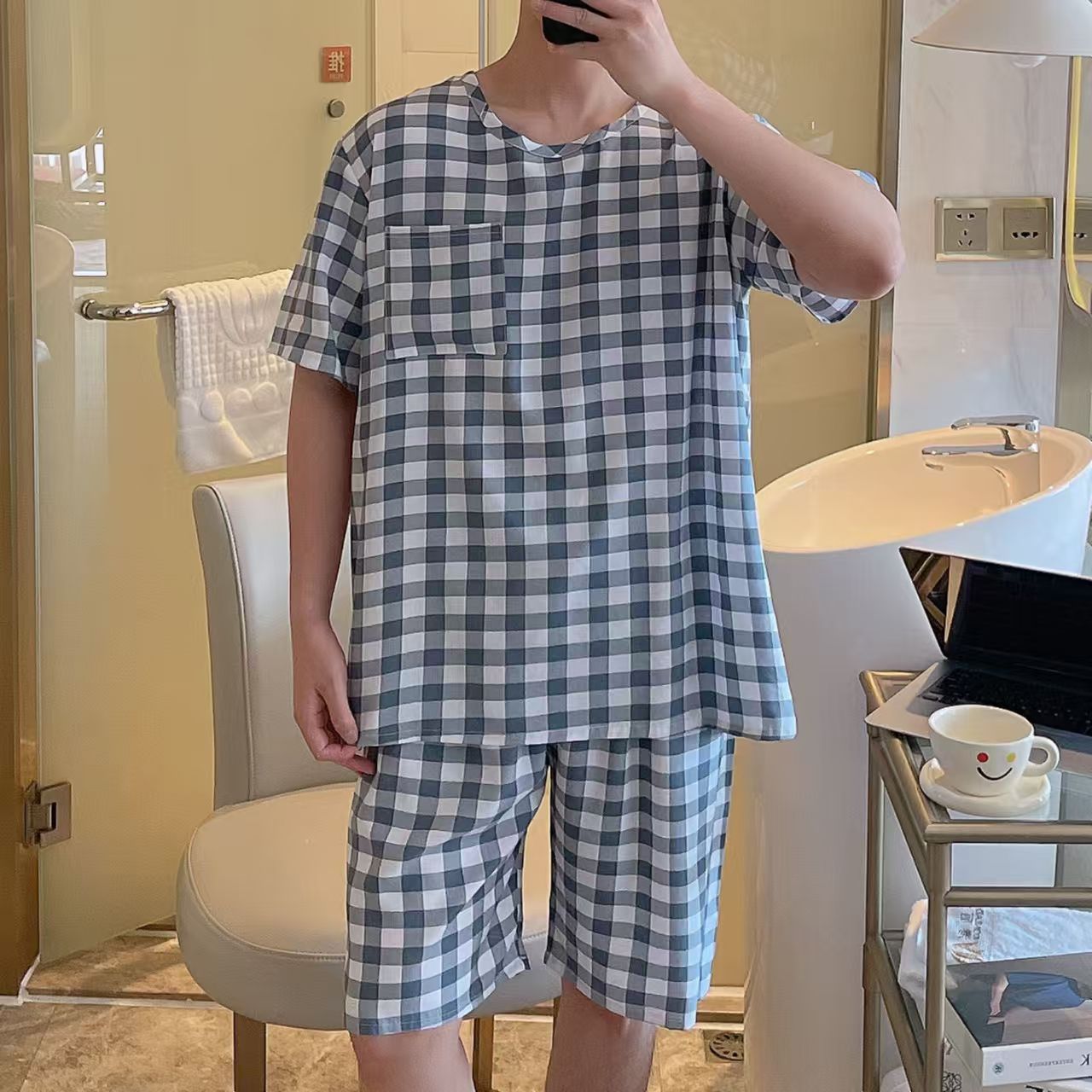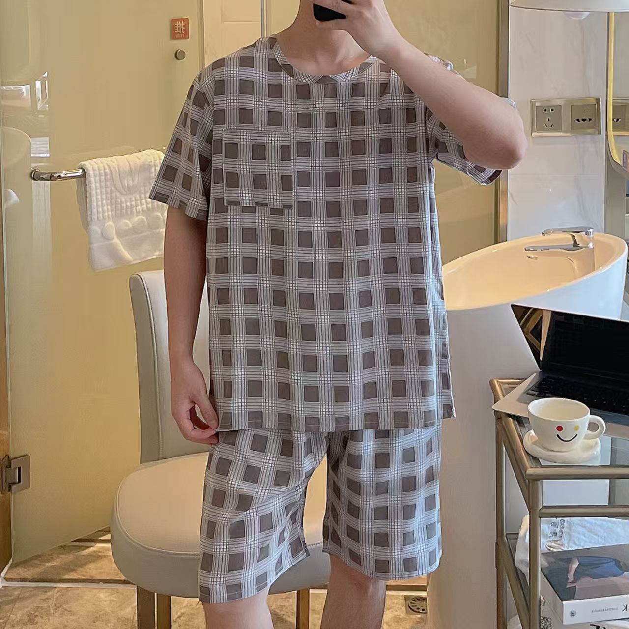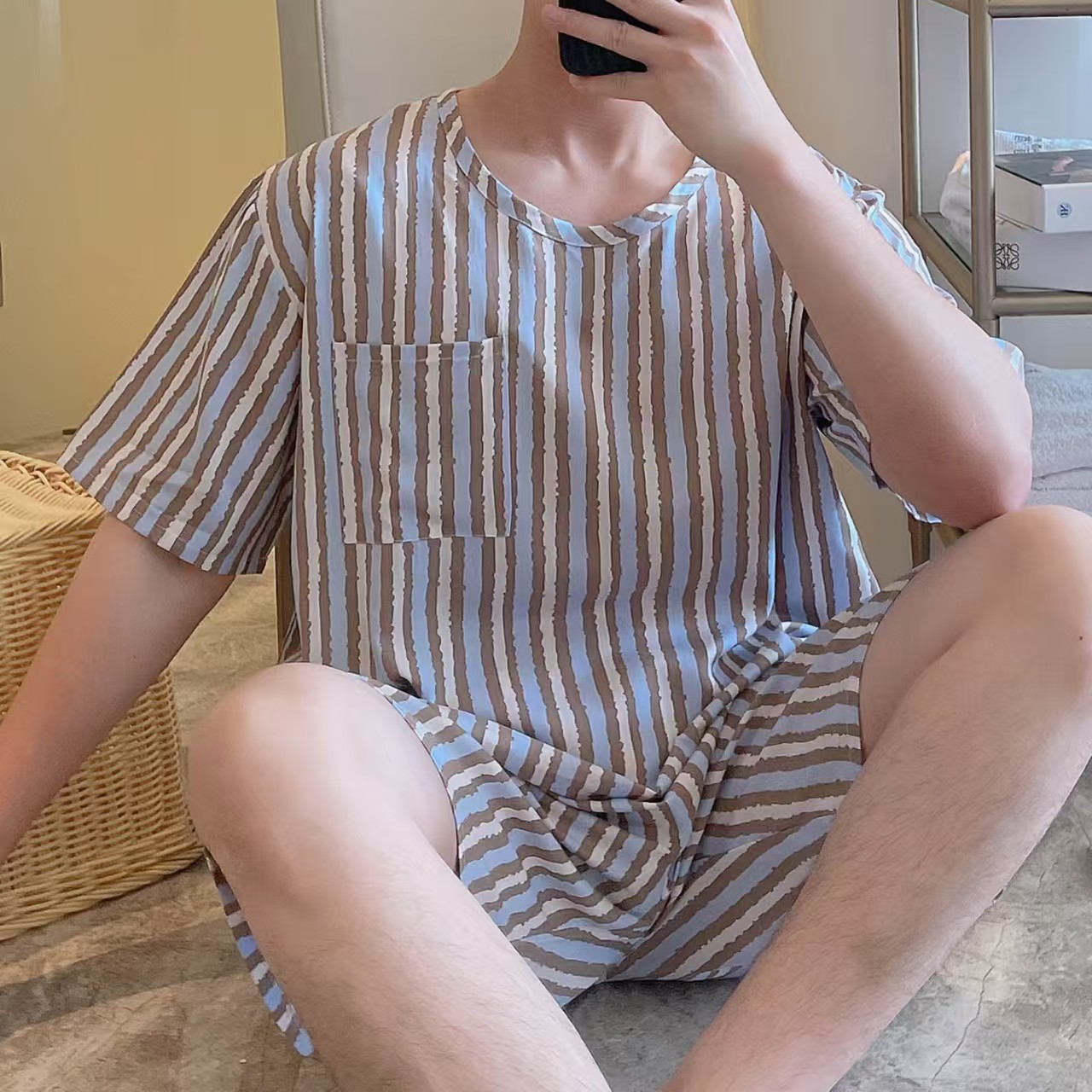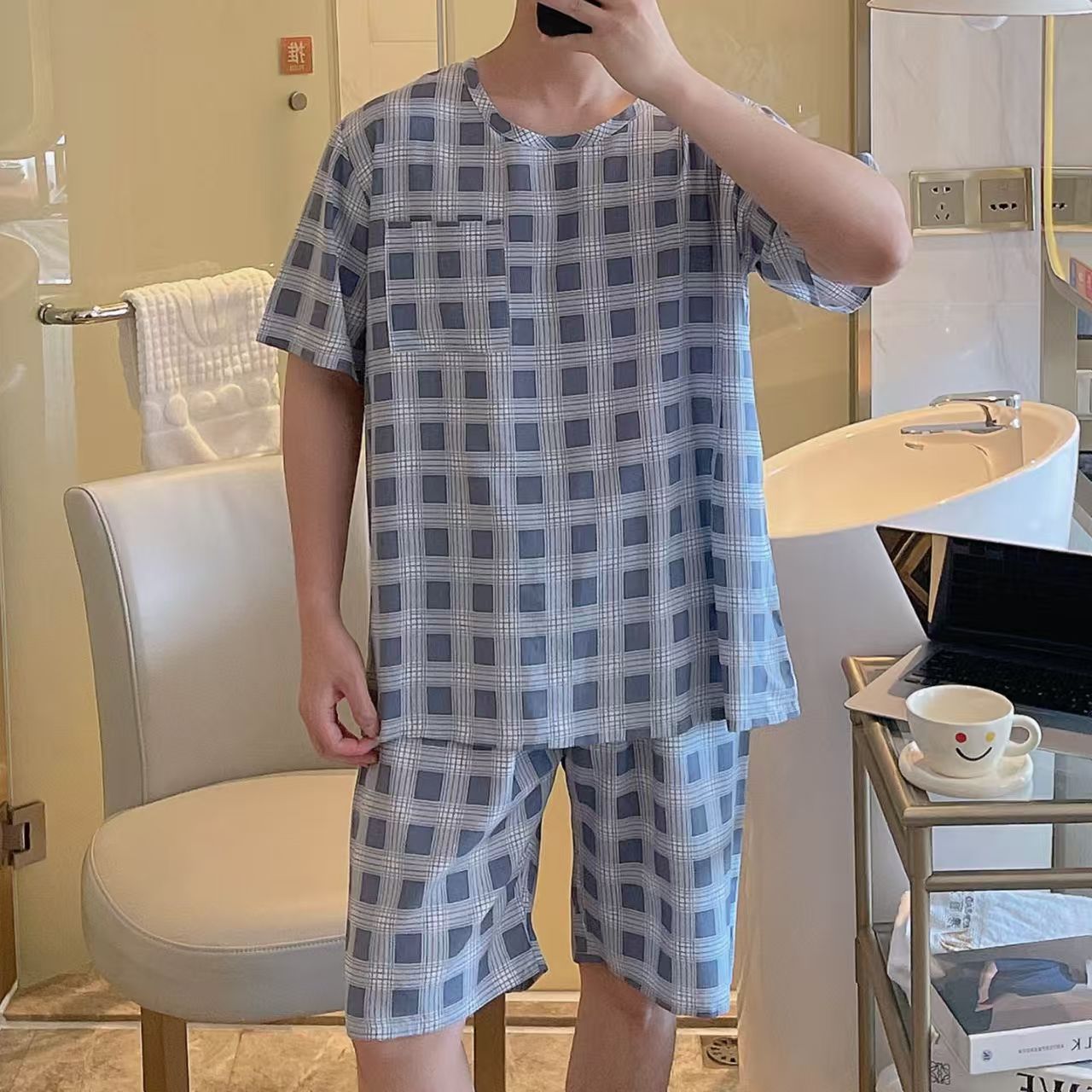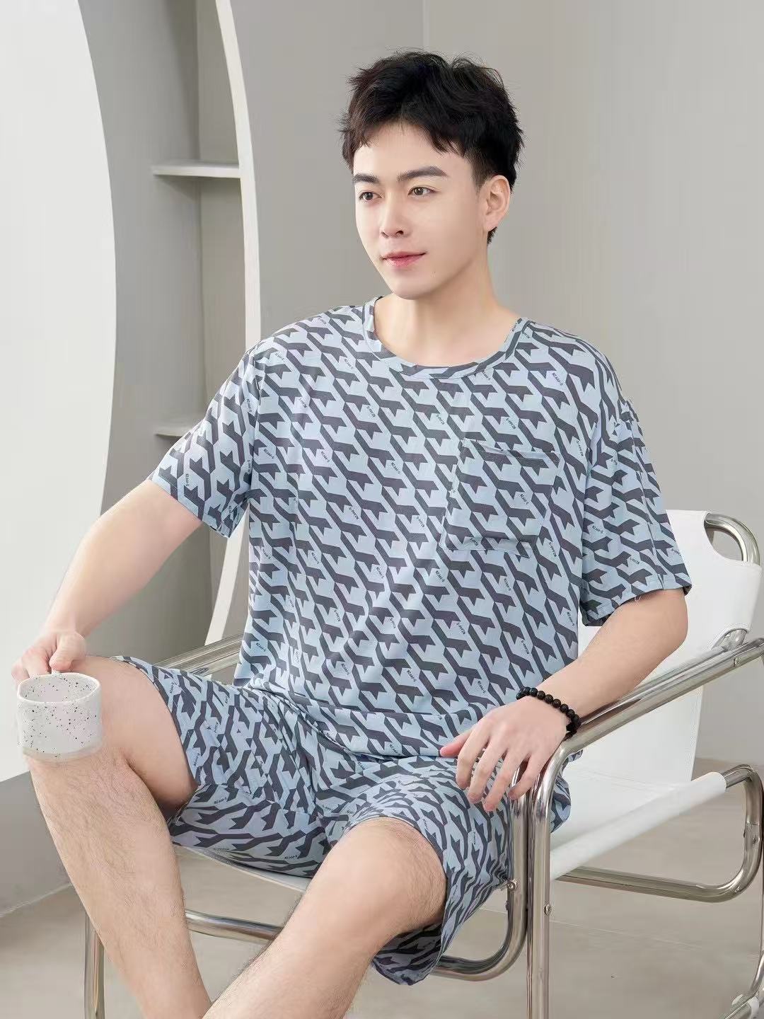 남성 잠옷, 면 실크, 여름 기질, 가정복, 얇은 반팔, 청소년 루즈한 대형 고등학생 정장스토어 가기