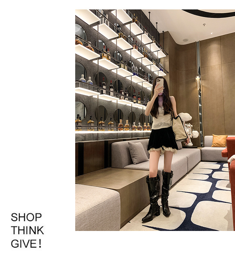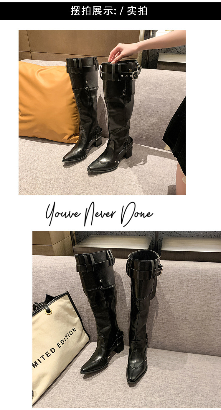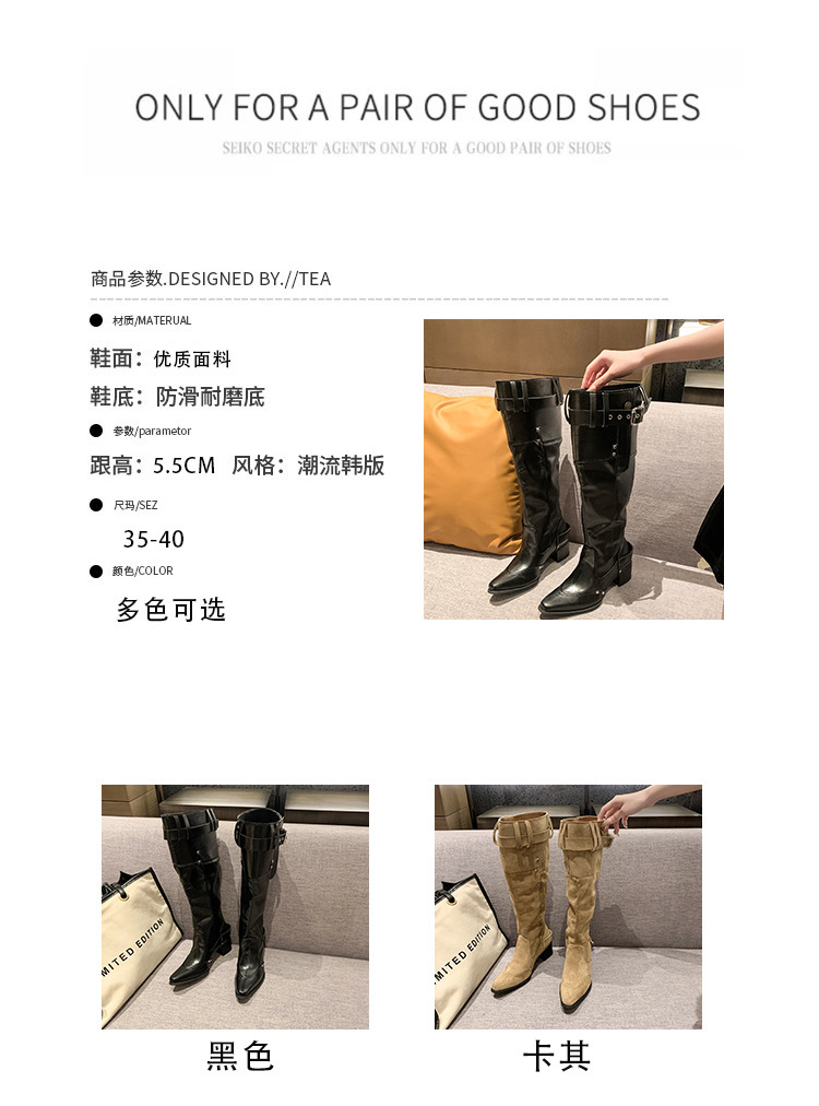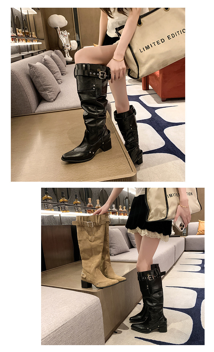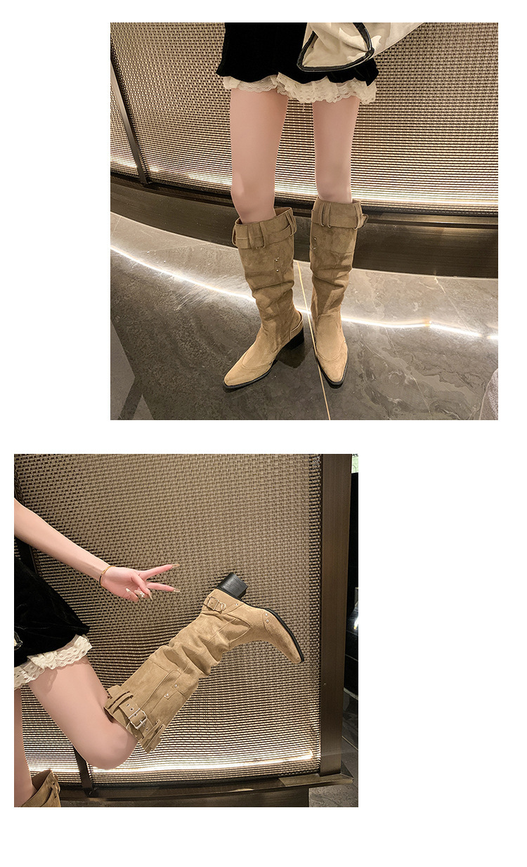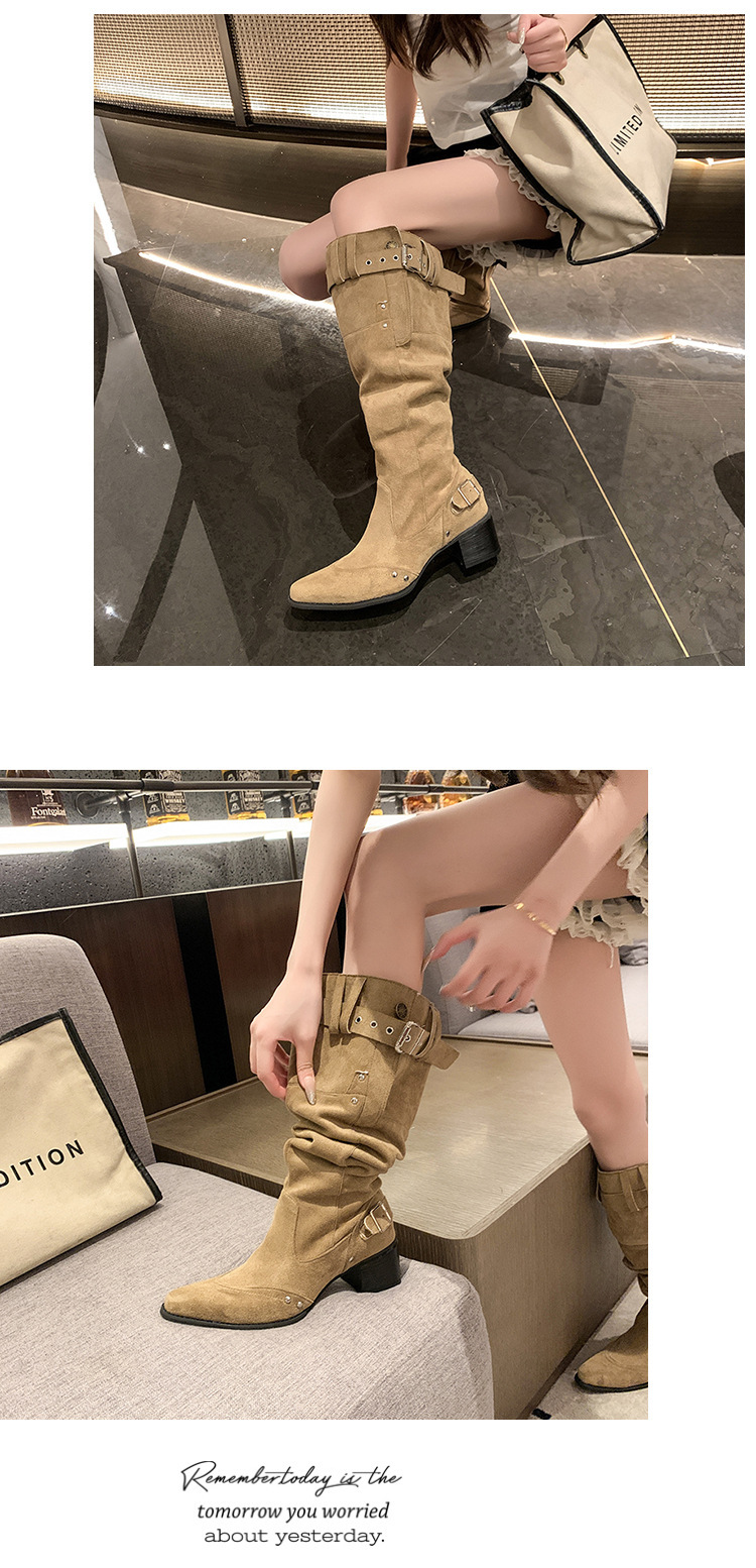 여성용 무릎 부츠 2025 봄, 가을 살구 스웨이드 포인티드 부츠 여성용 두꺼운 굽 슬리밍 플리츠 부츠스토어 가기