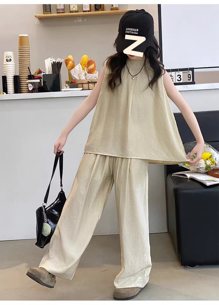 여자 여름 얇은 조끼 정장 2025 새로운 스타일 중대형 어린이 유행 티셔츠 바지 한국 스타일 투피스 세트