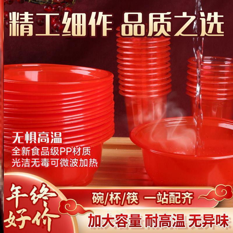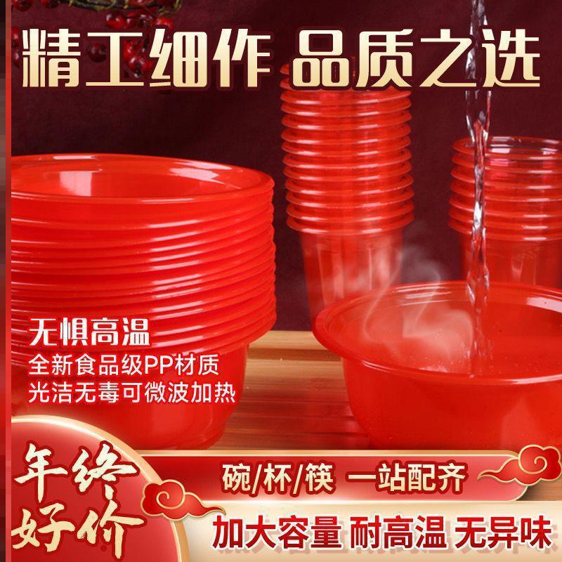 일회용 빨간색 축제 그릇 대용량 결혼식 연회 가정용 플라스틱 두꺼운 식기 둥근 그릇 전체 상자스토어 가기