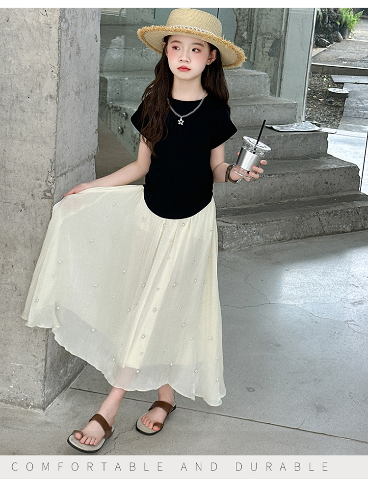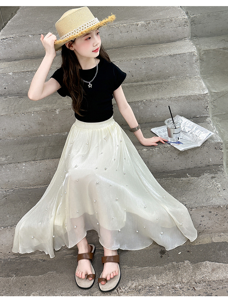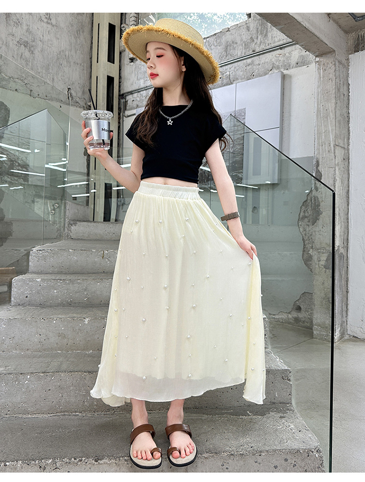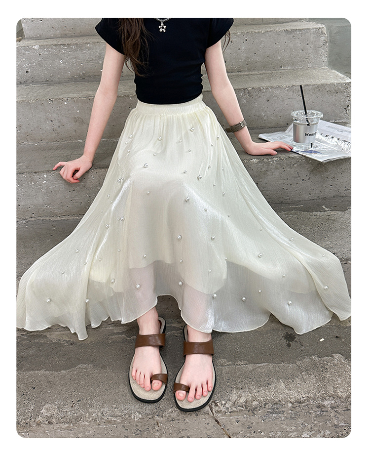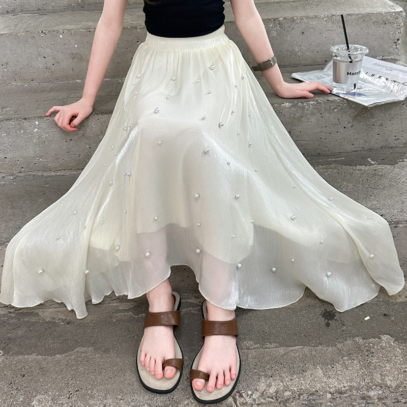 여자 프릴 구슬 스커트 여름 드레스 2025 새로운 스타일 어린 소녀 유행 높은 허리 중간 길이 슈퍼 요정 스커트